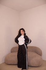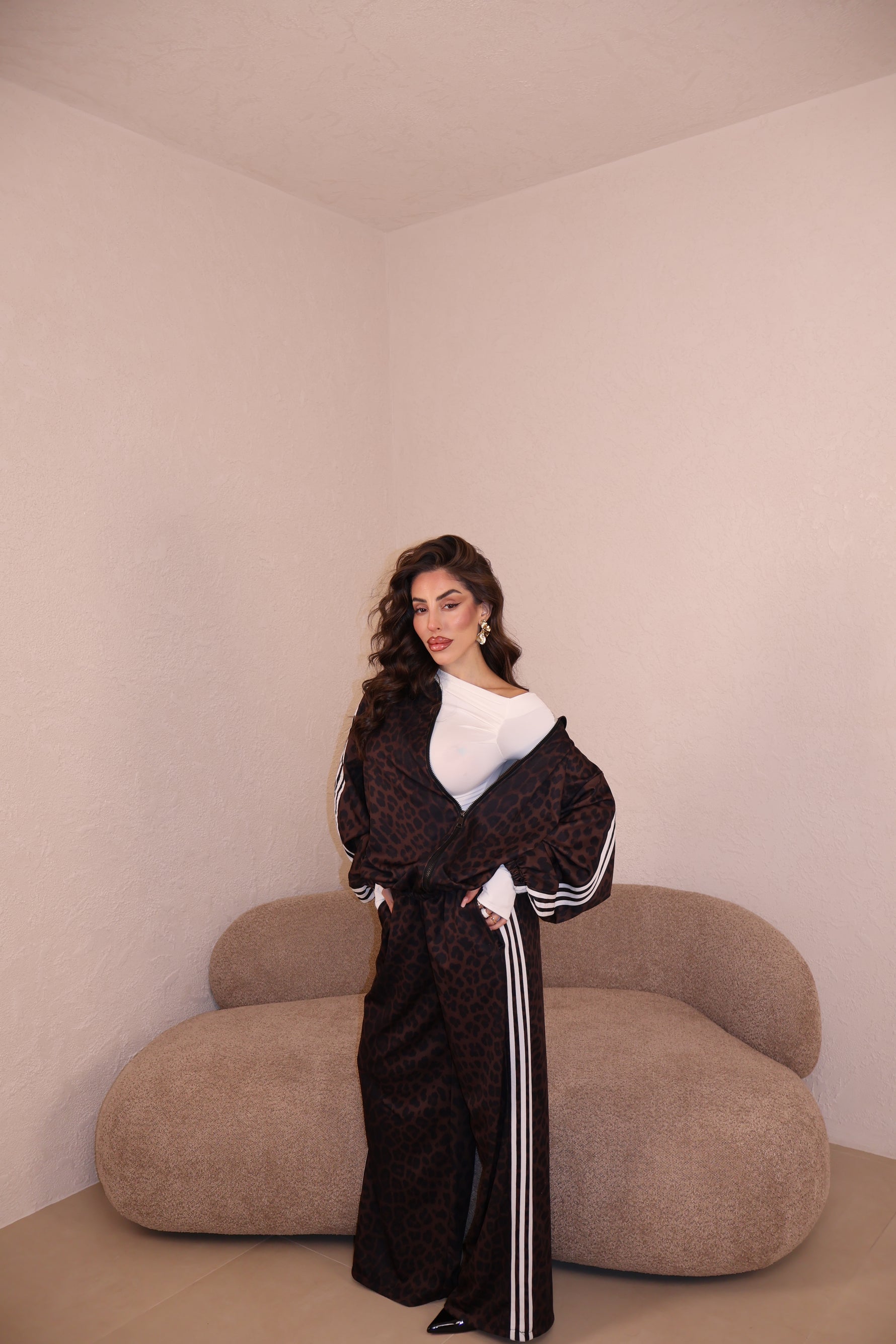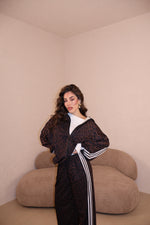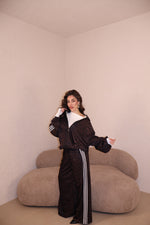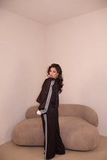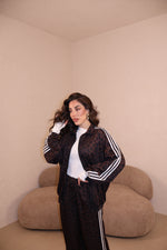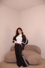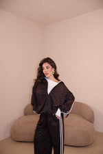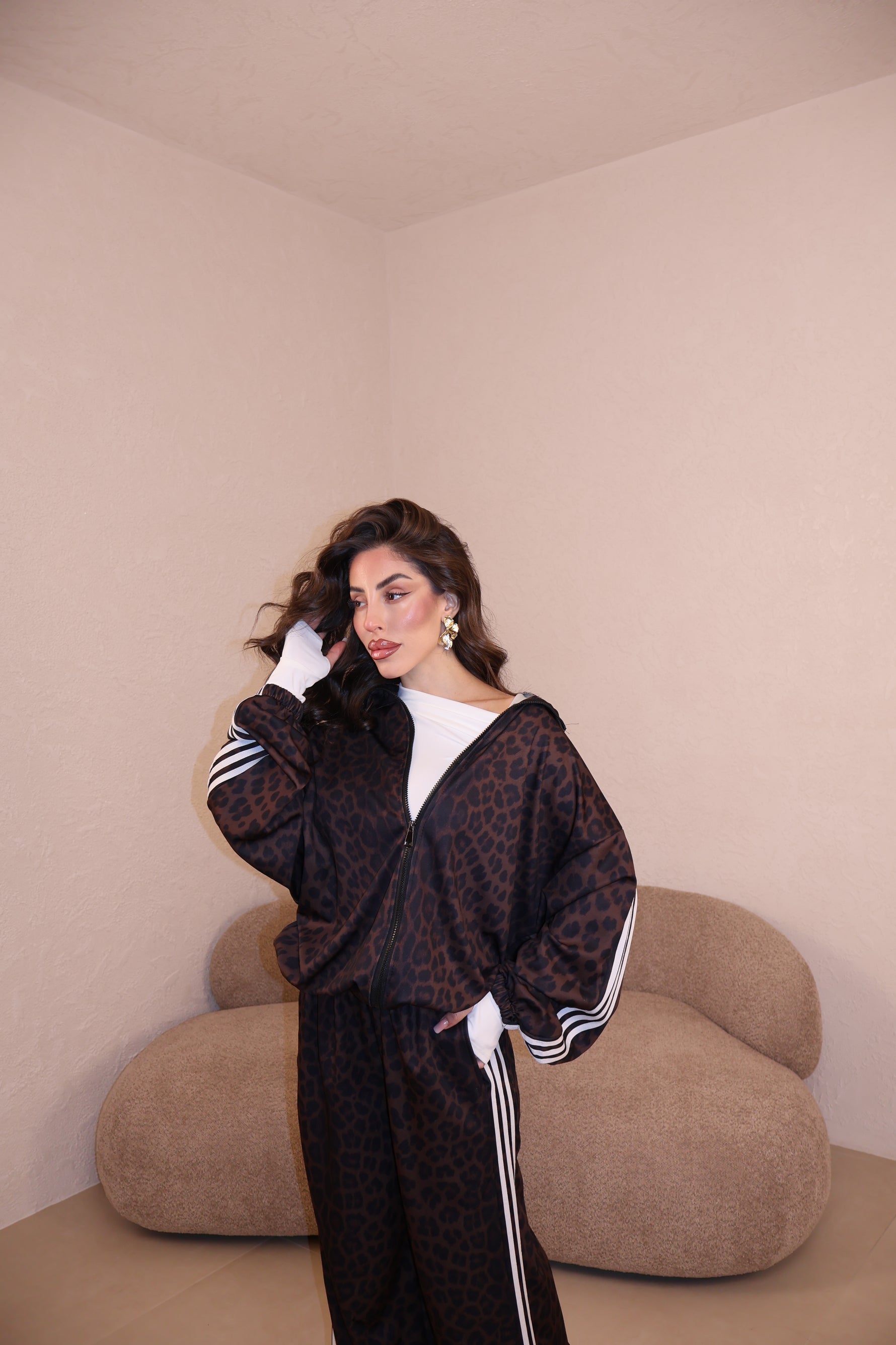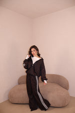 Coordinato di tuta nel tessuto acetato composto da pantaloni morbidi con elastico in vita e felpa over con cerniera. Bande a contrasto. Taglia unica.