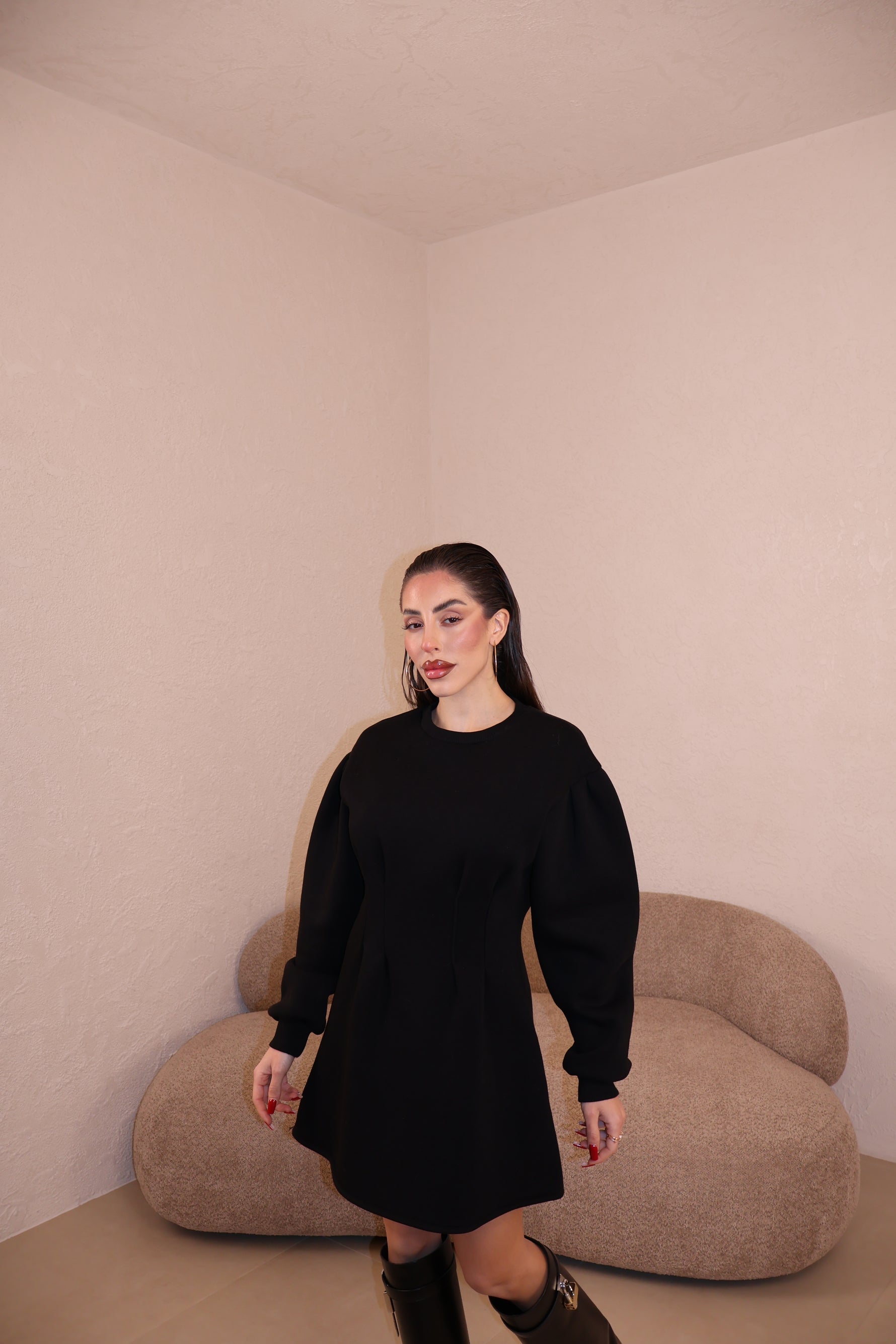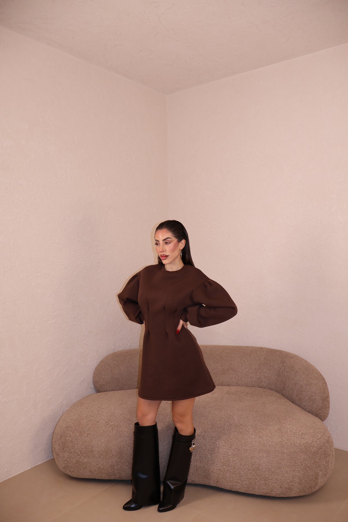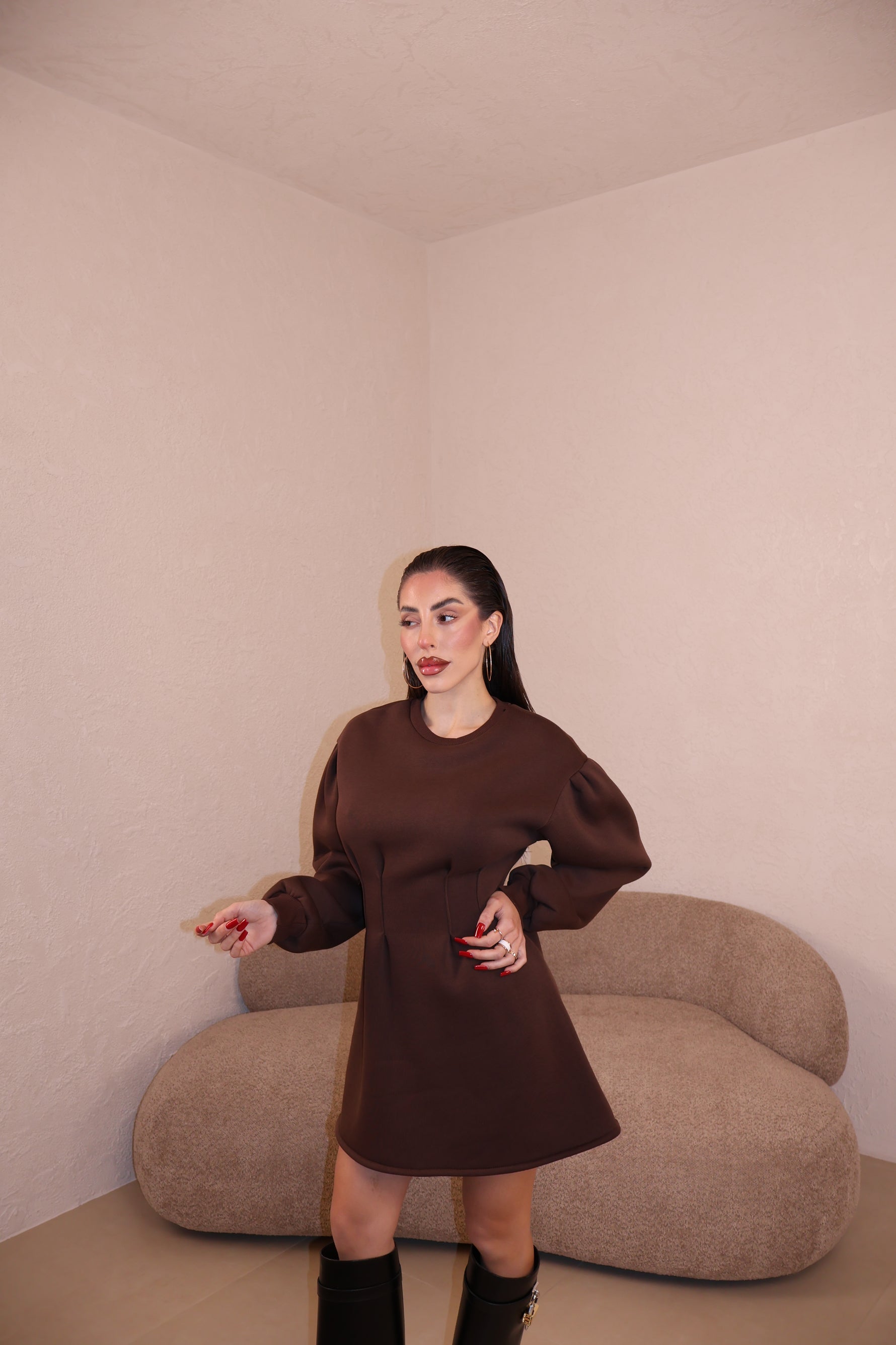 Abito felpato con pince in vita e maniche leggermente a sbuffo. Taglia unica.