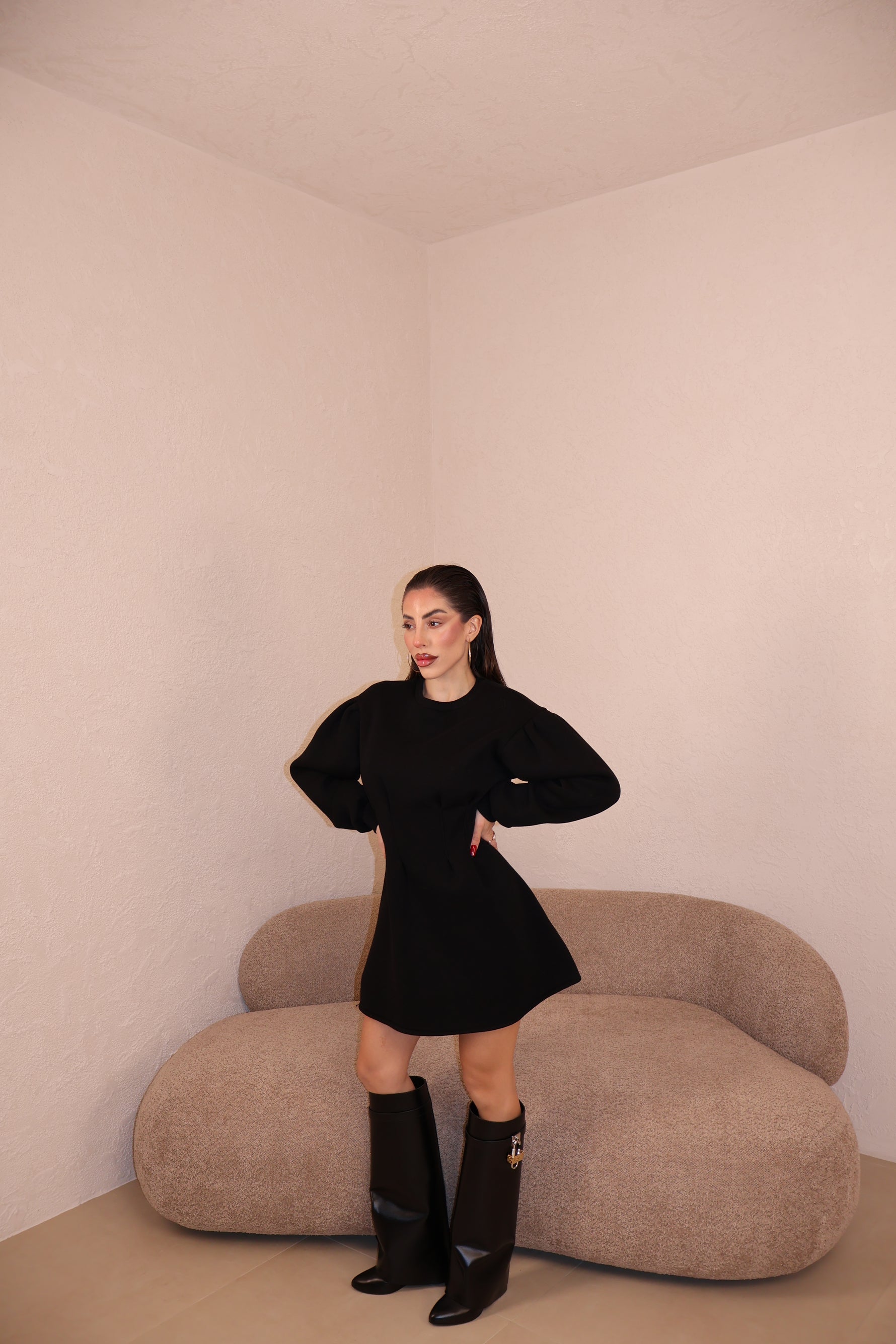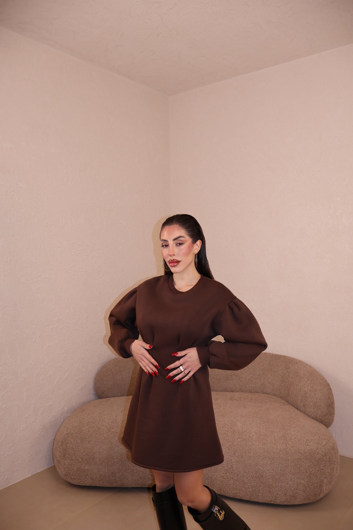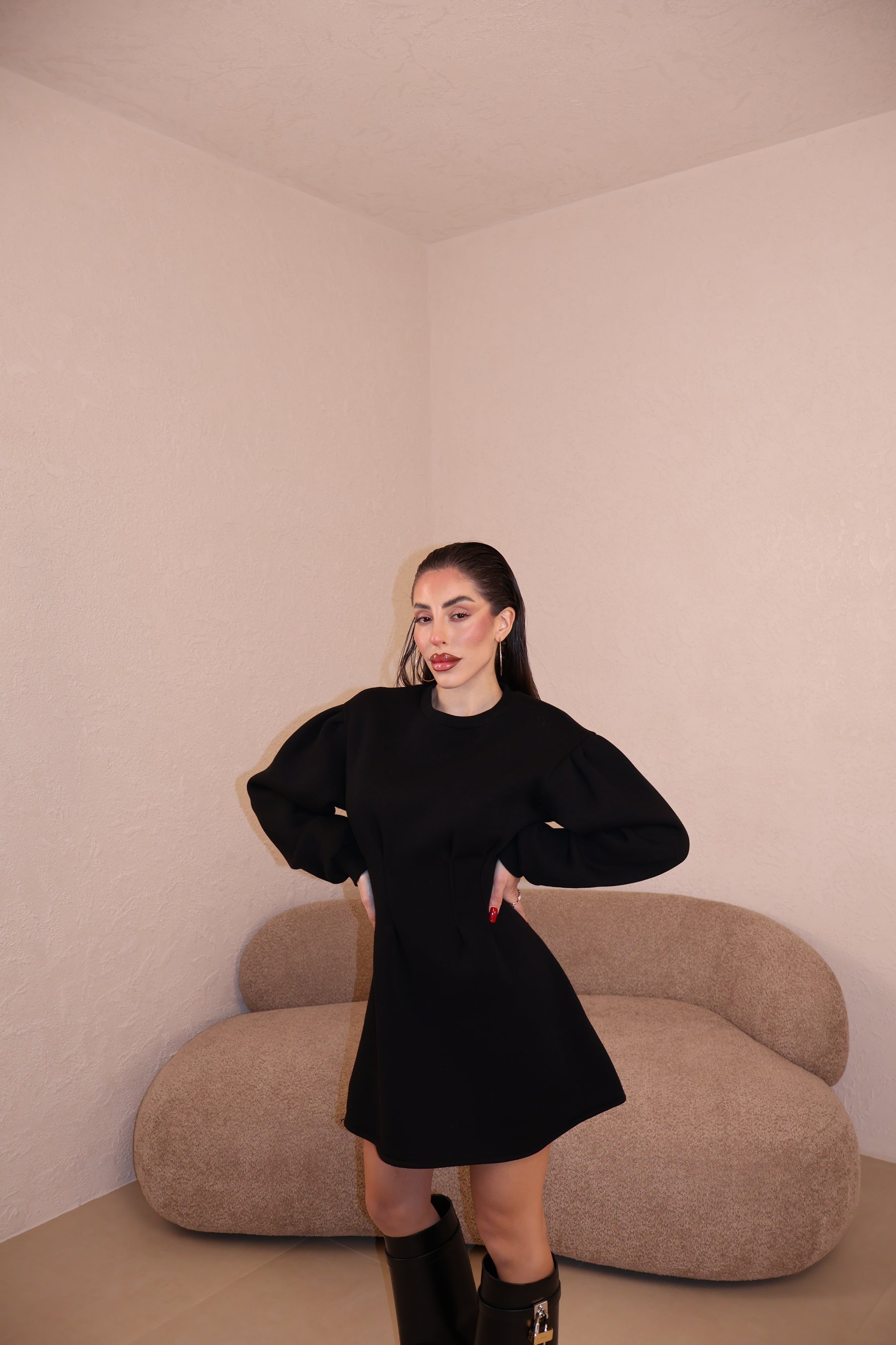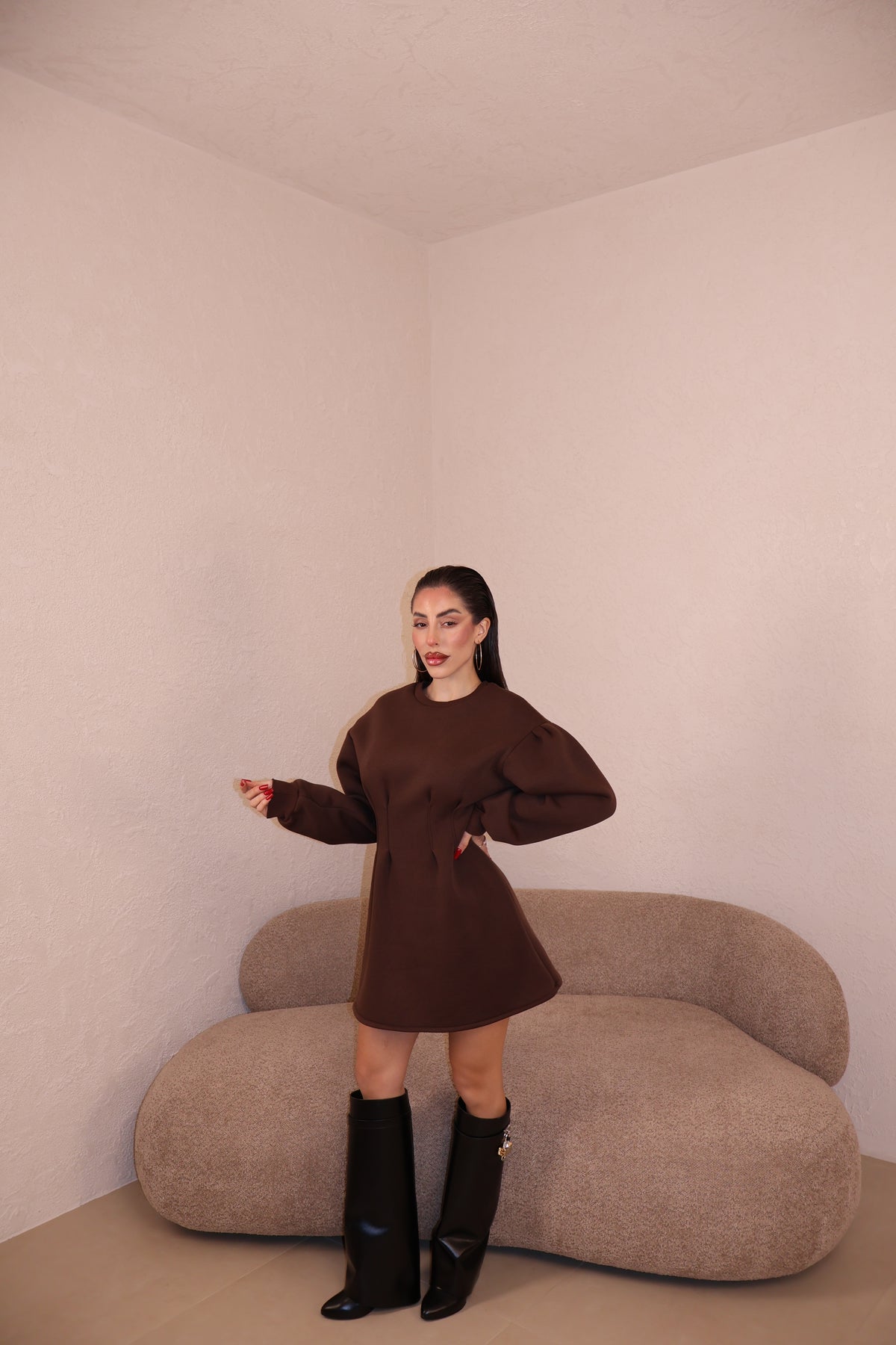 Abito felpato con pince in vita e maniche leggermente a sbuffo. Taglia unica.