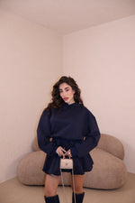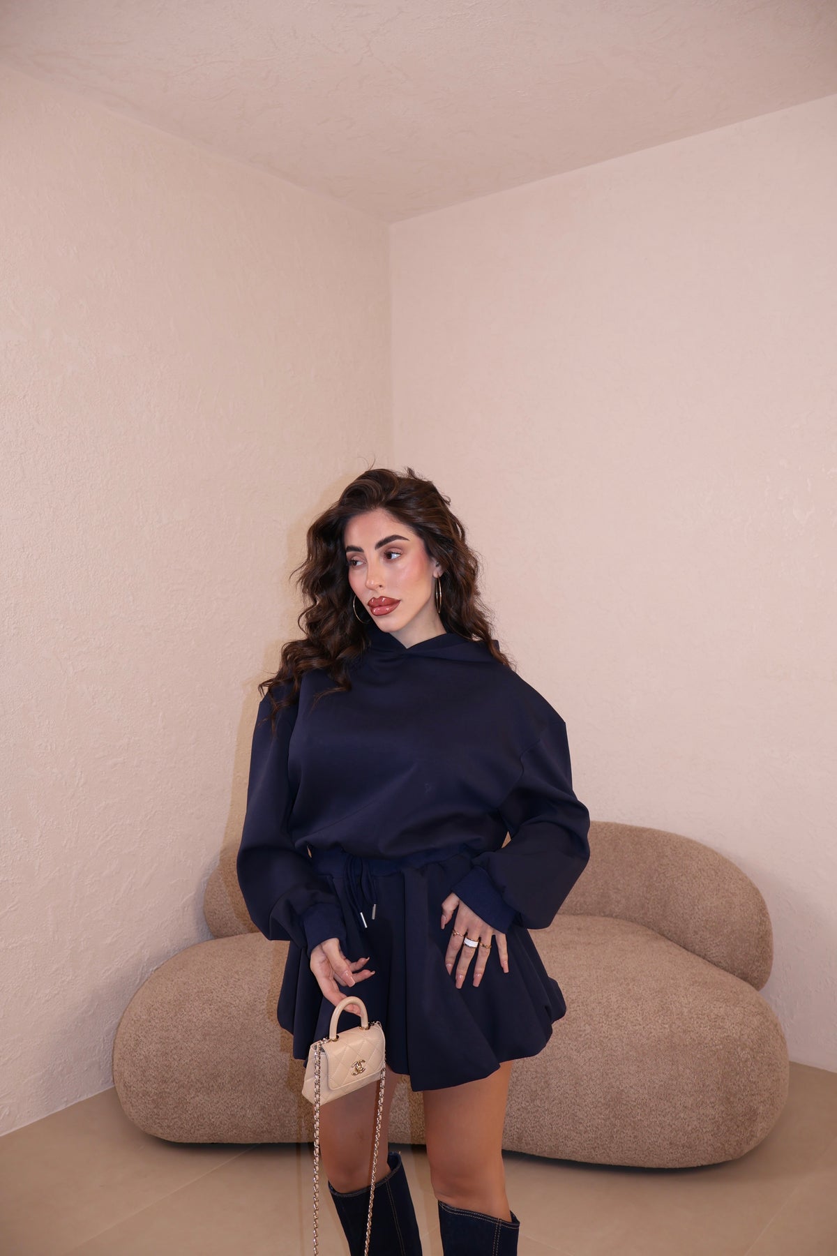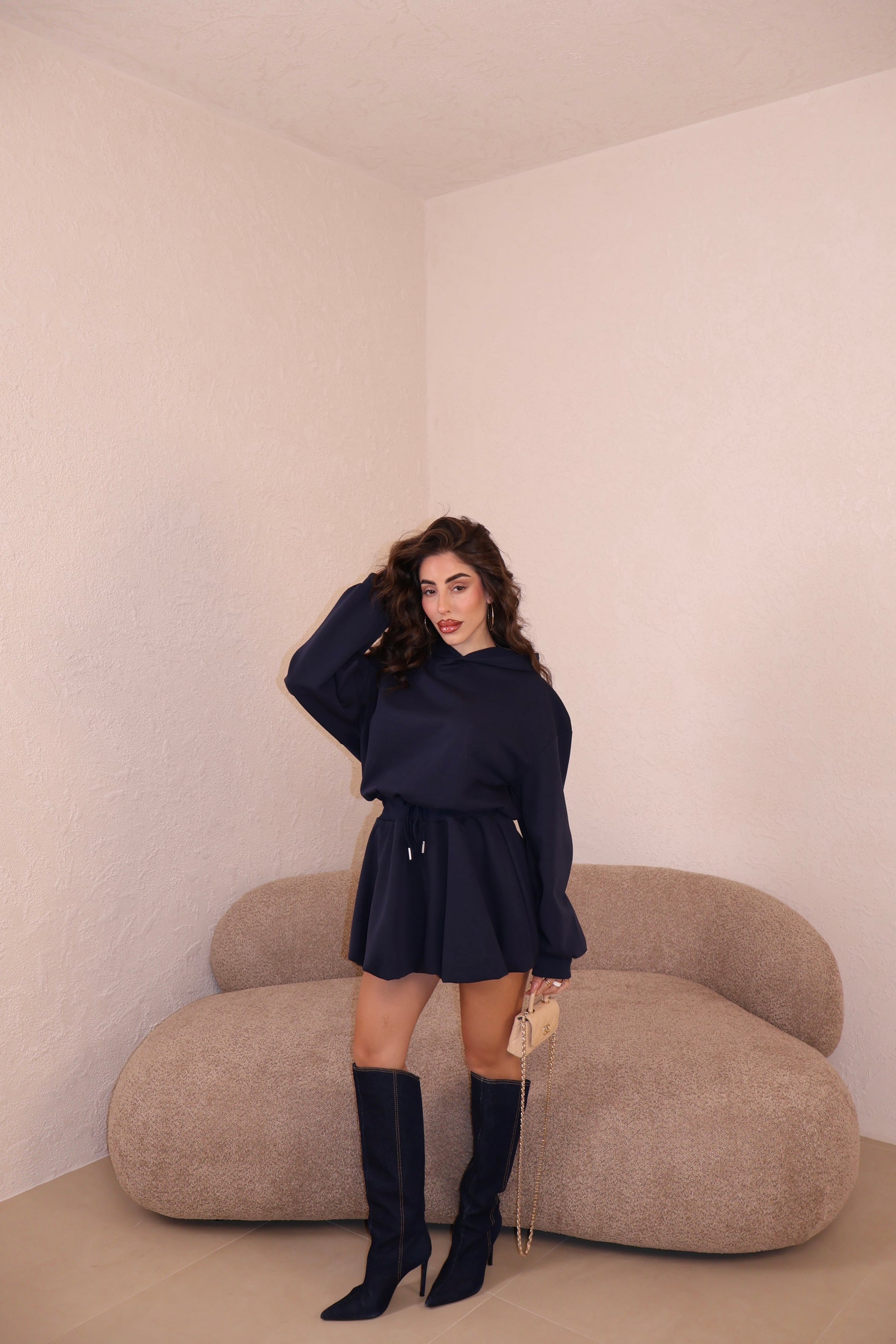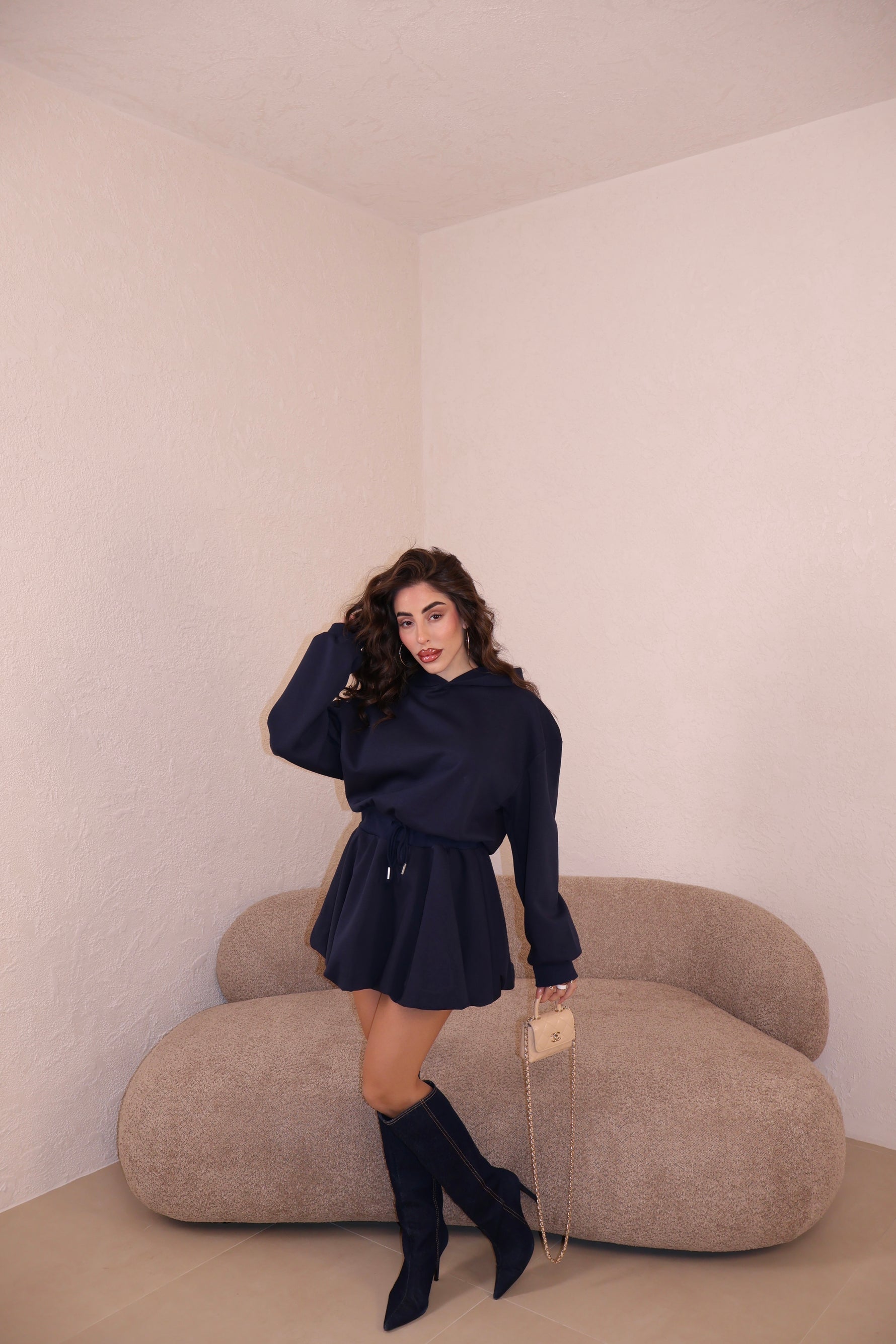 Abito in felpa con gonna a palloncino regolabile in vita e cappuccio. Taglia unica.