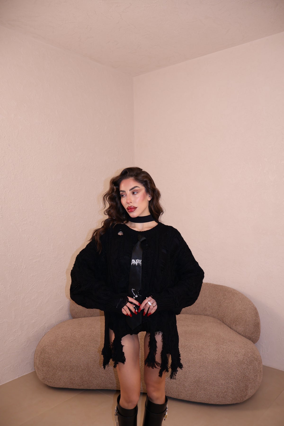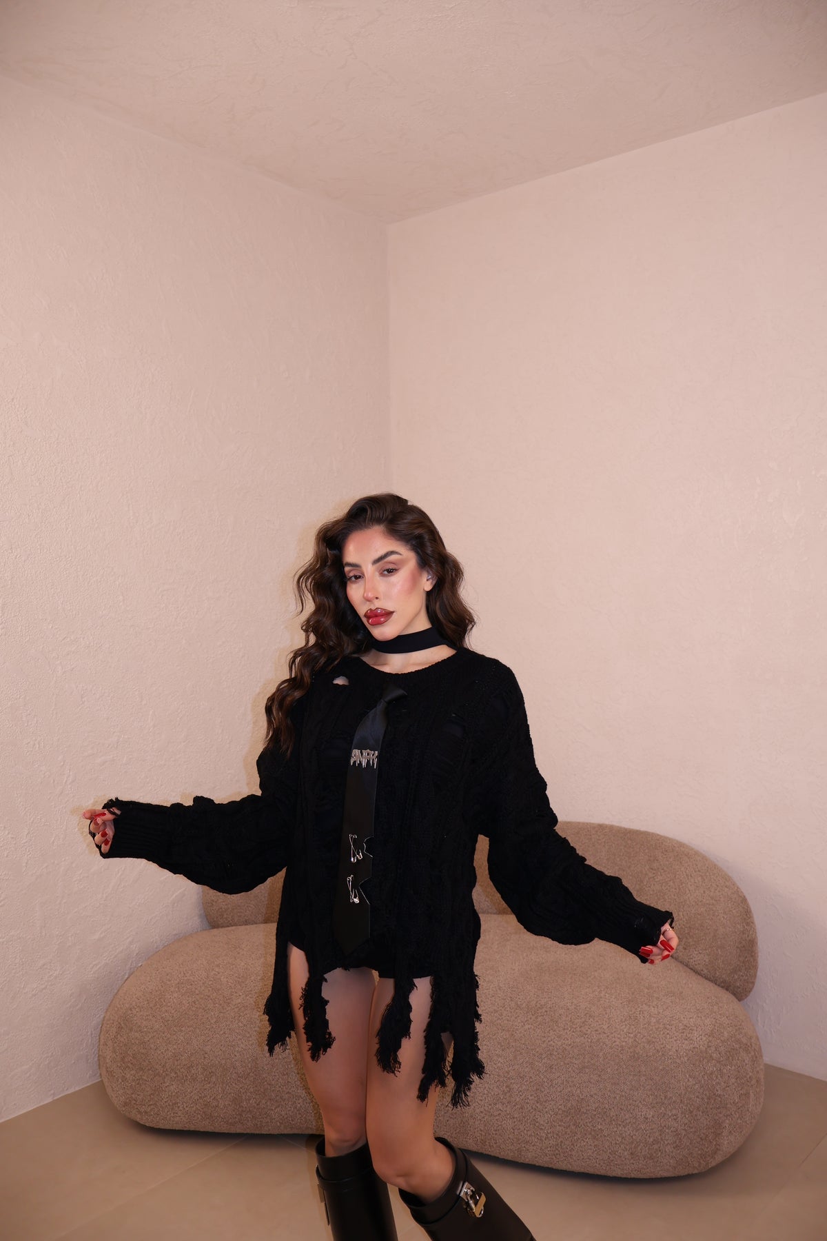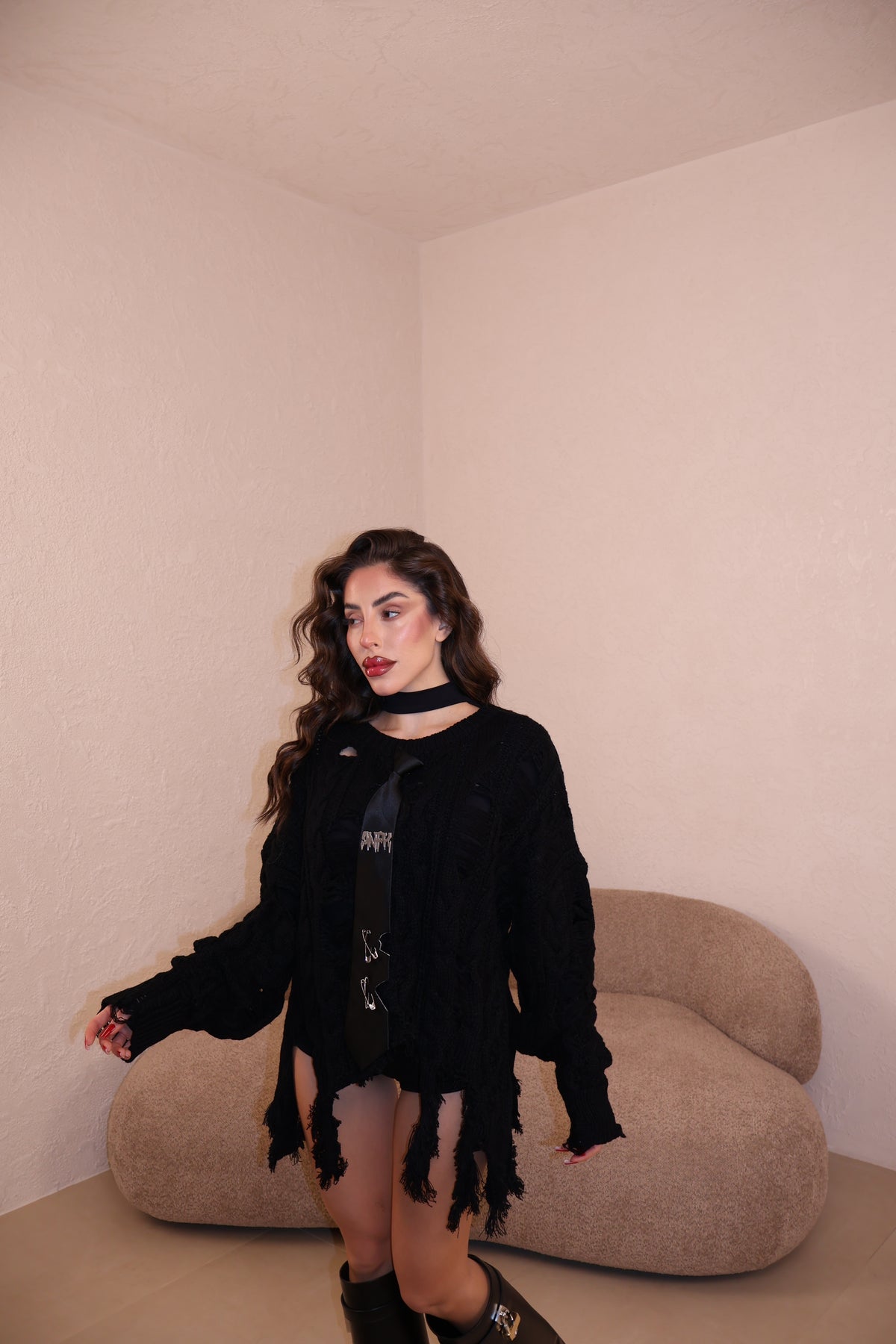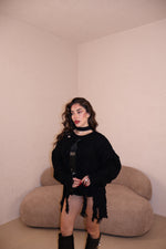 Pullover sfrangiato con cravatta in spilla removibile. Taglia unica.