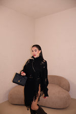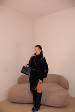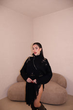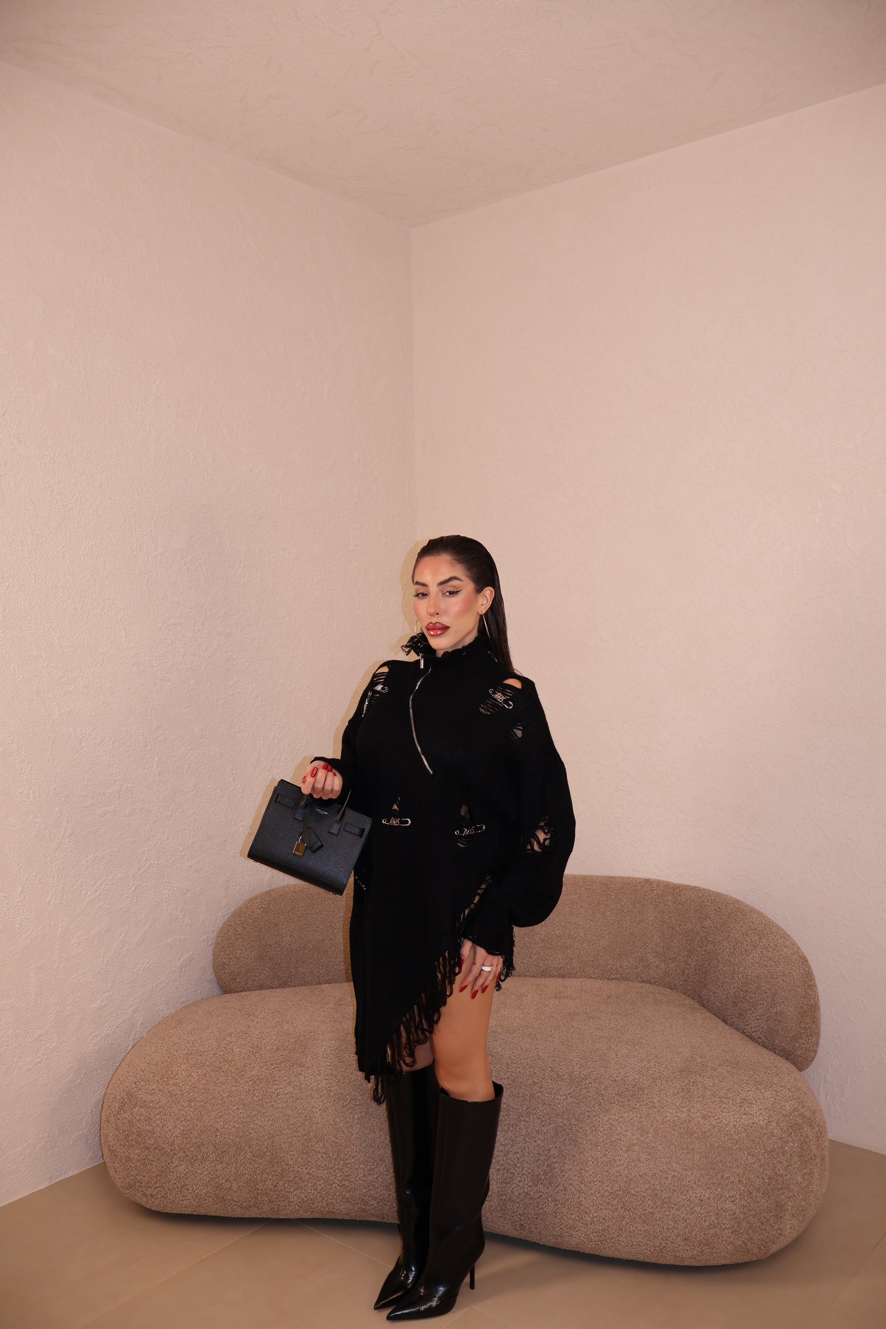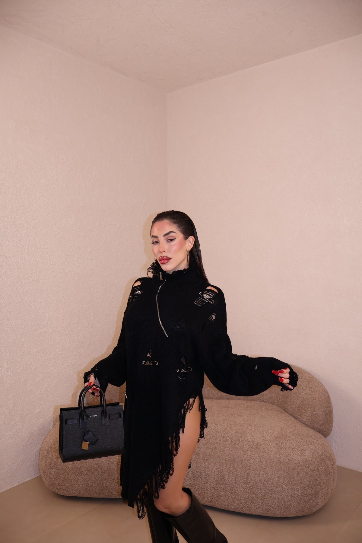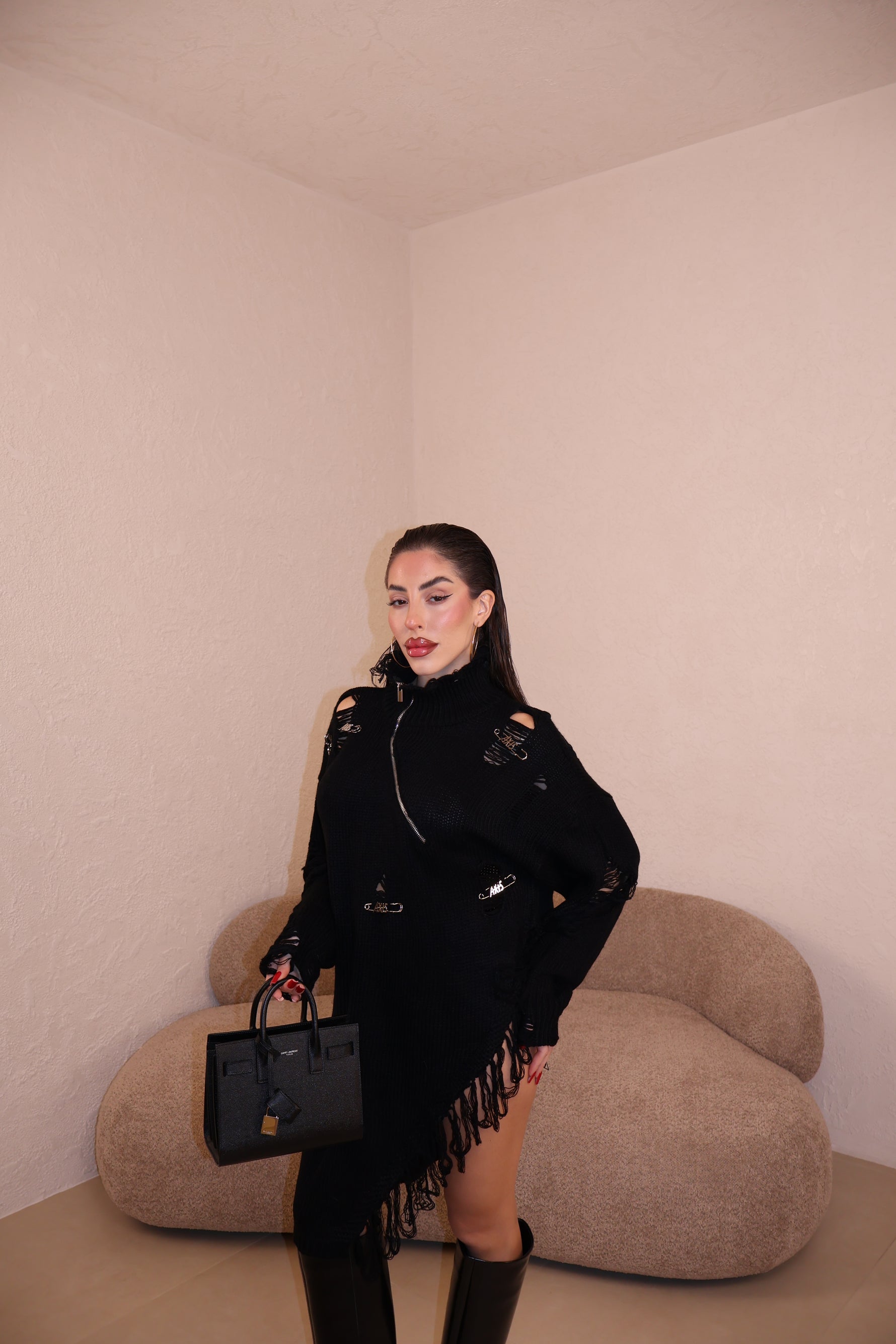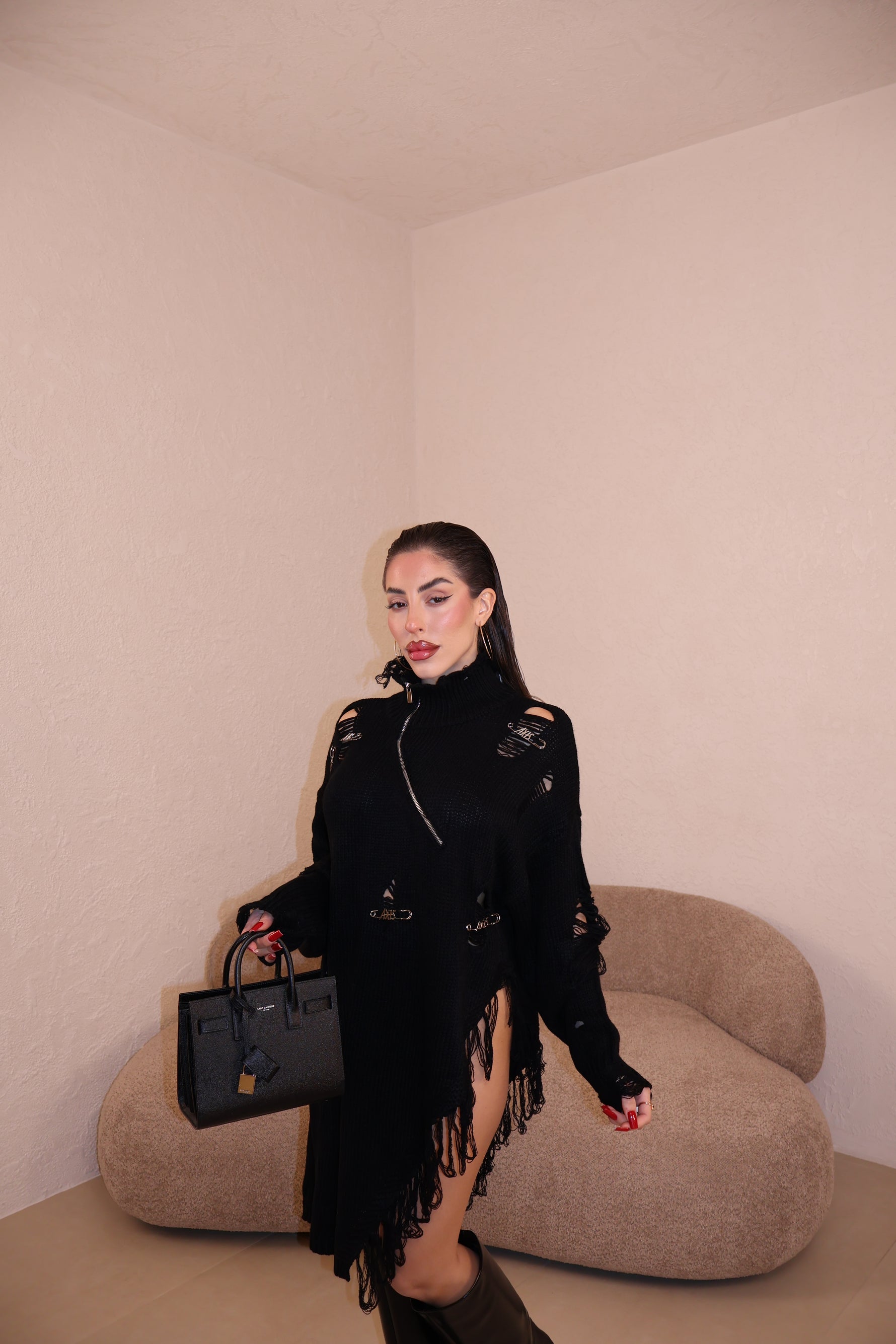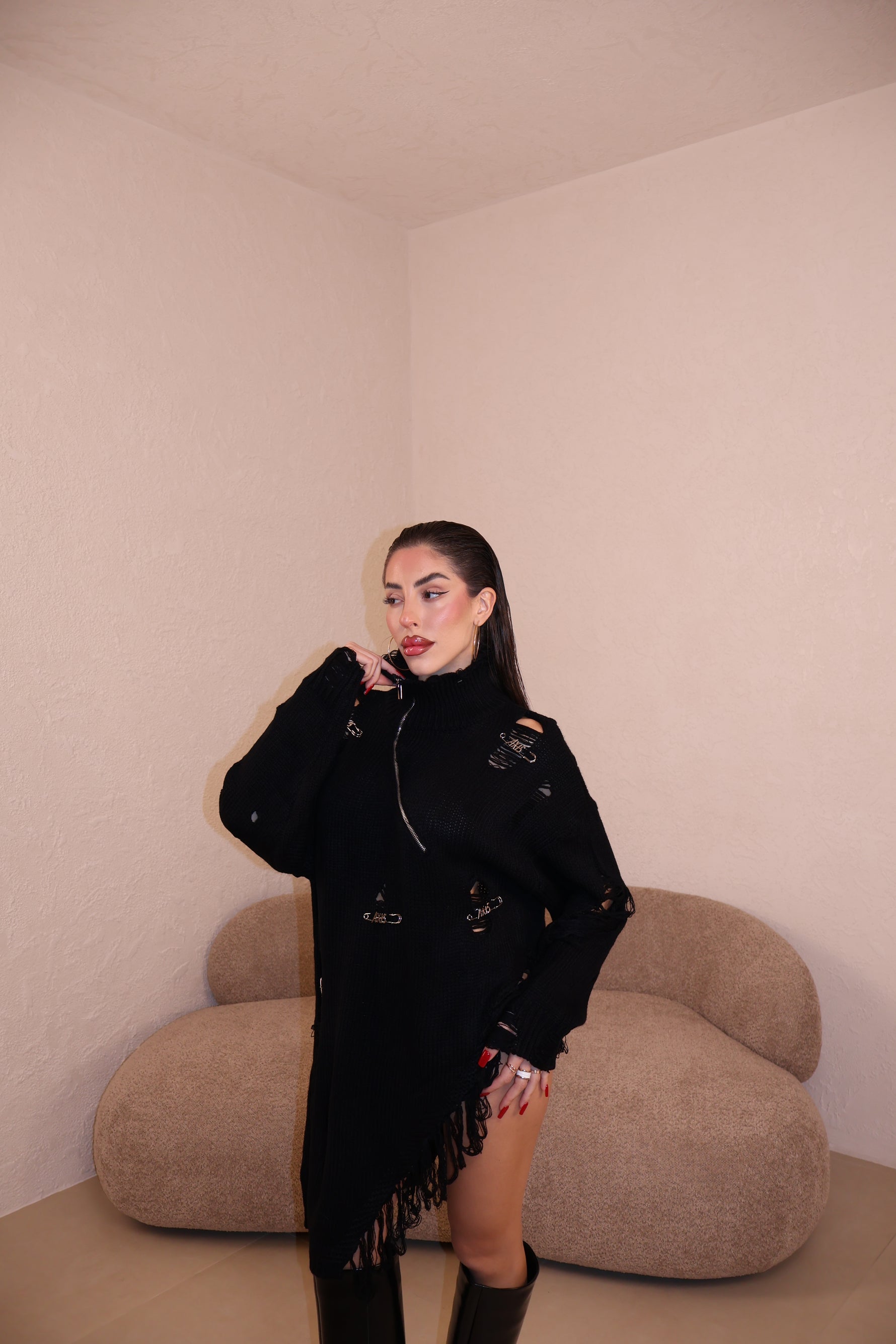 Pullover a collo alto con cerniera e dettagli sfrangiati. Spille removibili. Taglia unica.