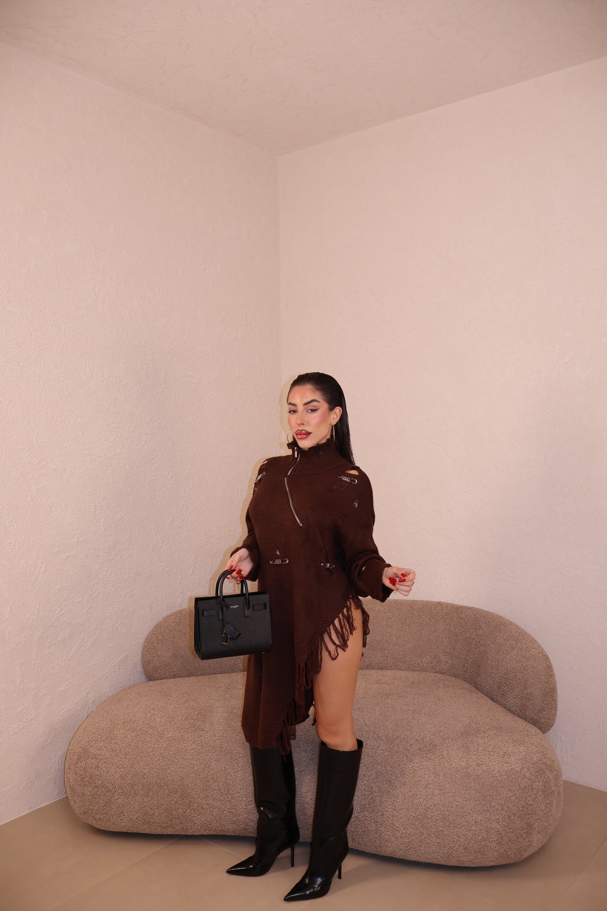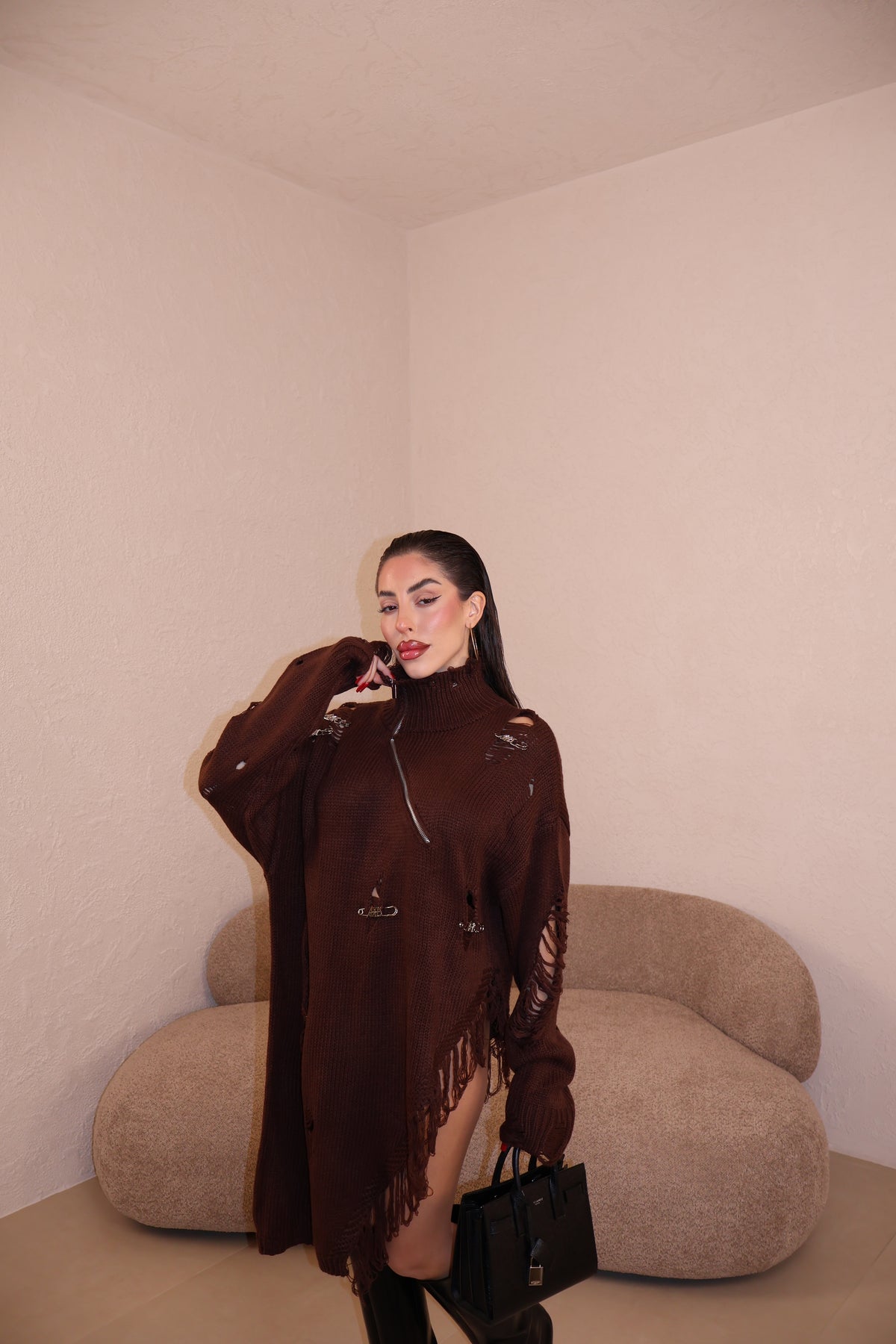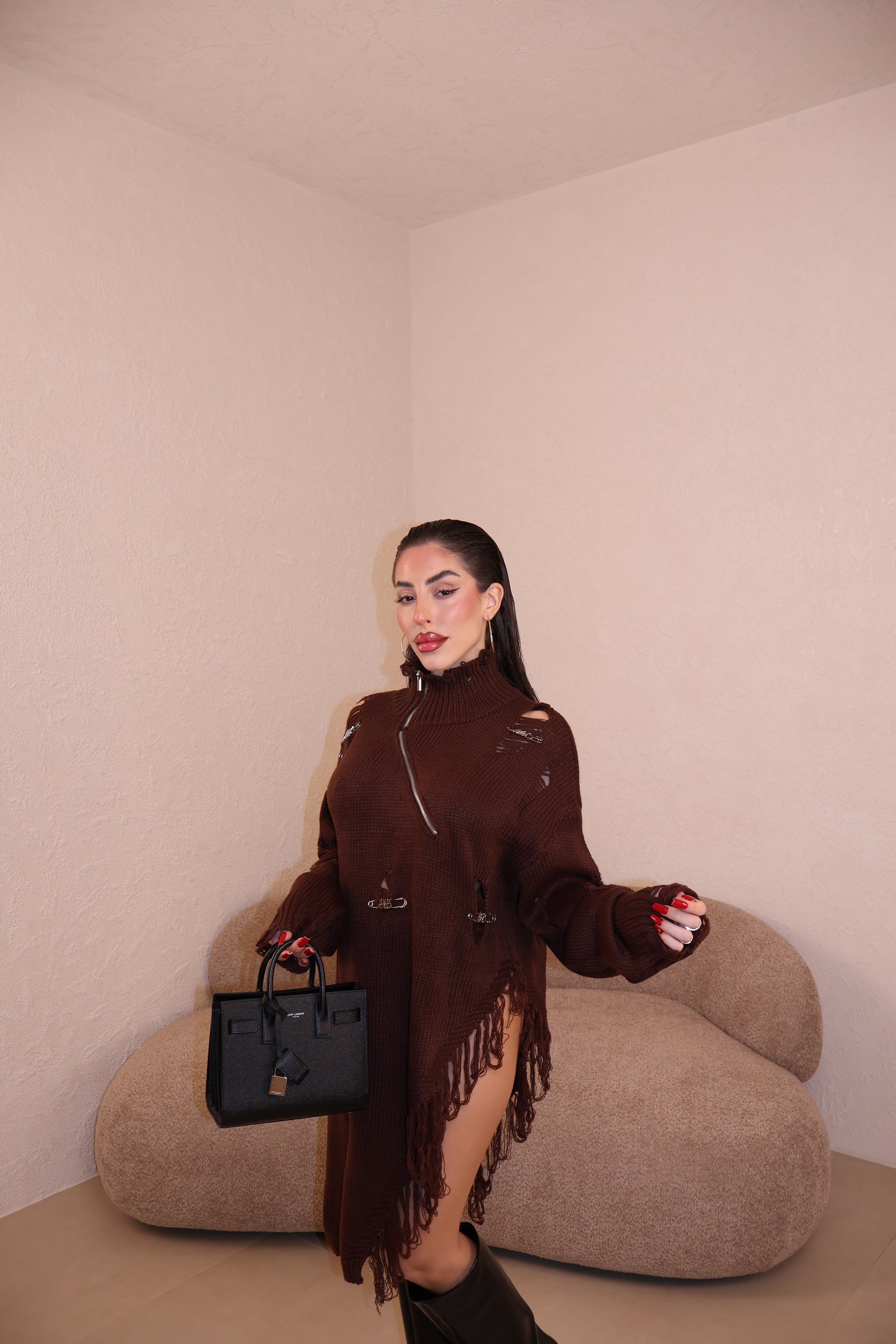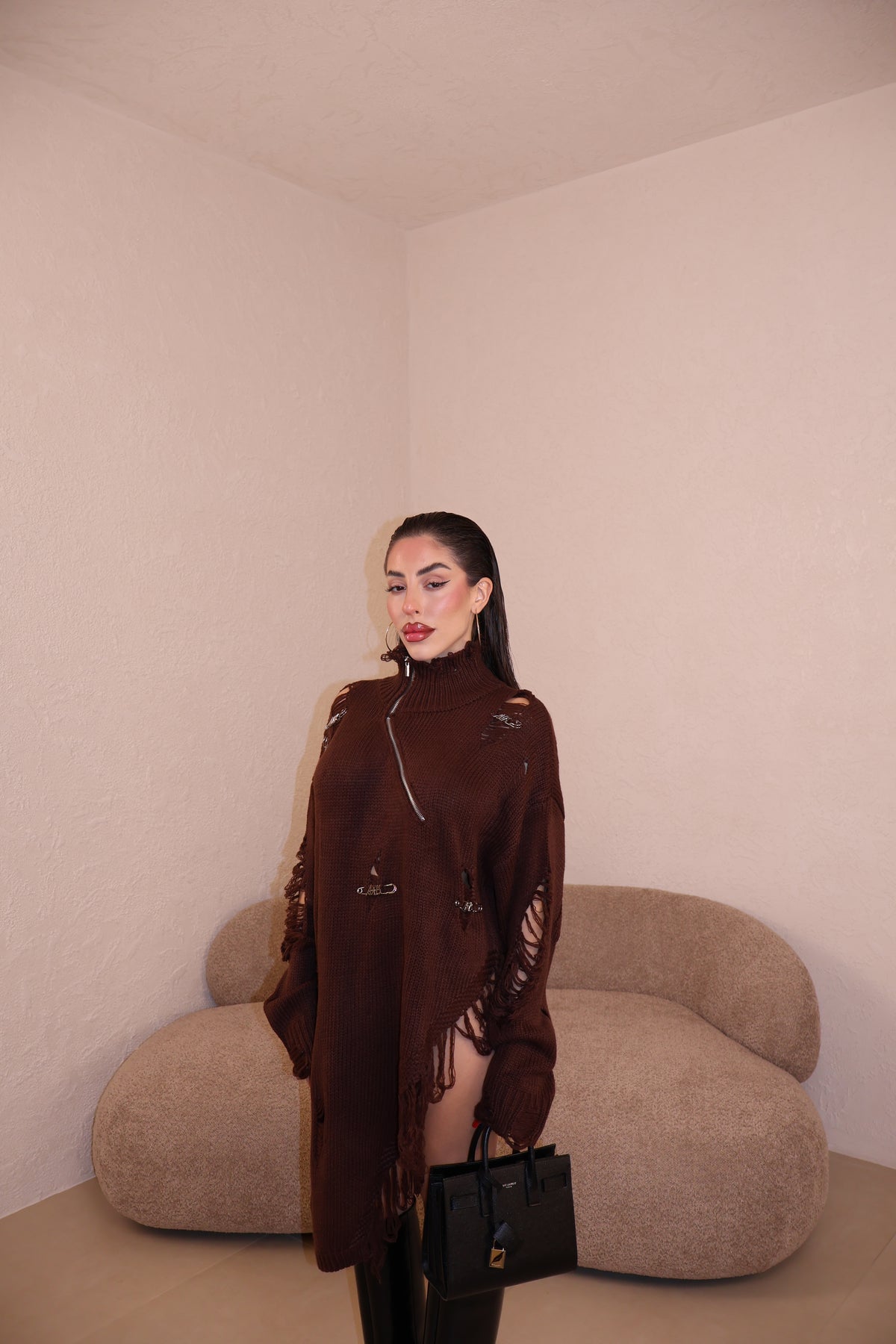 Pullover a collo alto con cerniera e dettagli sfrangiati. Spille removibili. Taglia unica.