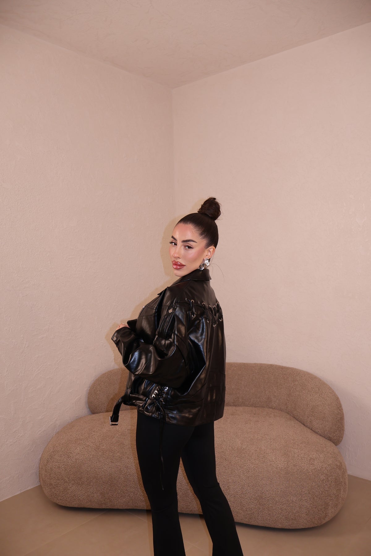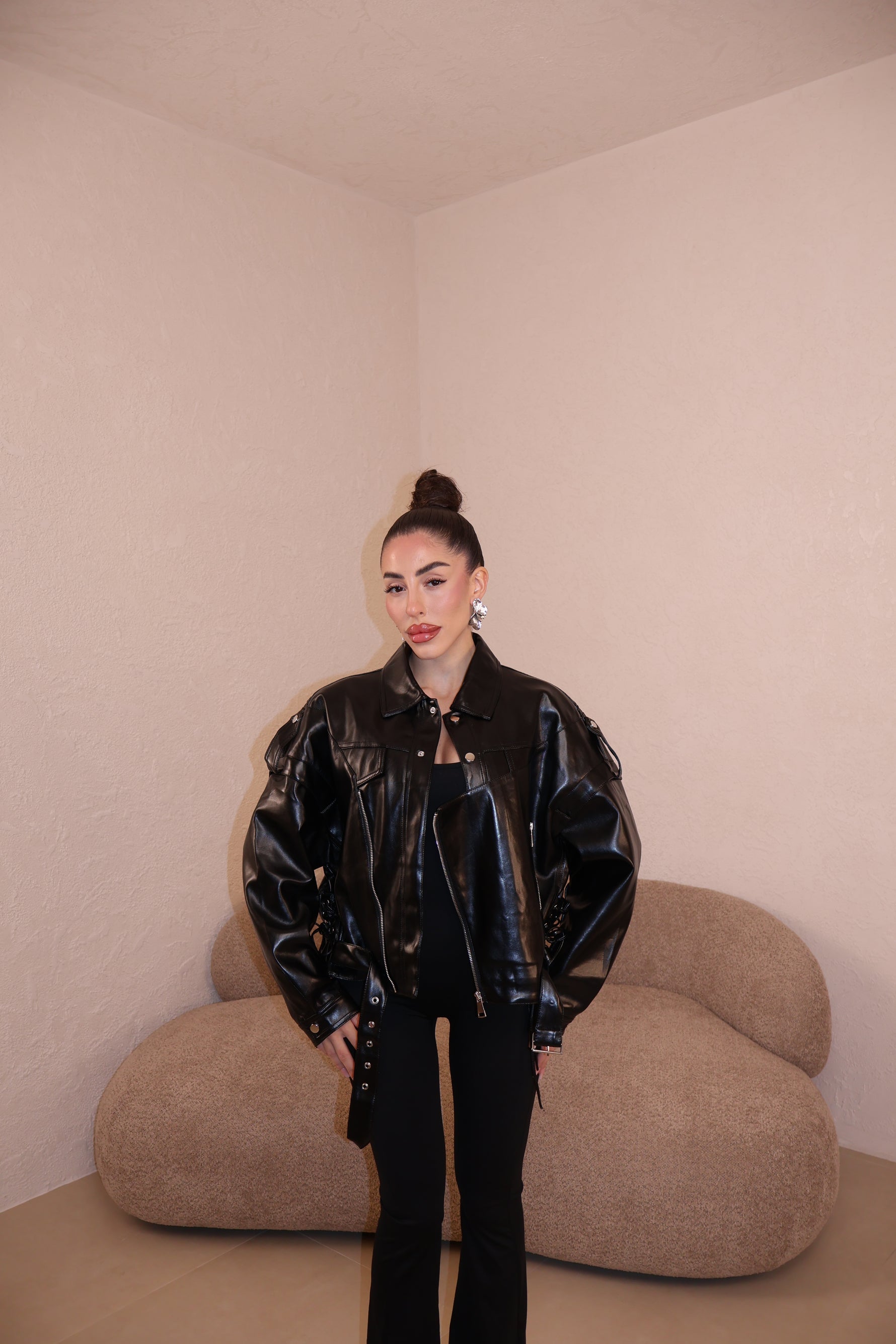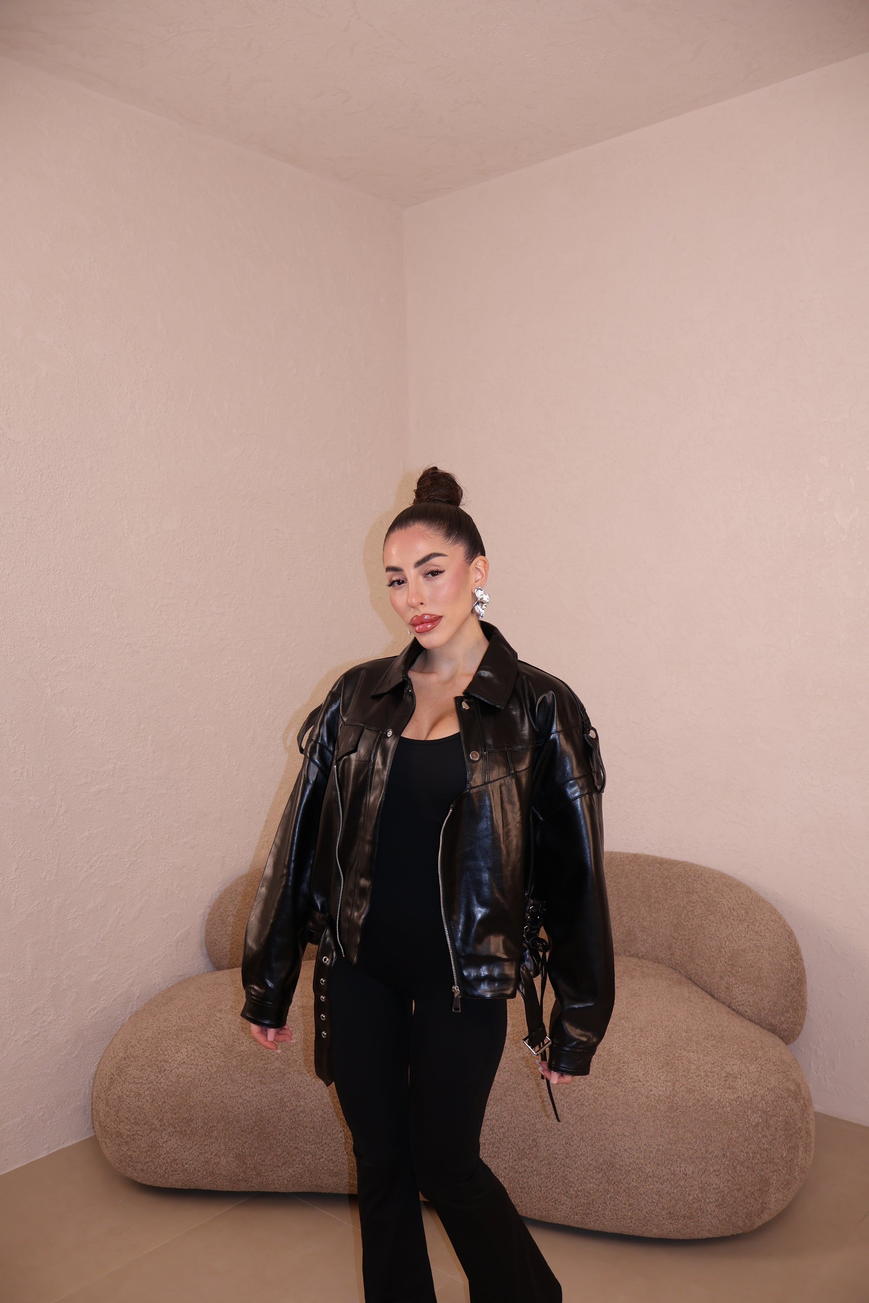 Chiodo in ecopelle con stringhe laterali. La modella indossa taglia S/M.
