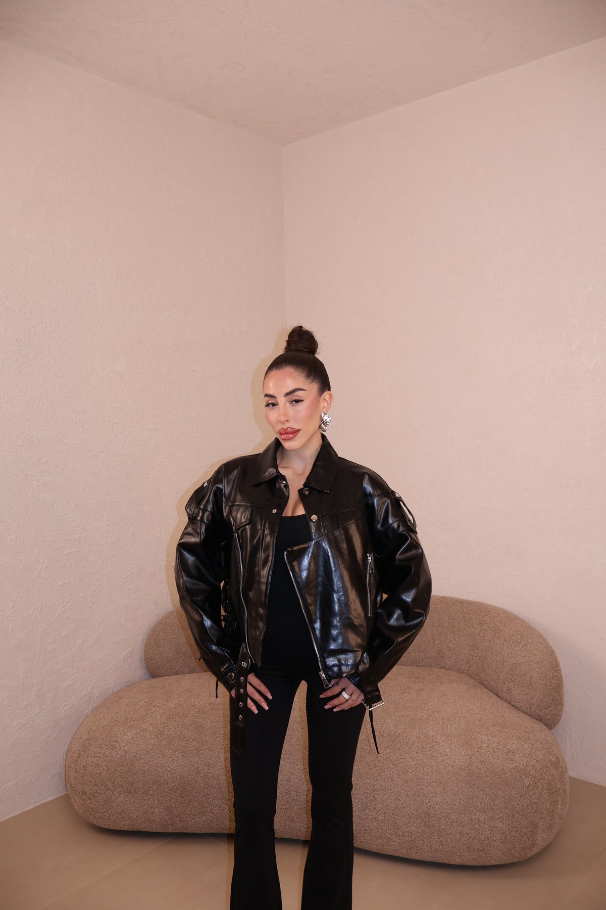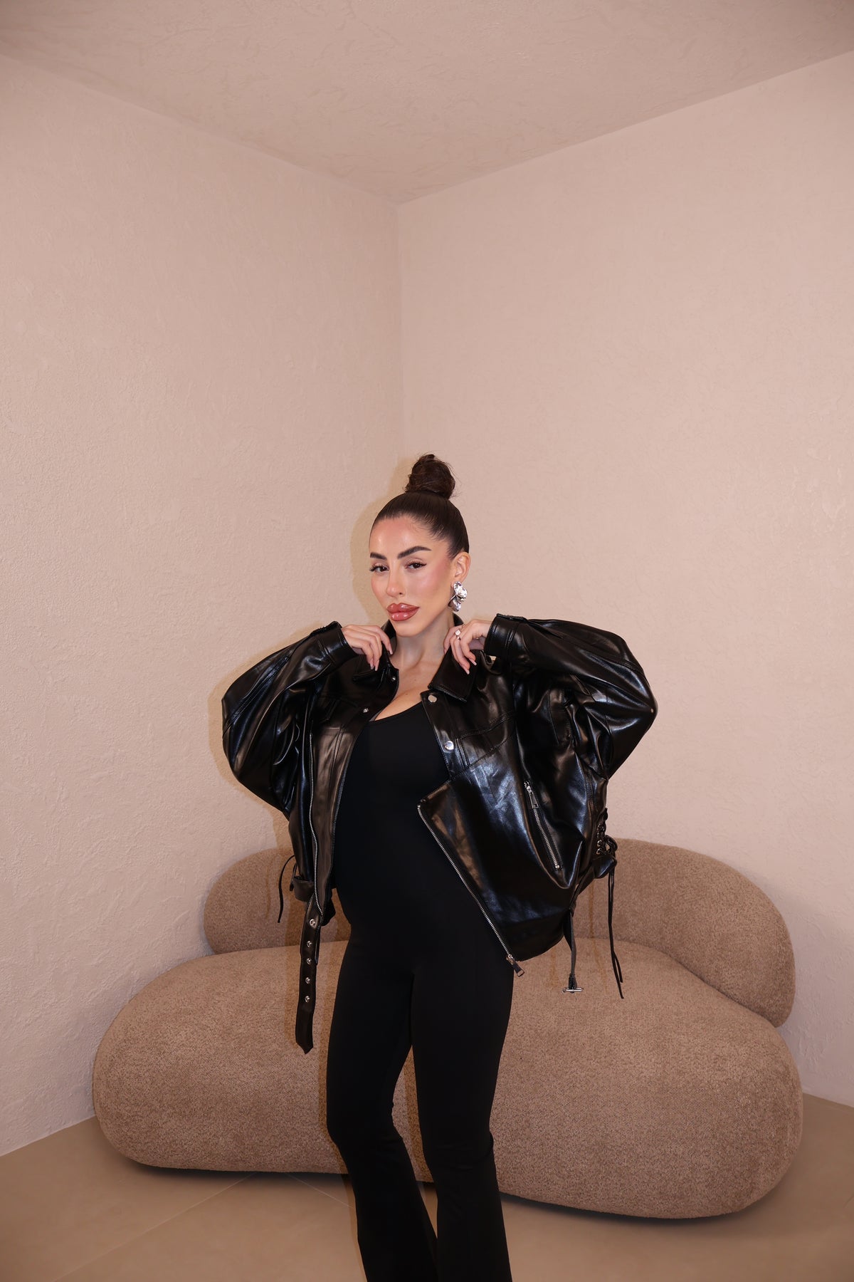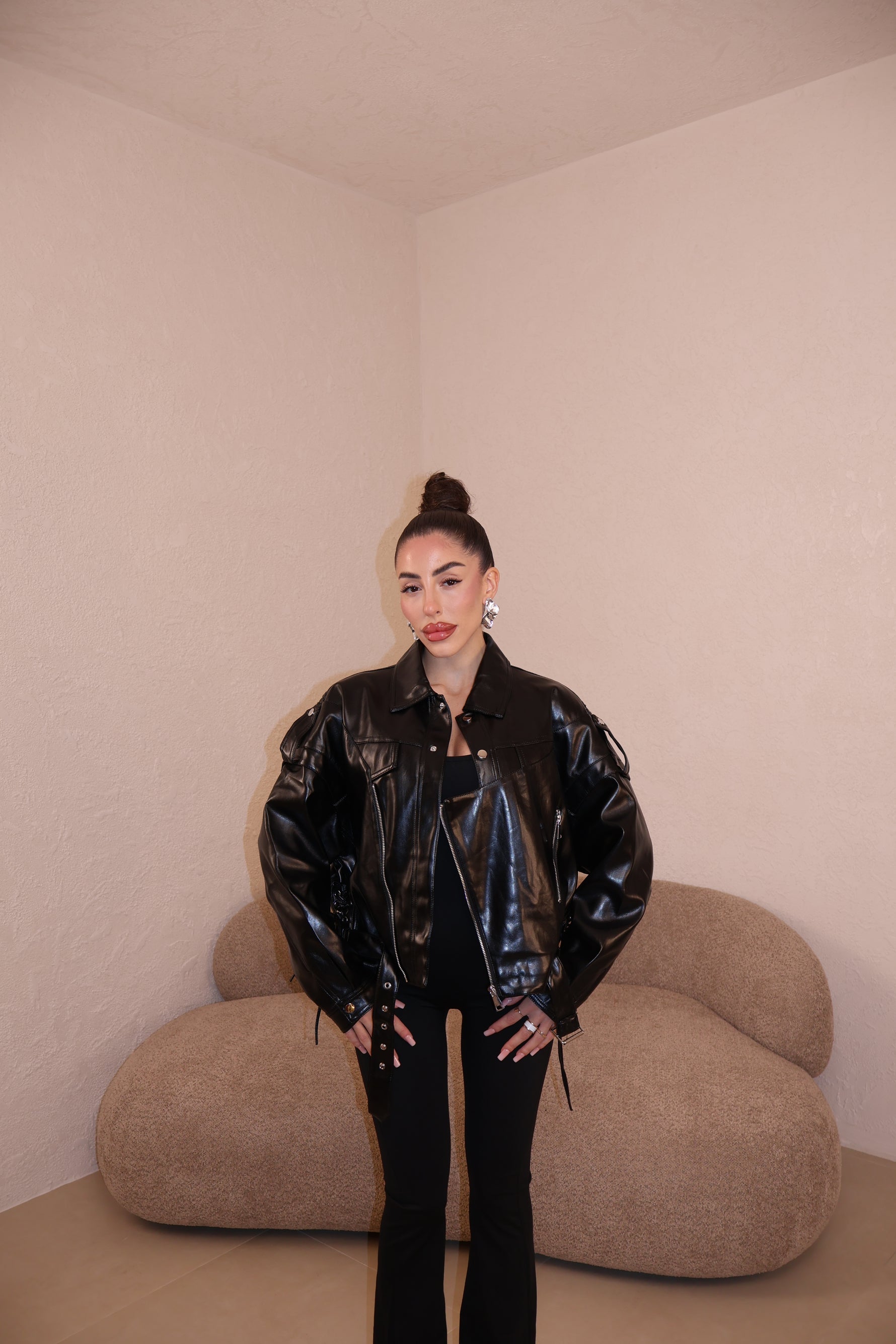 Chiodo in ecopelle con stringhe laterali. La modella indossa taglia S/M.