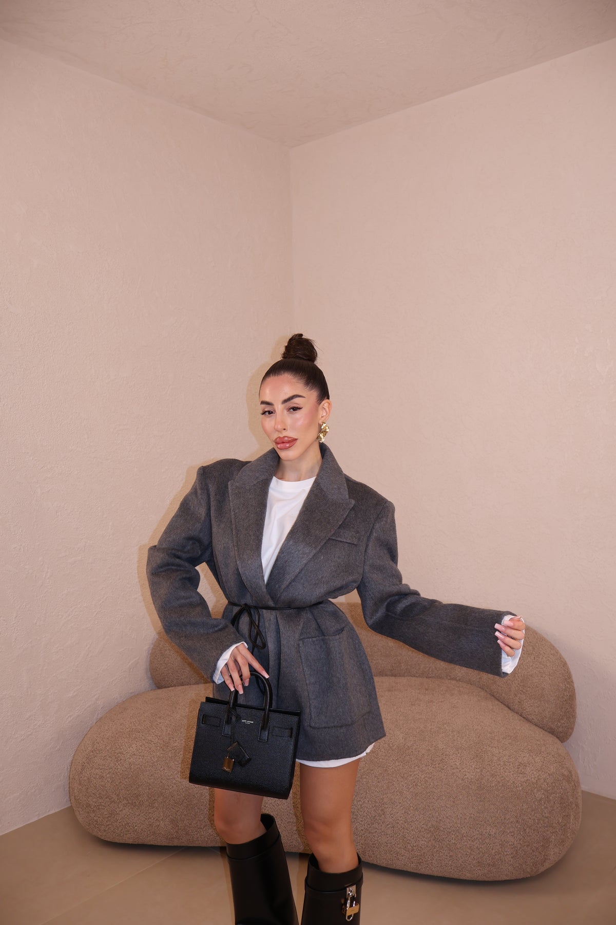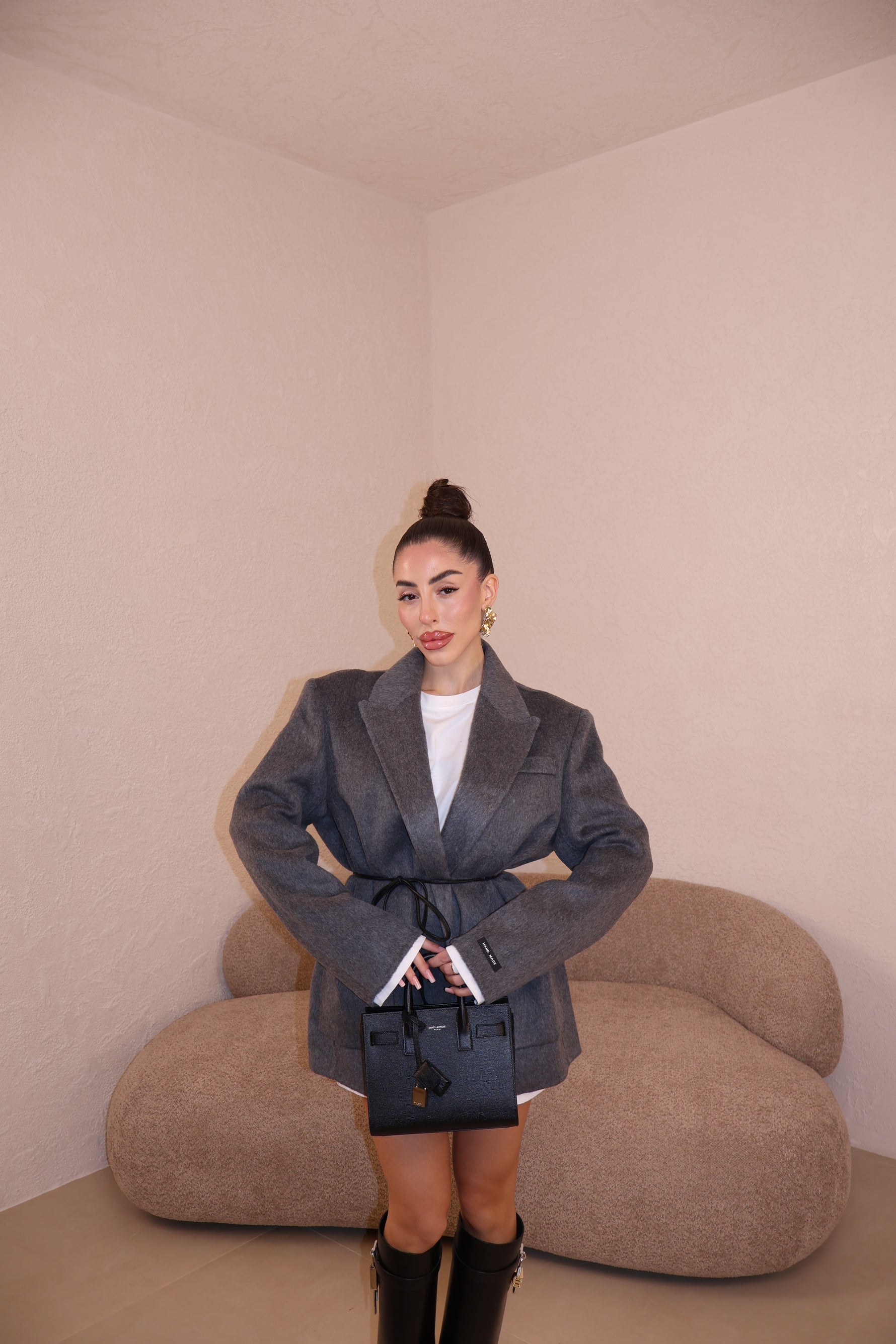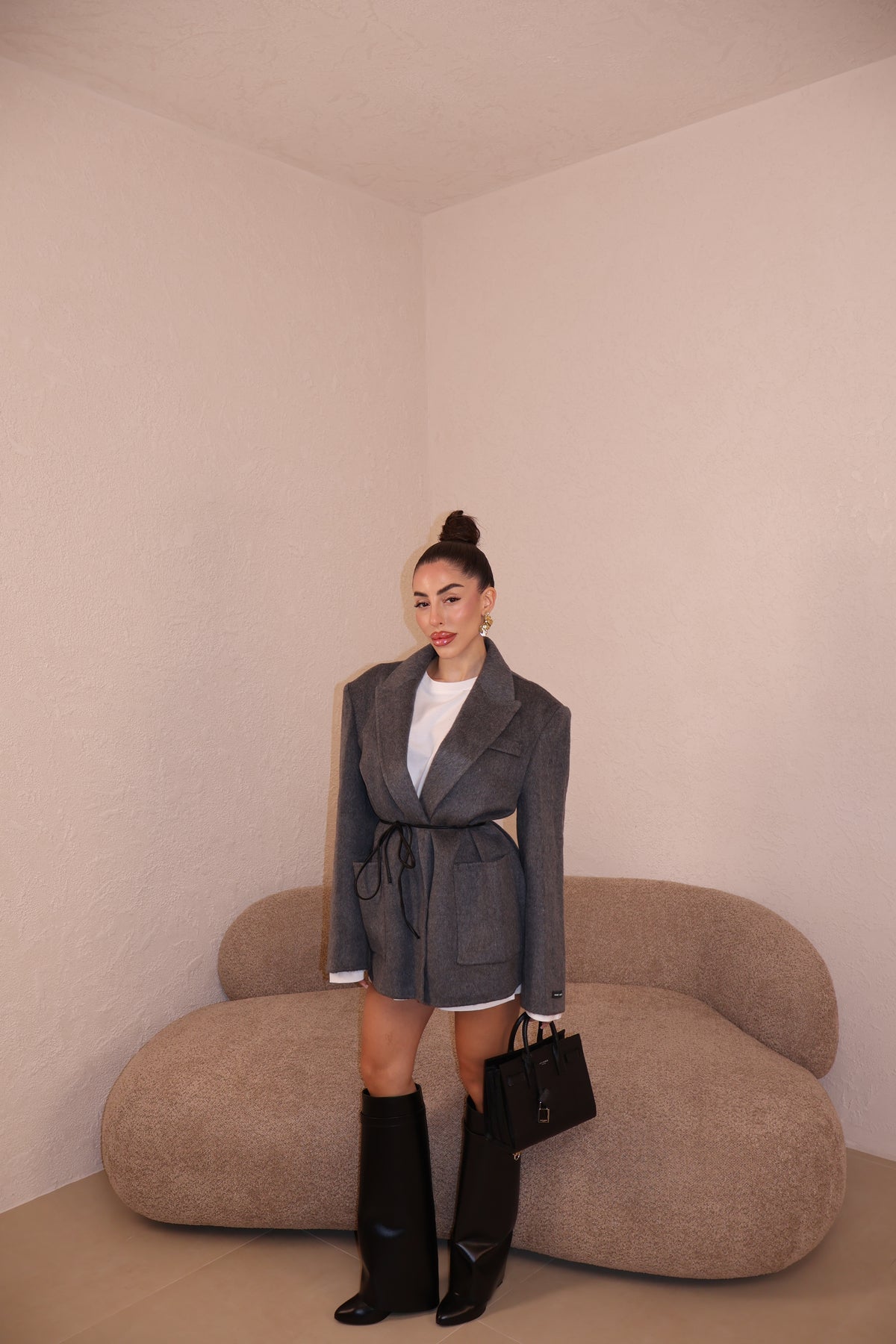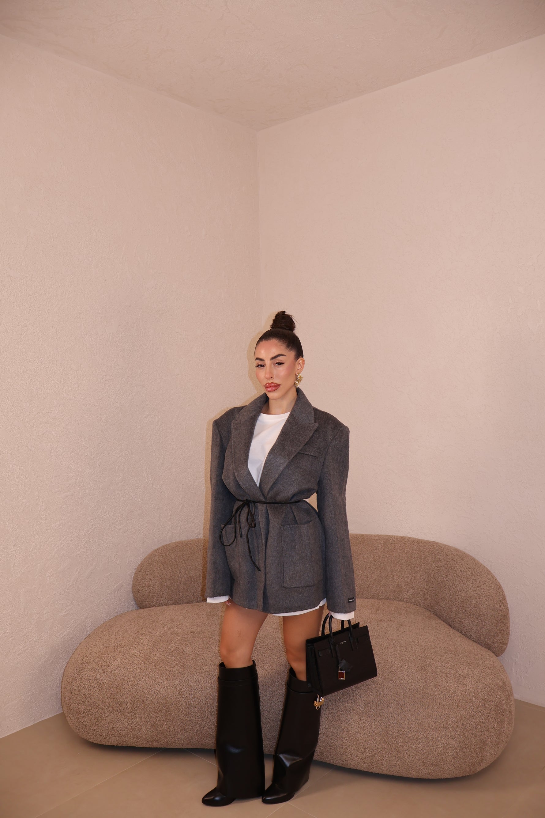 Giacca over in cashmere con tasconi frontali,spalline imbottite e cintura in vita in ecopelle. Taglia unica.