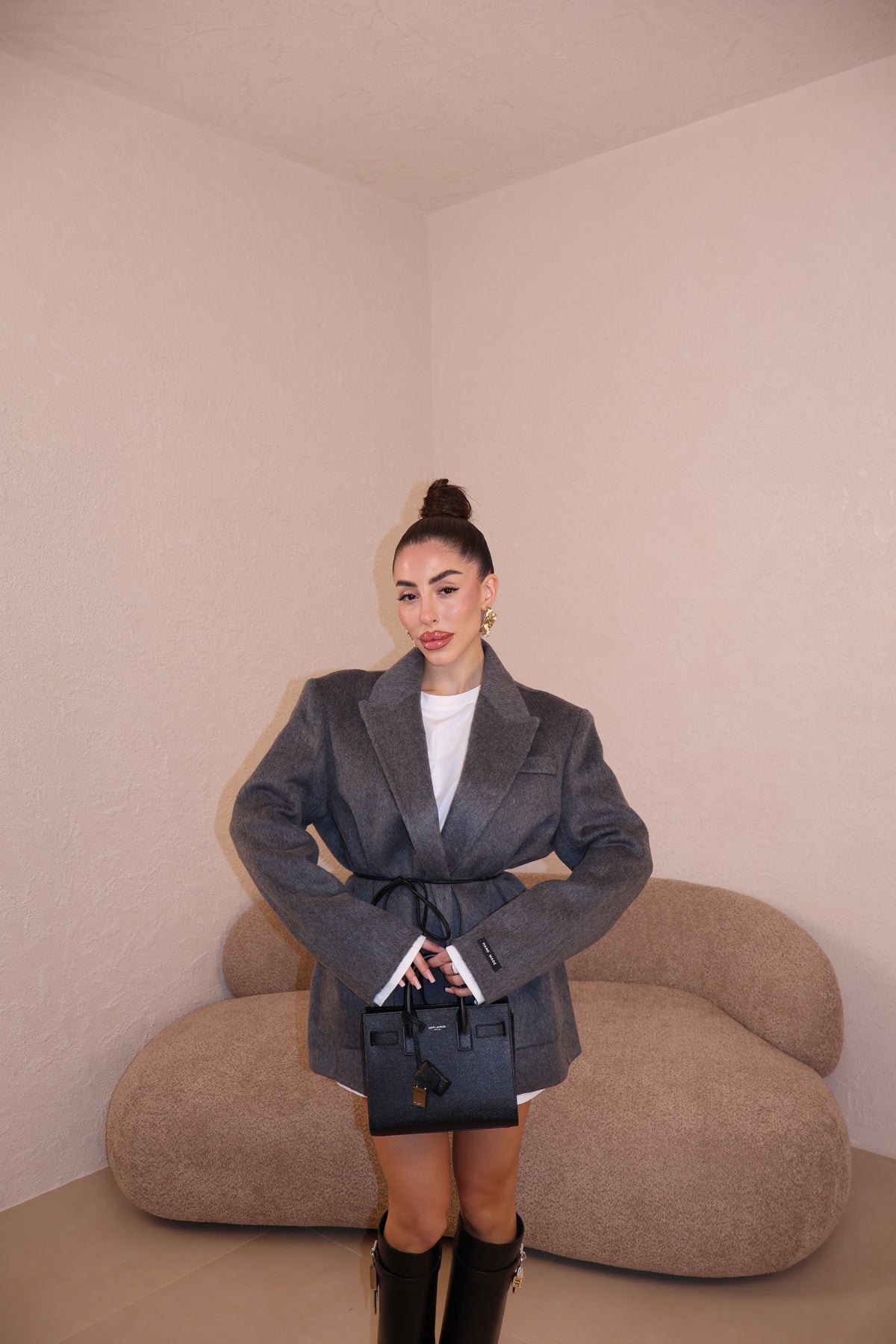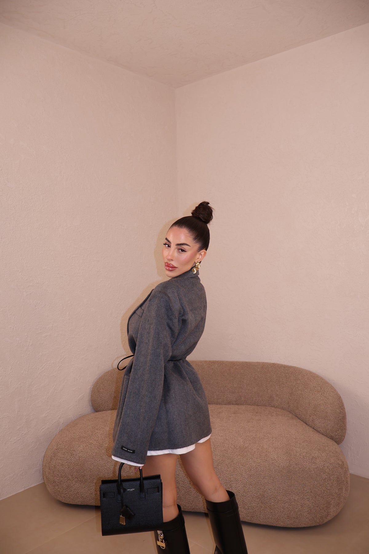 La giacca veste leggermente over ma con la cinta stretta in vita, è perfetta.