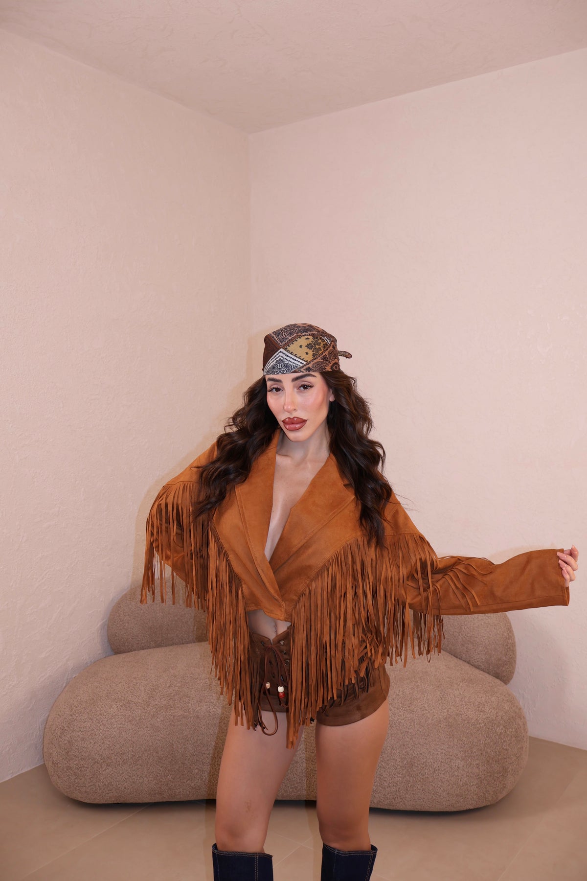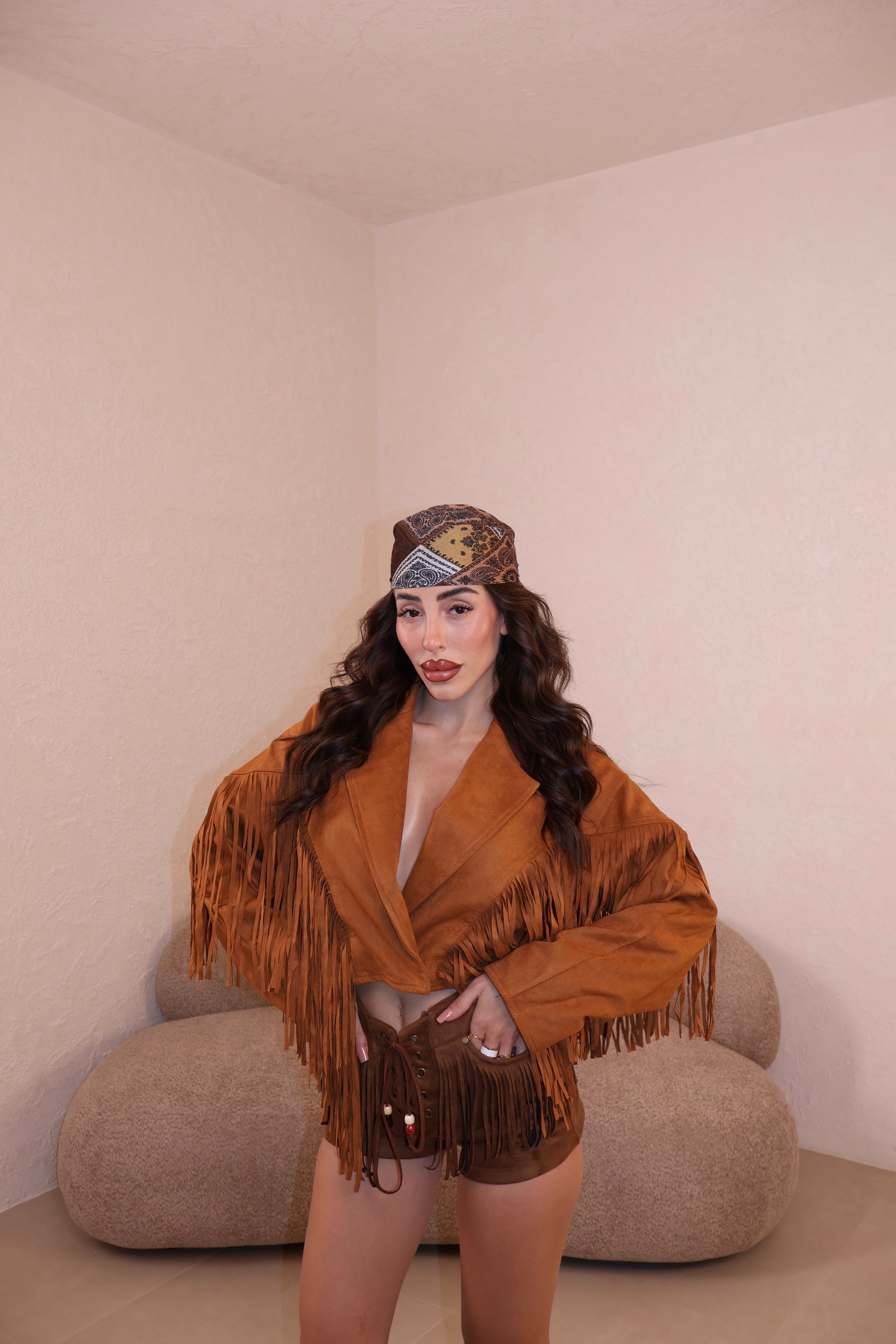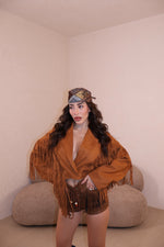 Prezzo unitario / perGiacca in camoscio con dettagli frange e bottoni frontali. Taglia unica.