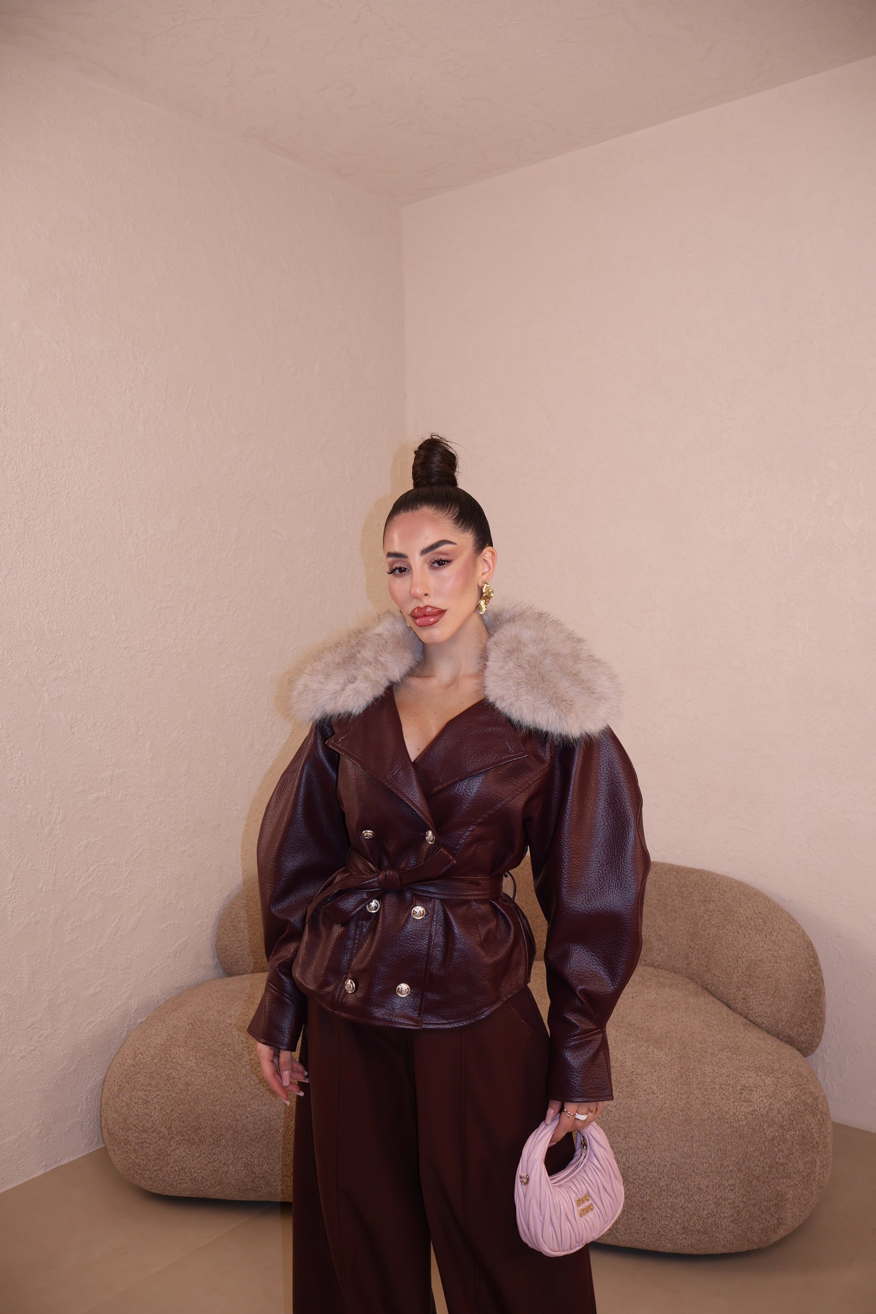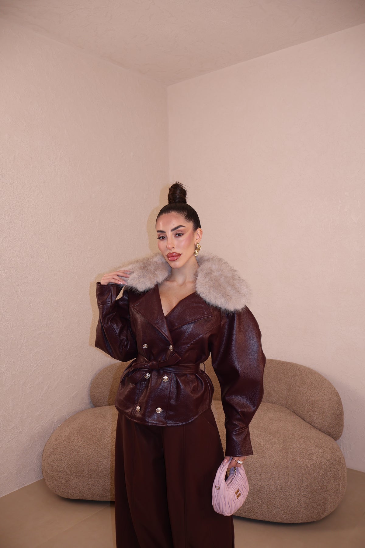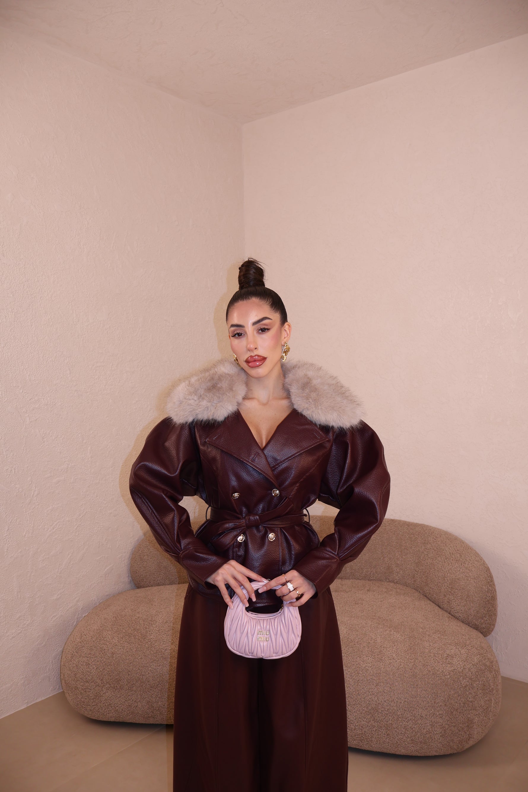 Giacca in ecopelle con collo in pelliccia. Chiusura a doppio petto con bottoni frontali dorati. Cintura in vita regolabile. Fodera interna in pelliccia. Taglia unica.