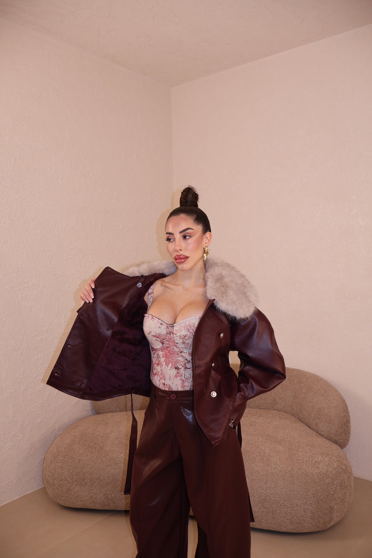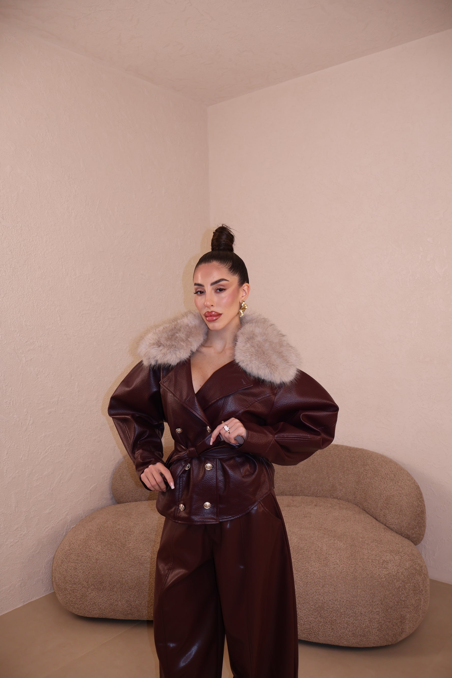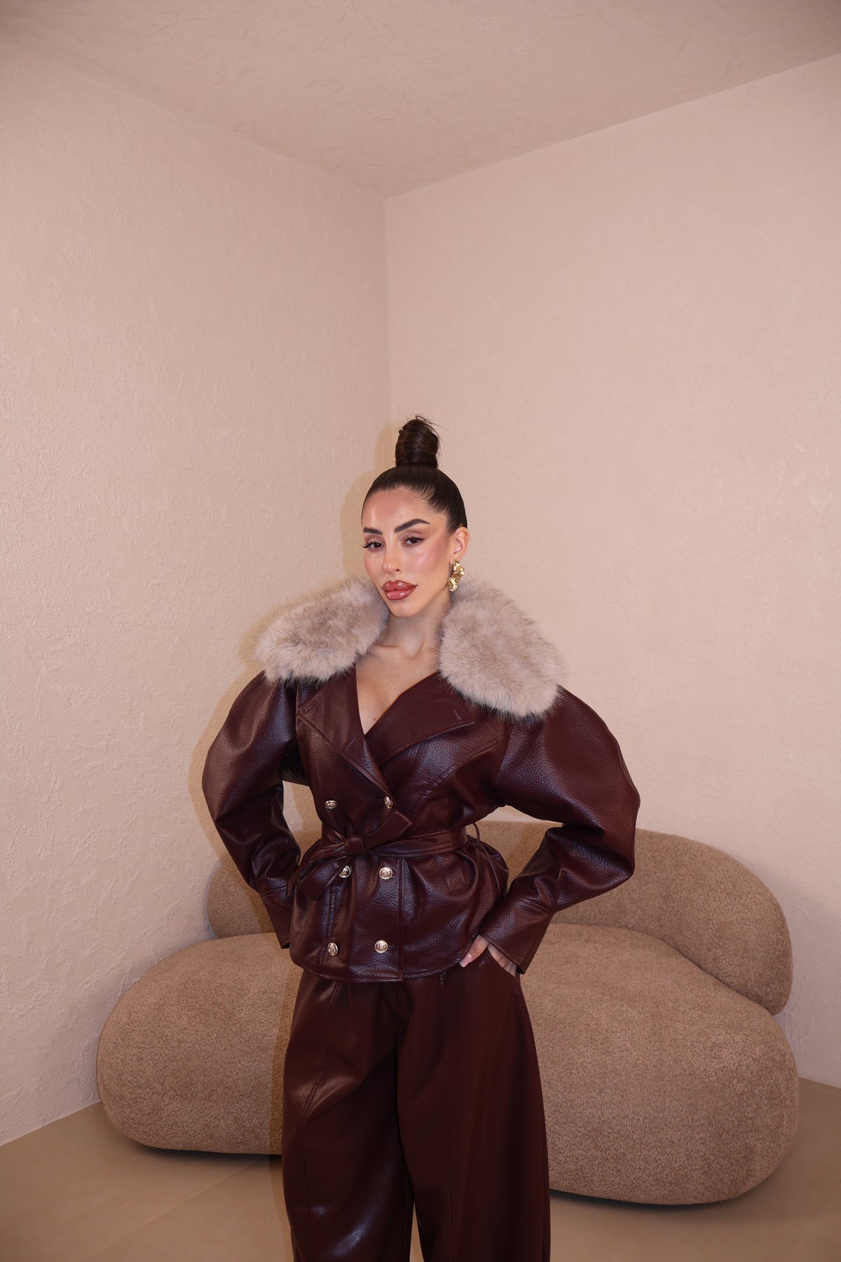Giacca in ecopelle con collo in pelliccia. Chiusura a doppio petto con bottoni frontali dorati. Cintura in vita regolabile. Fodera interna in pelliccia. Taglia unica.