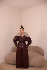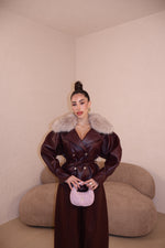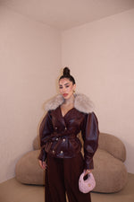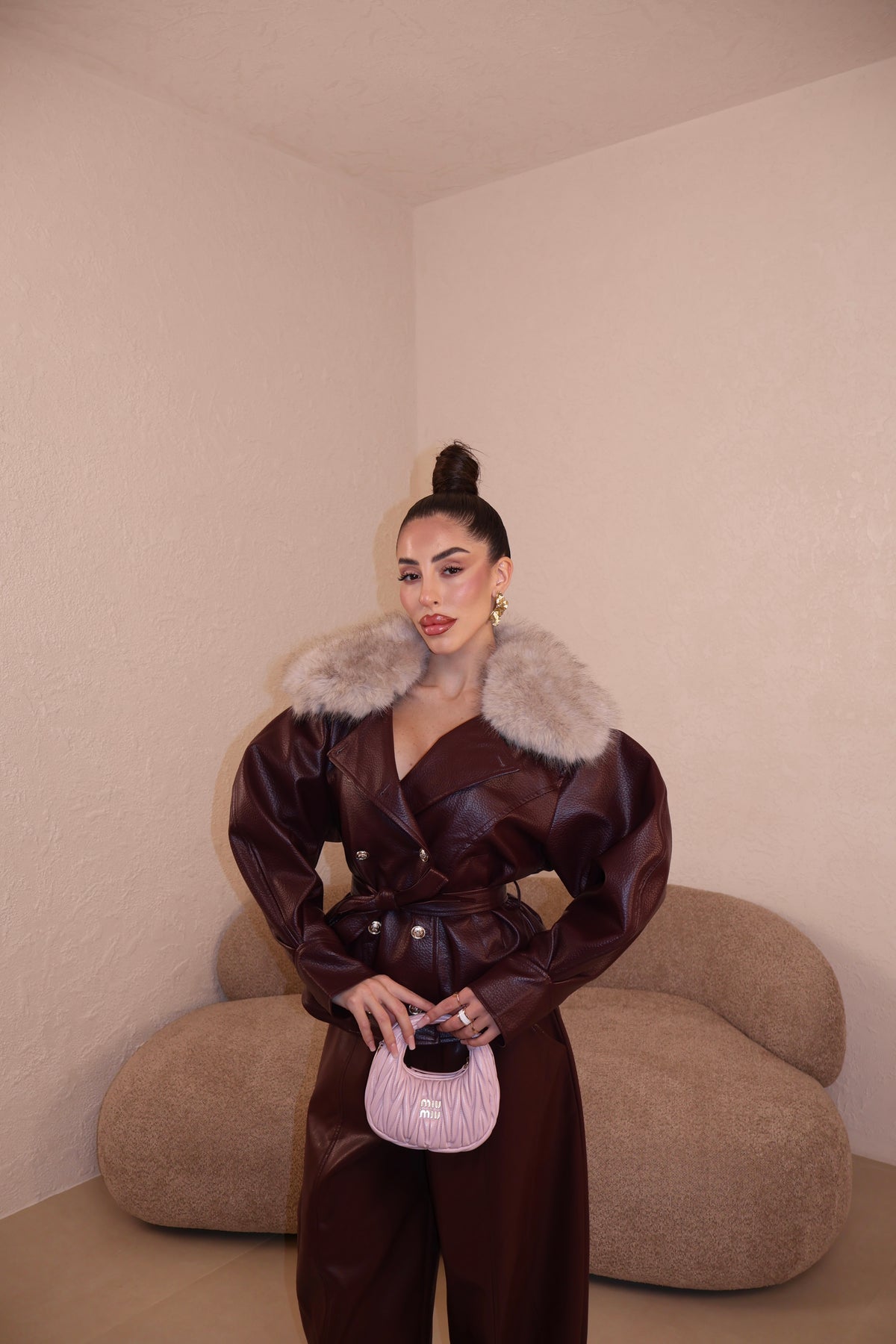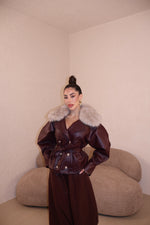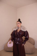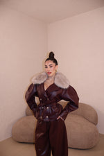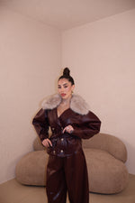 Prezzo unitario / perGiacca in ecopelle con collo in pelliccia. Chiusura a doppio petto con bottoni frontali dorati. Cintura in vita regolabile. Fodera interna in pelliccia. Taglia unica.