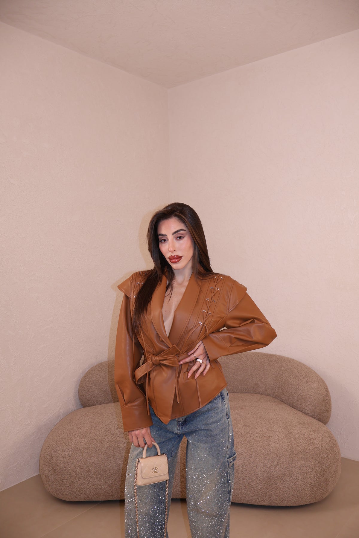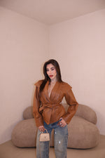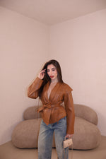 Prezzo unitario / perGiacca in similpelle con dettaglio stringhe frontali e cintura in vita. Taglia unica.