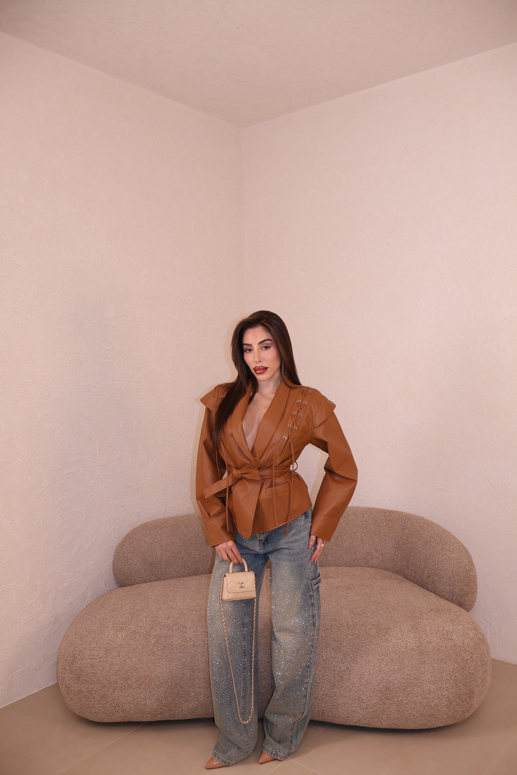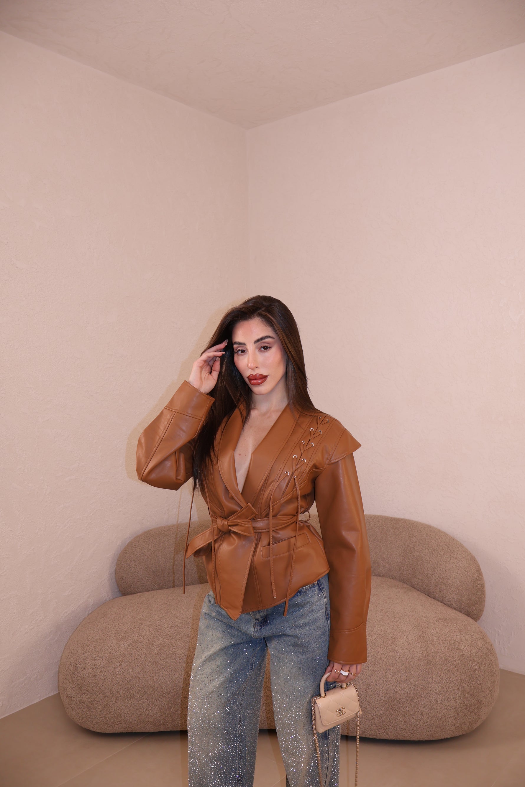Giacca in similpelle con dettaglio stringhe frontali e cintura in vita. Taglia unica.