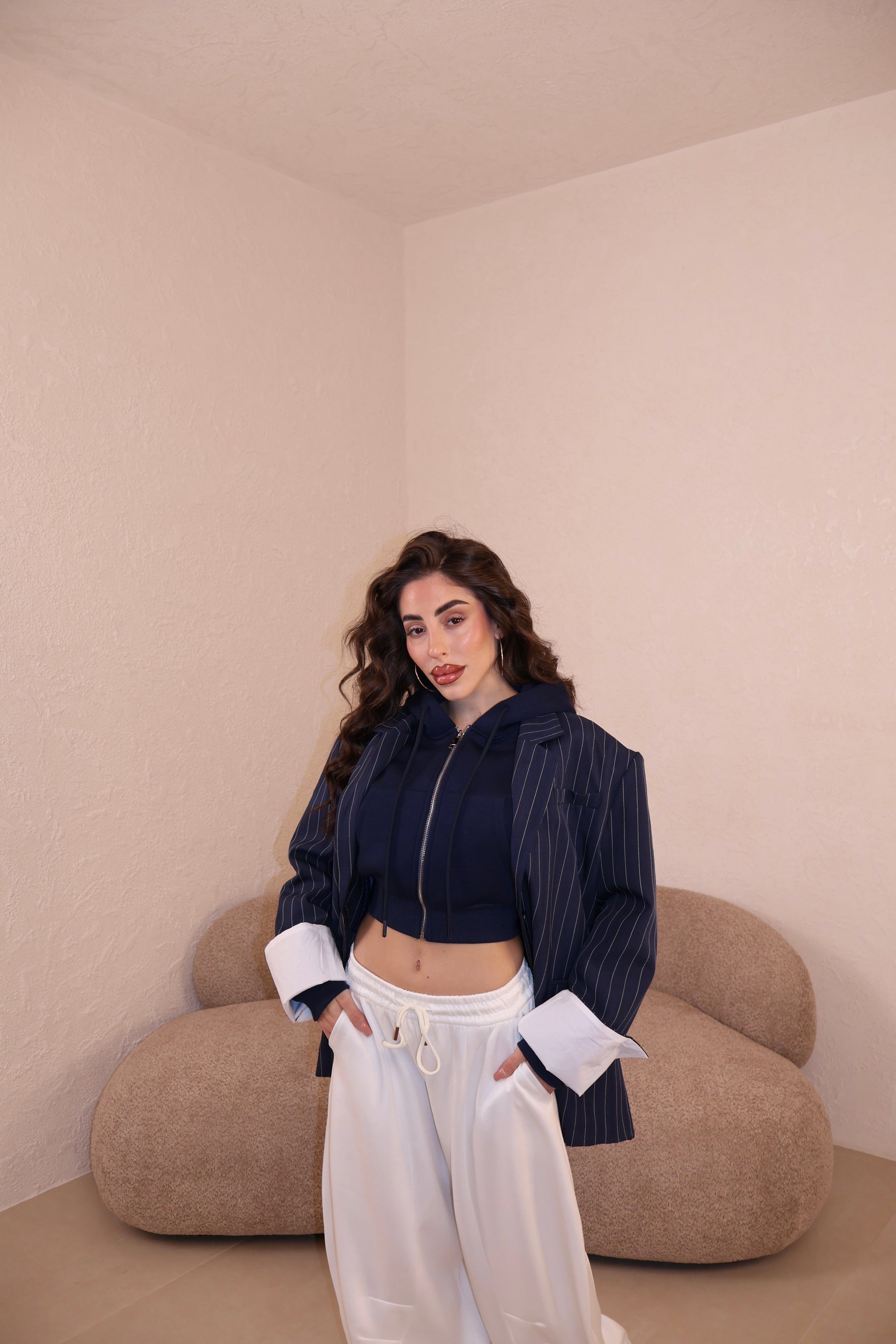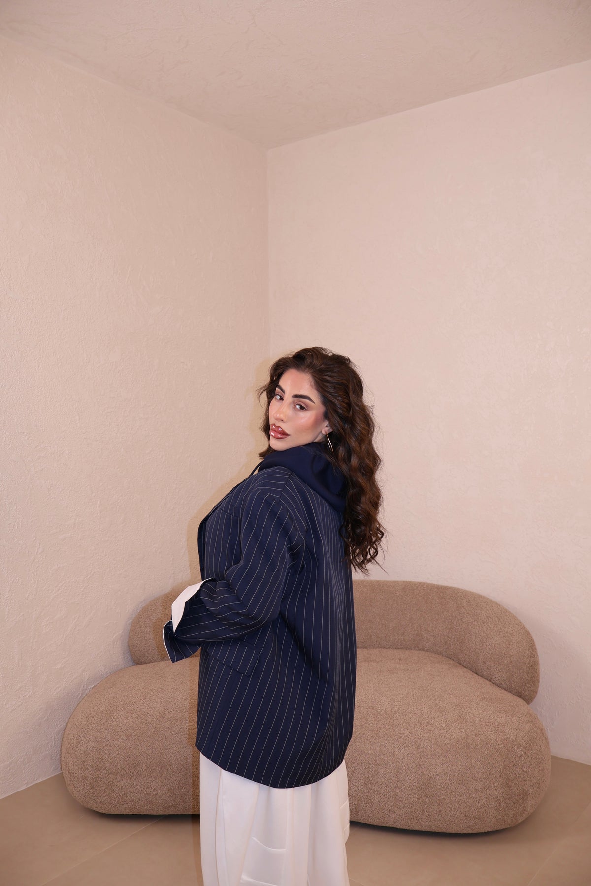 Giacca modello over gessata con dettaglioi risvolti alle maniche. Taglia unica.