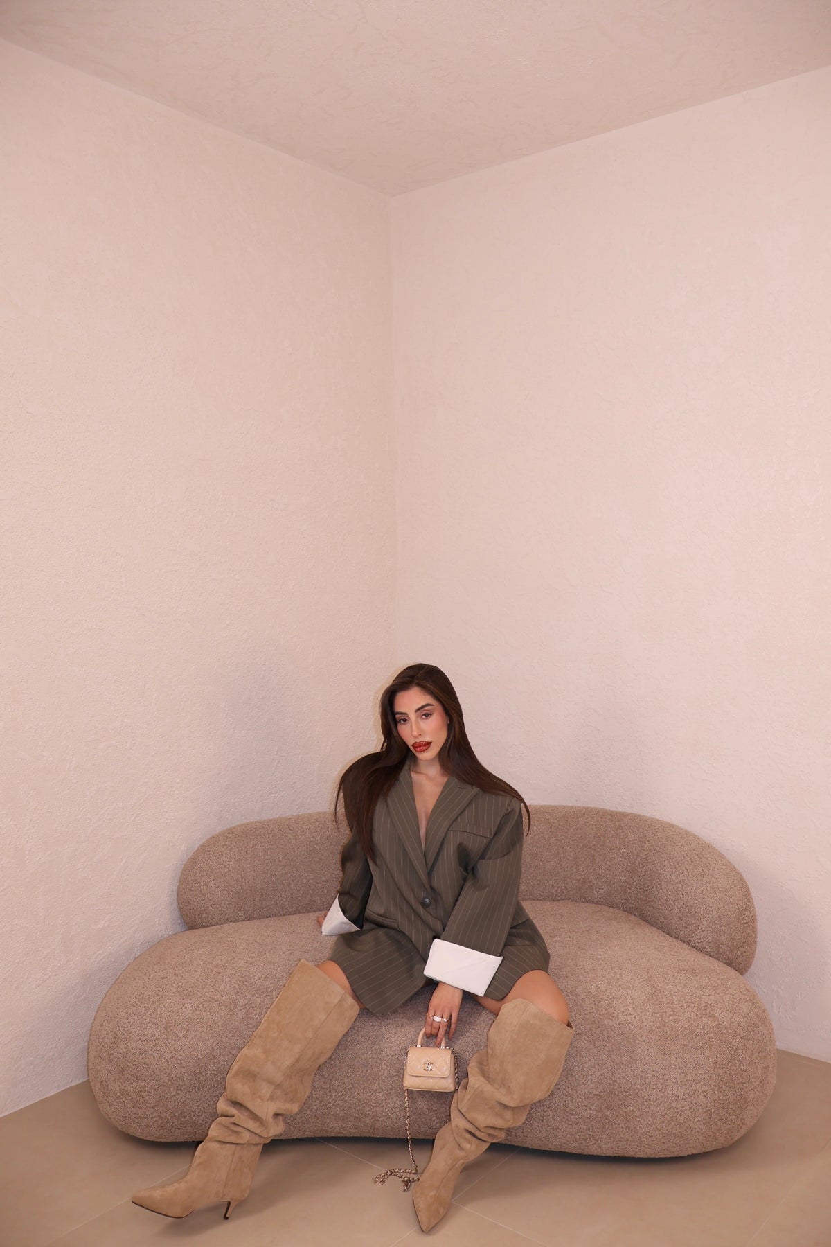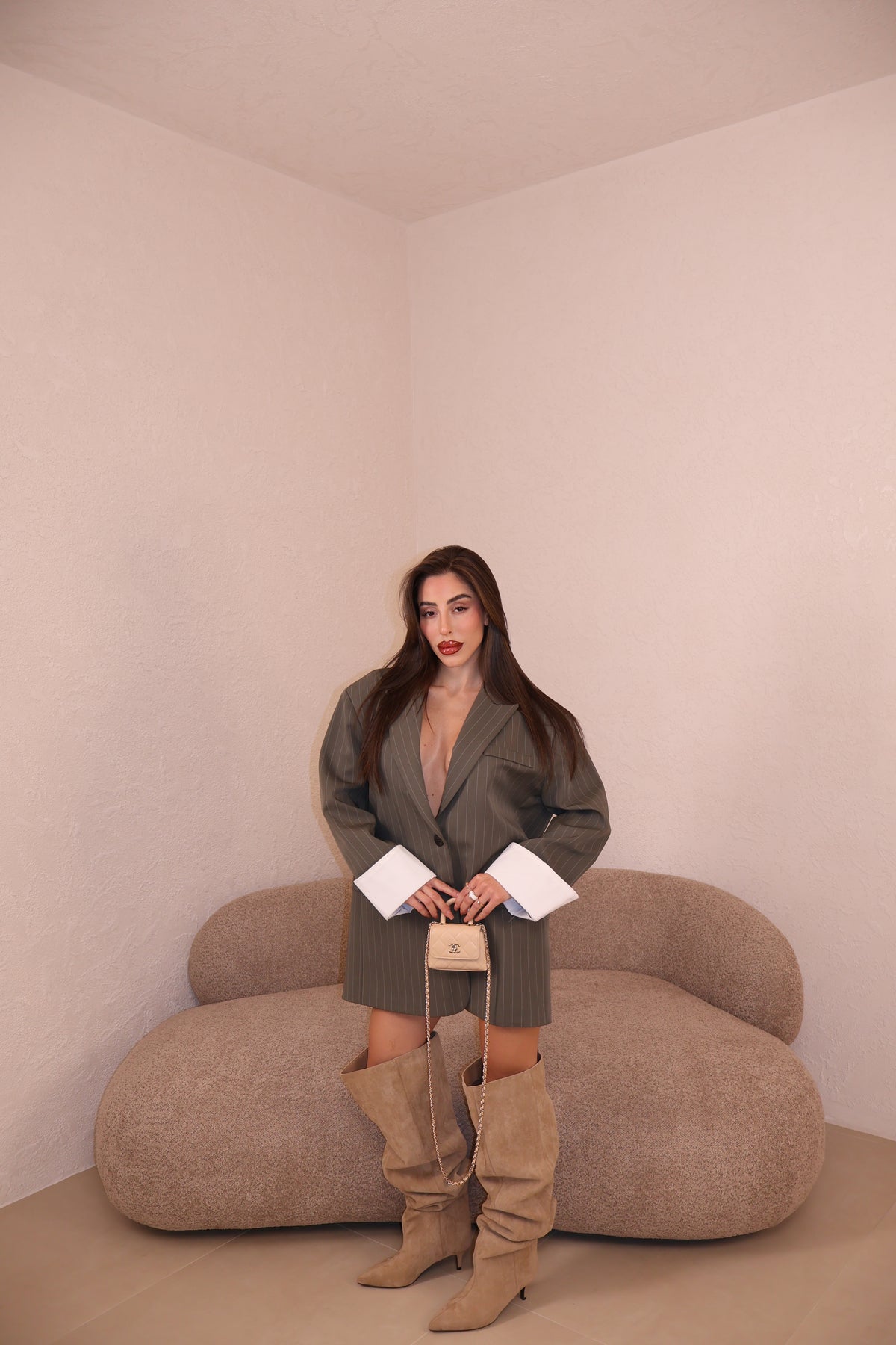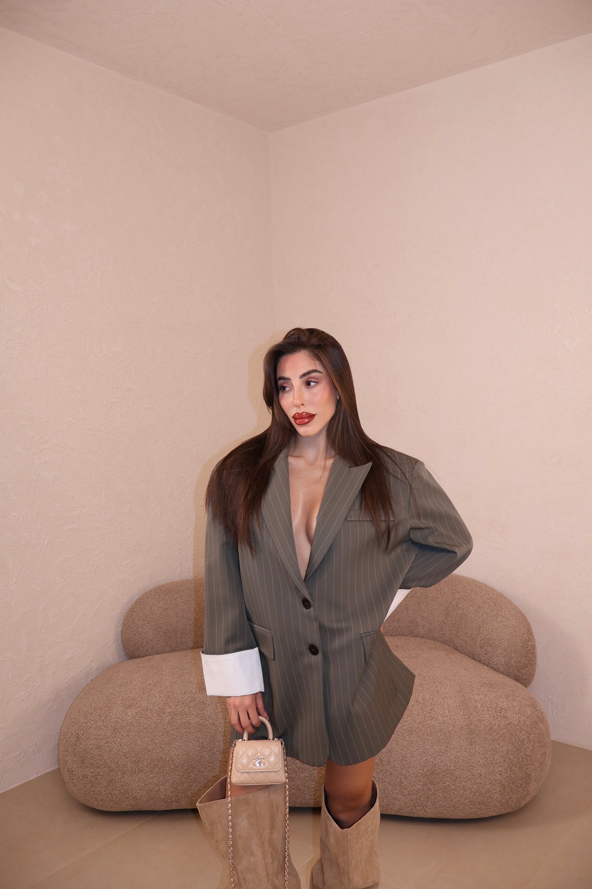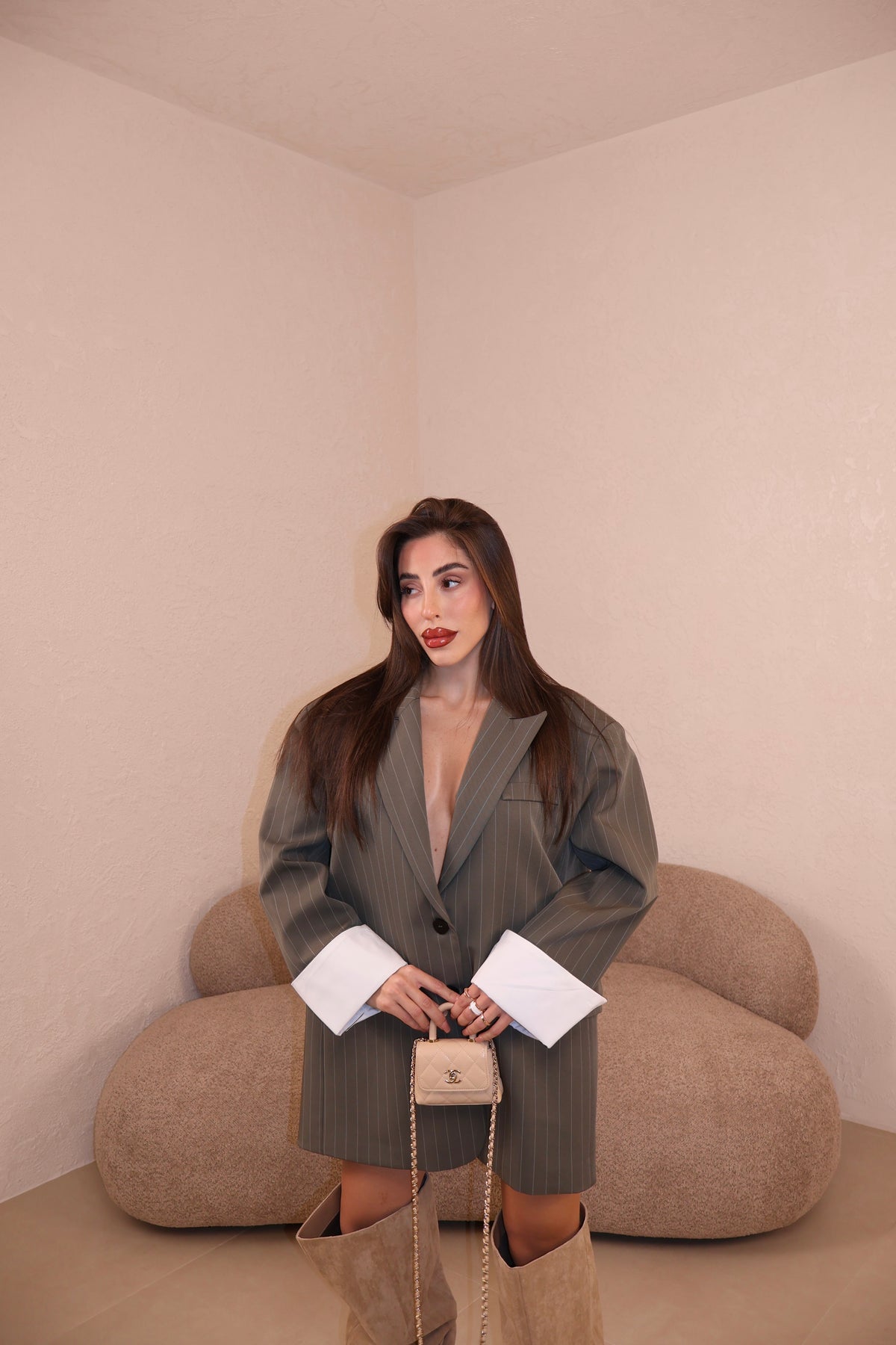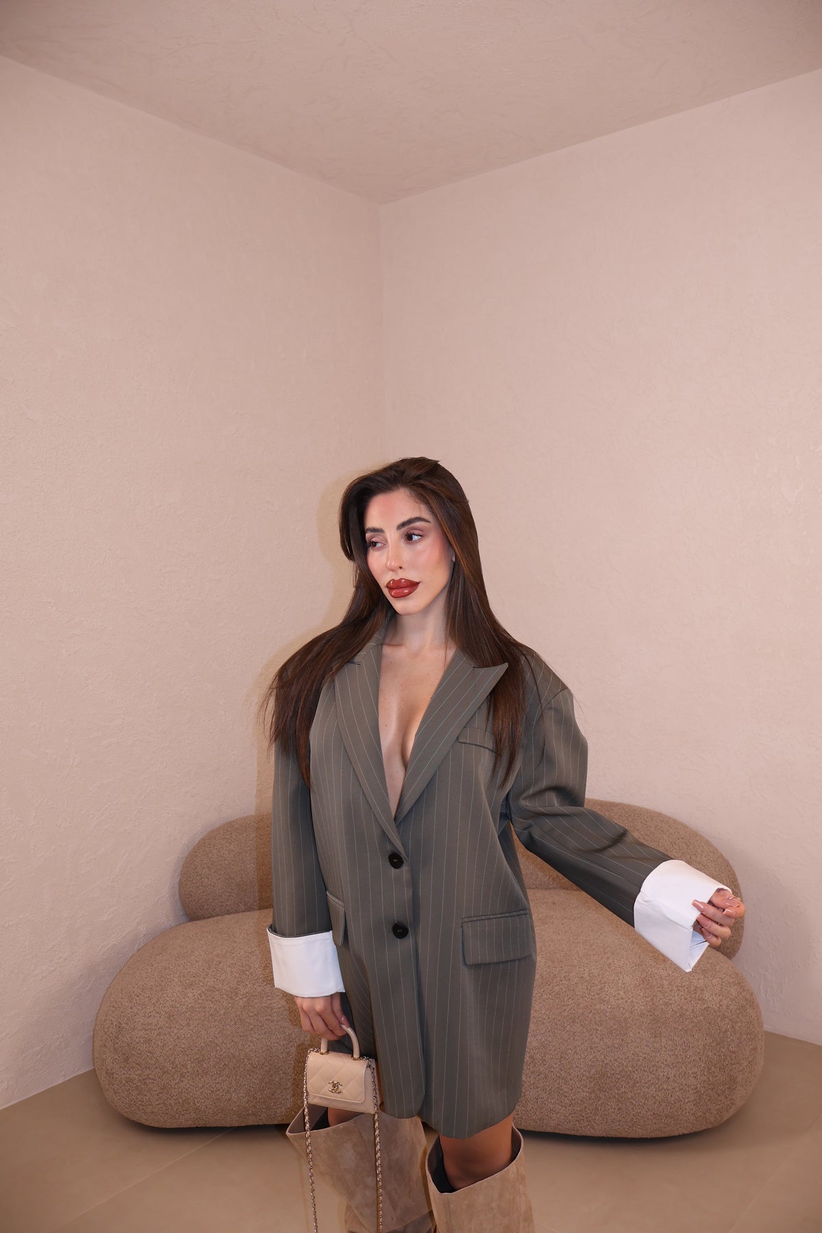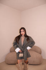 Giacca modello over gessata con dettaglio risvolto alle maniche. La modella indossa taglia S/M.