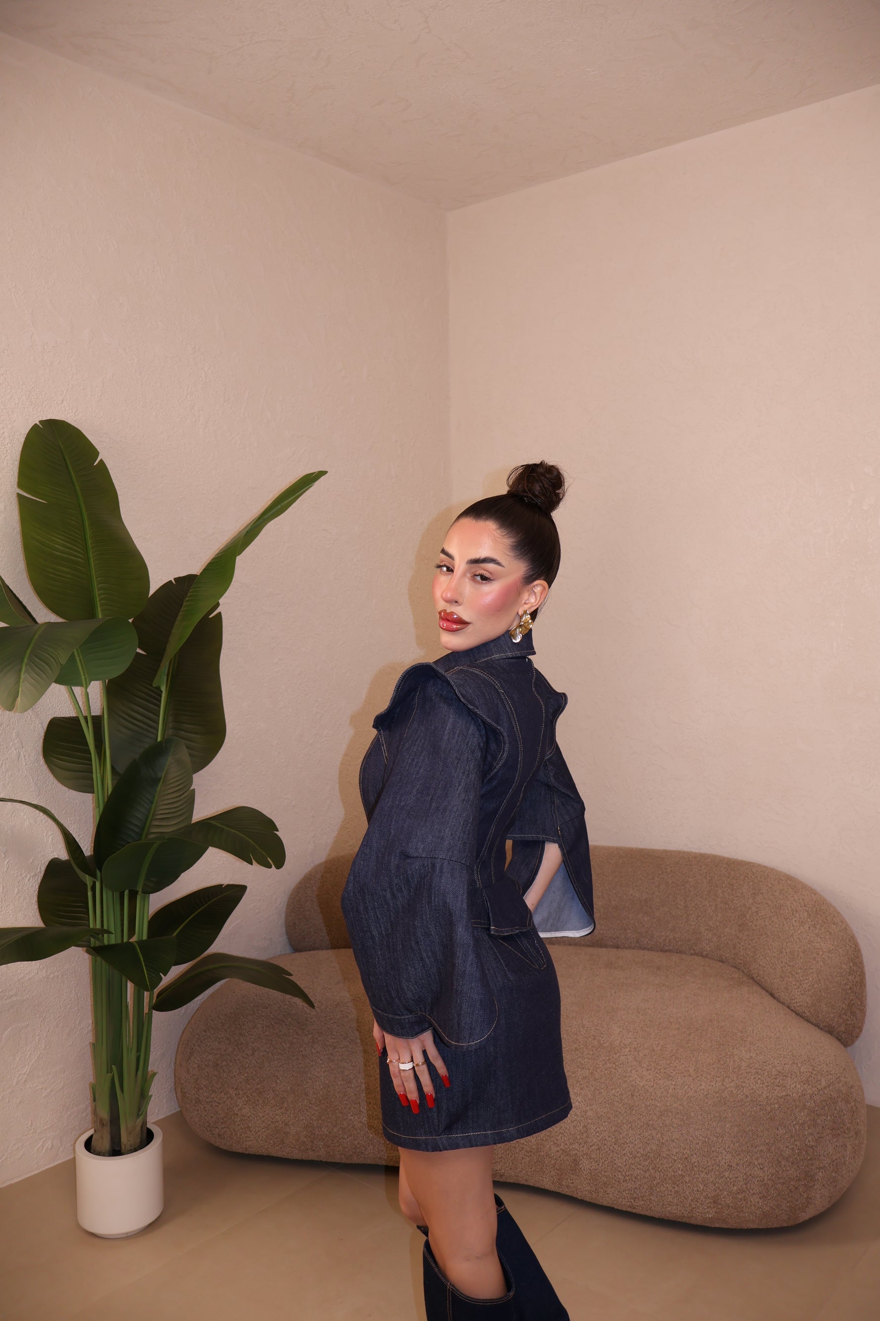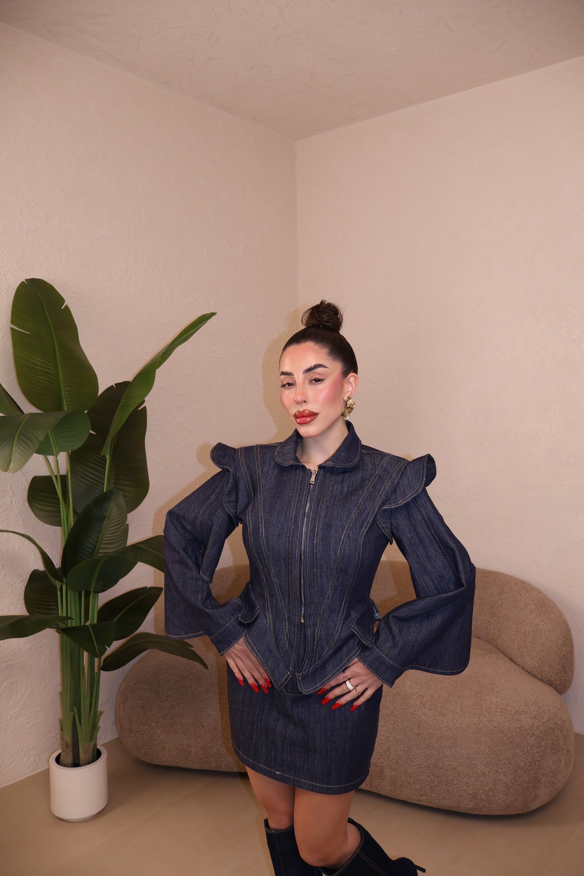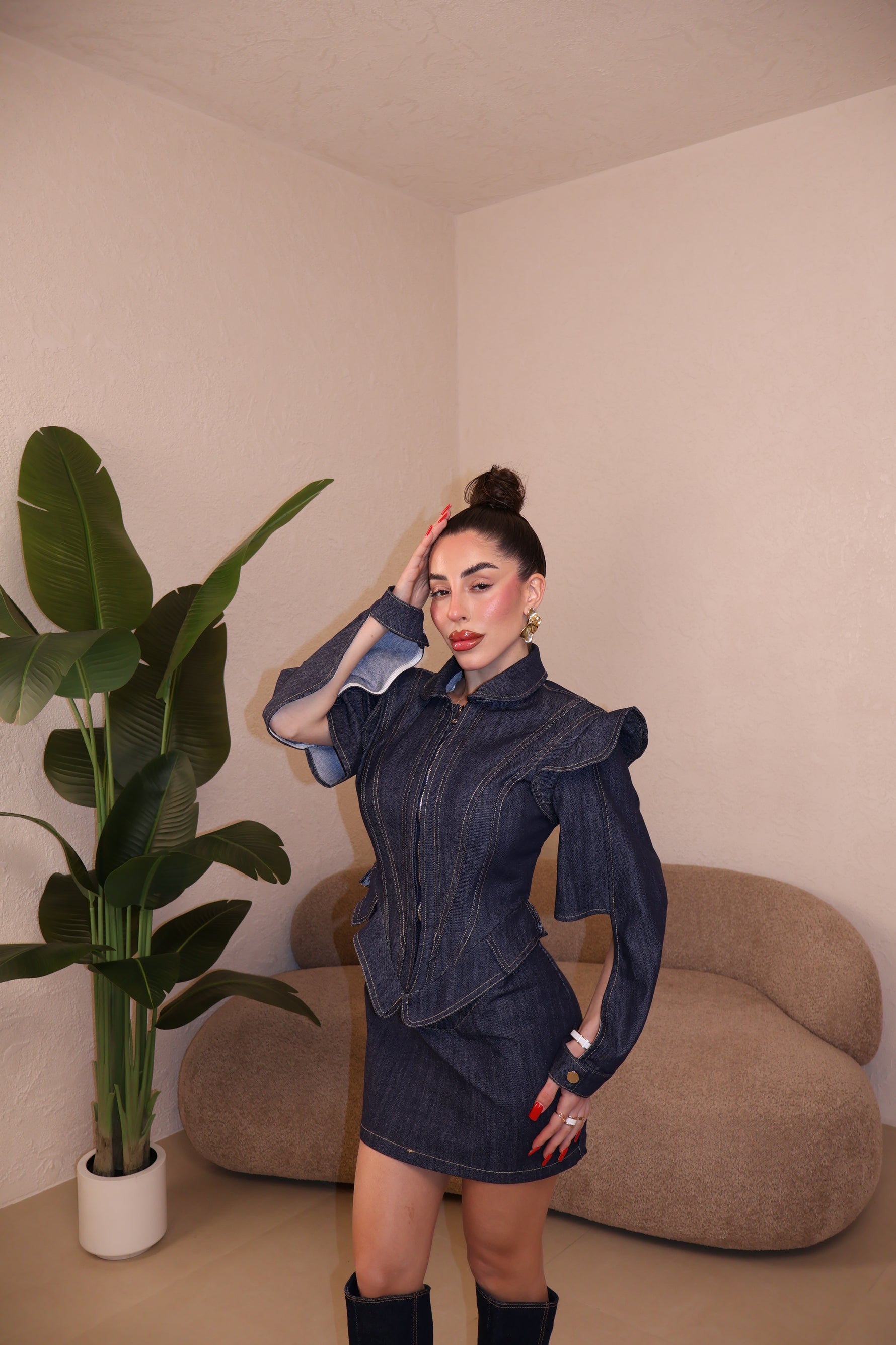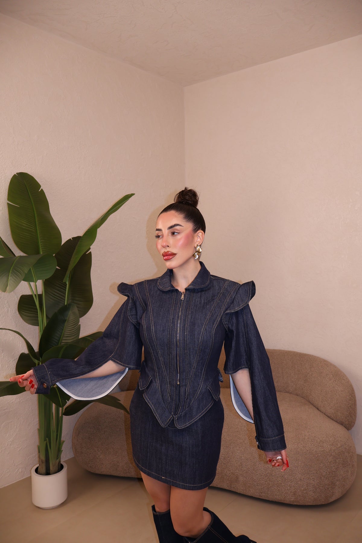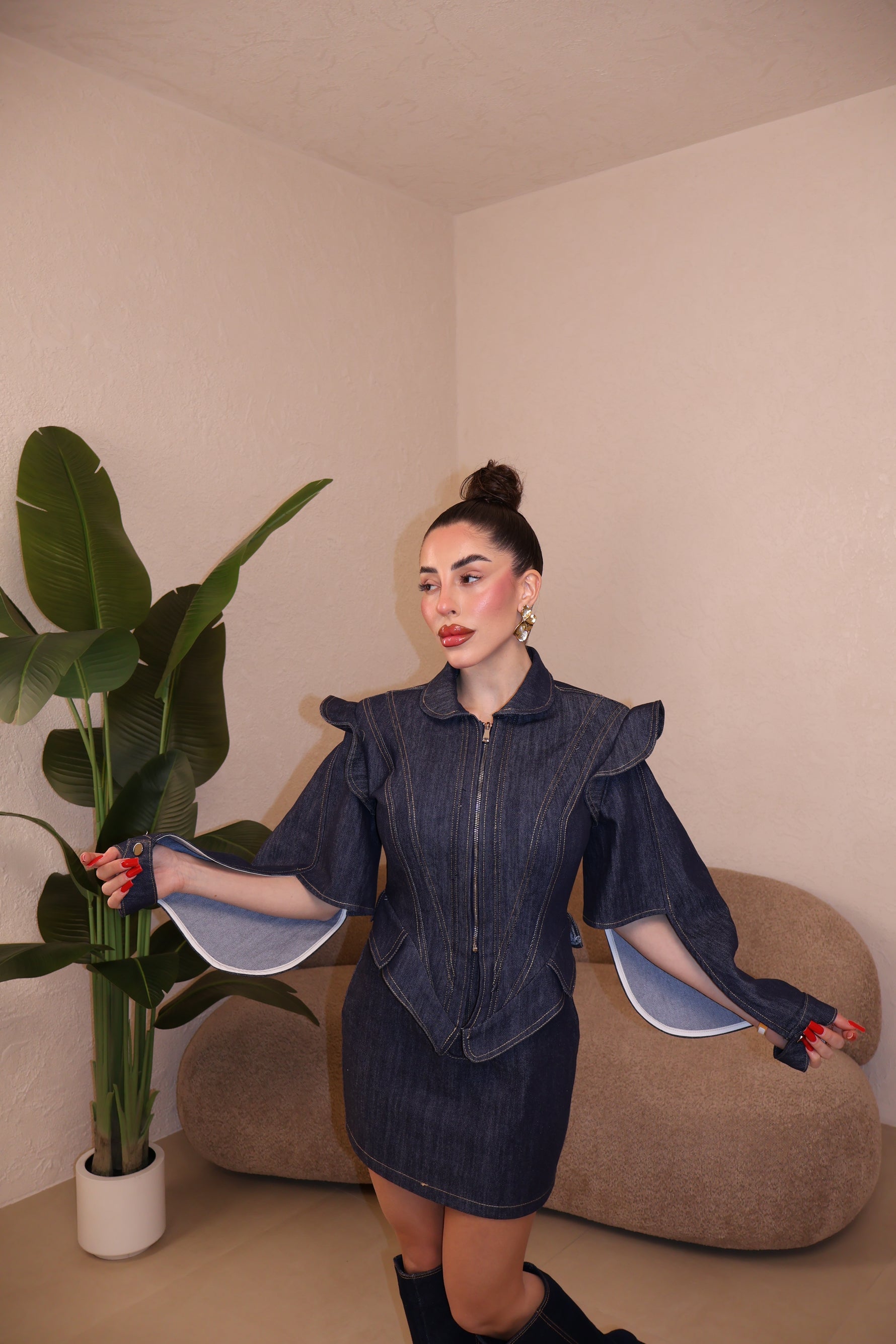 Giacca in denim con cerniera frontale e maniche aperte. Cuciture a contrasto. La modella indossa taglia S/M.