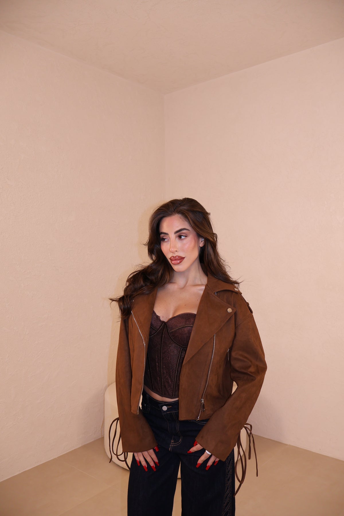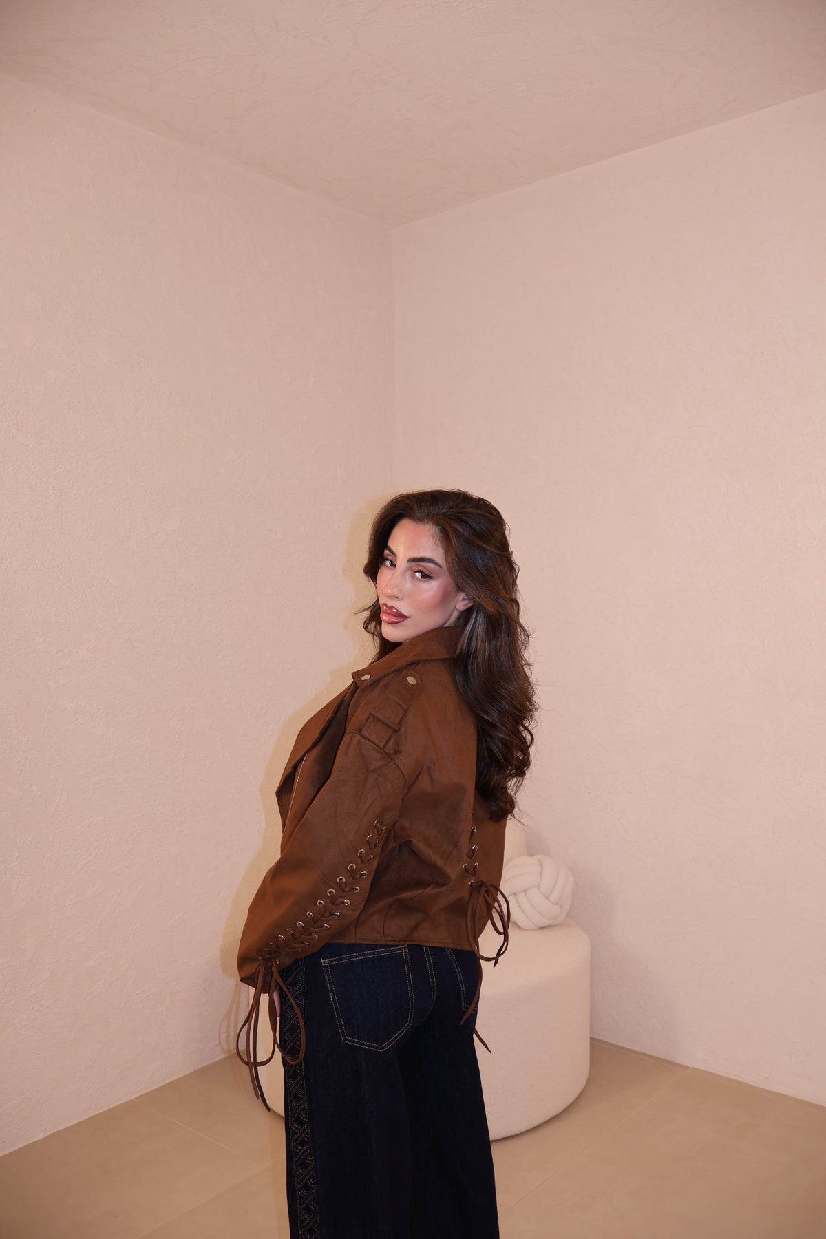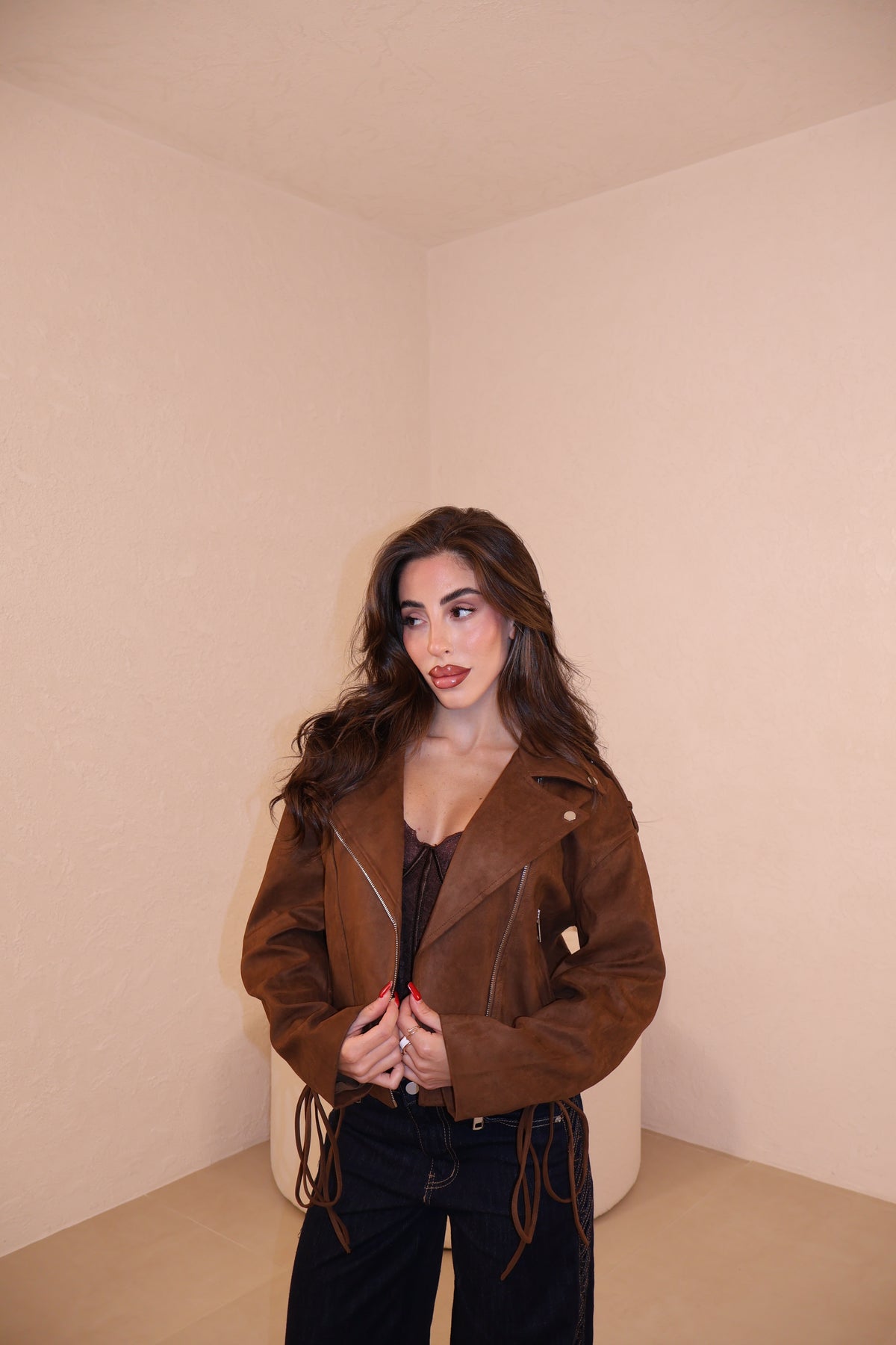 Prezzo unitario / perGiacca in camoscio con stringhe alle maniche e sul retro regolabili. Taglia unica.