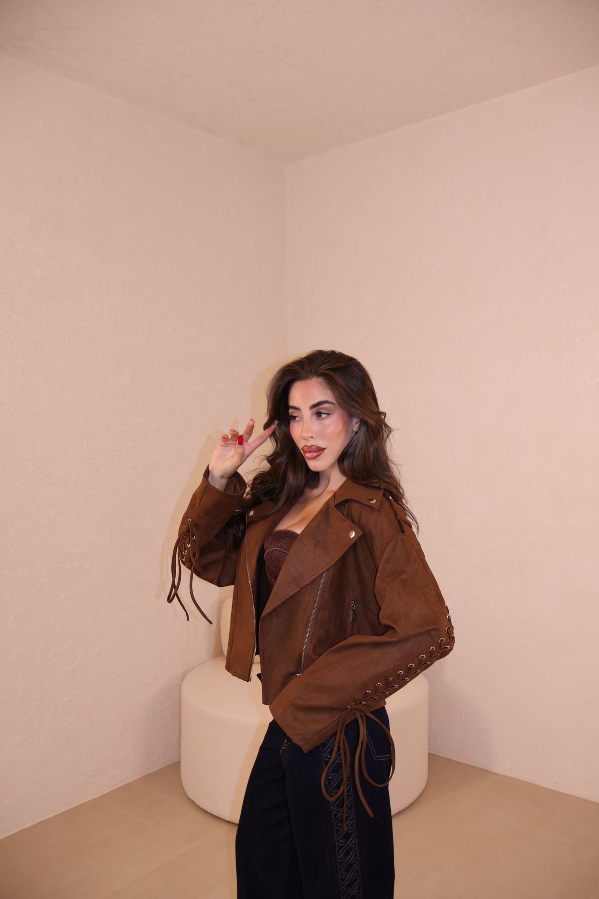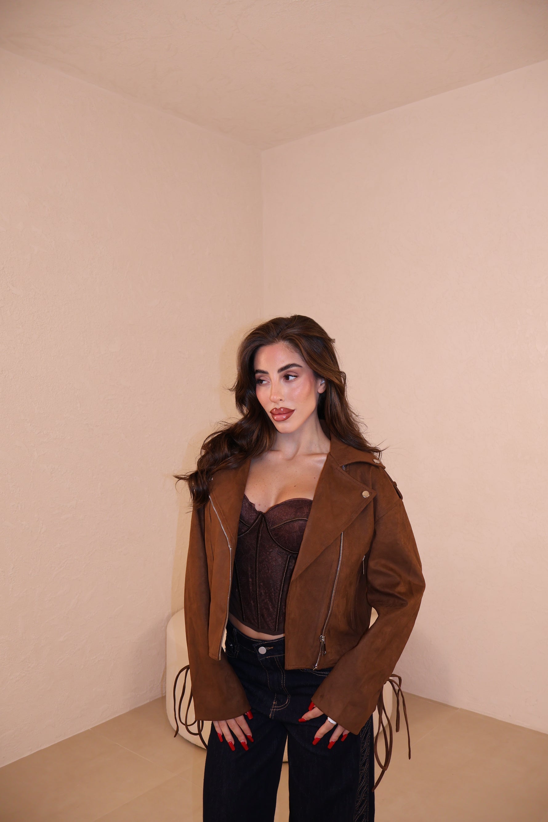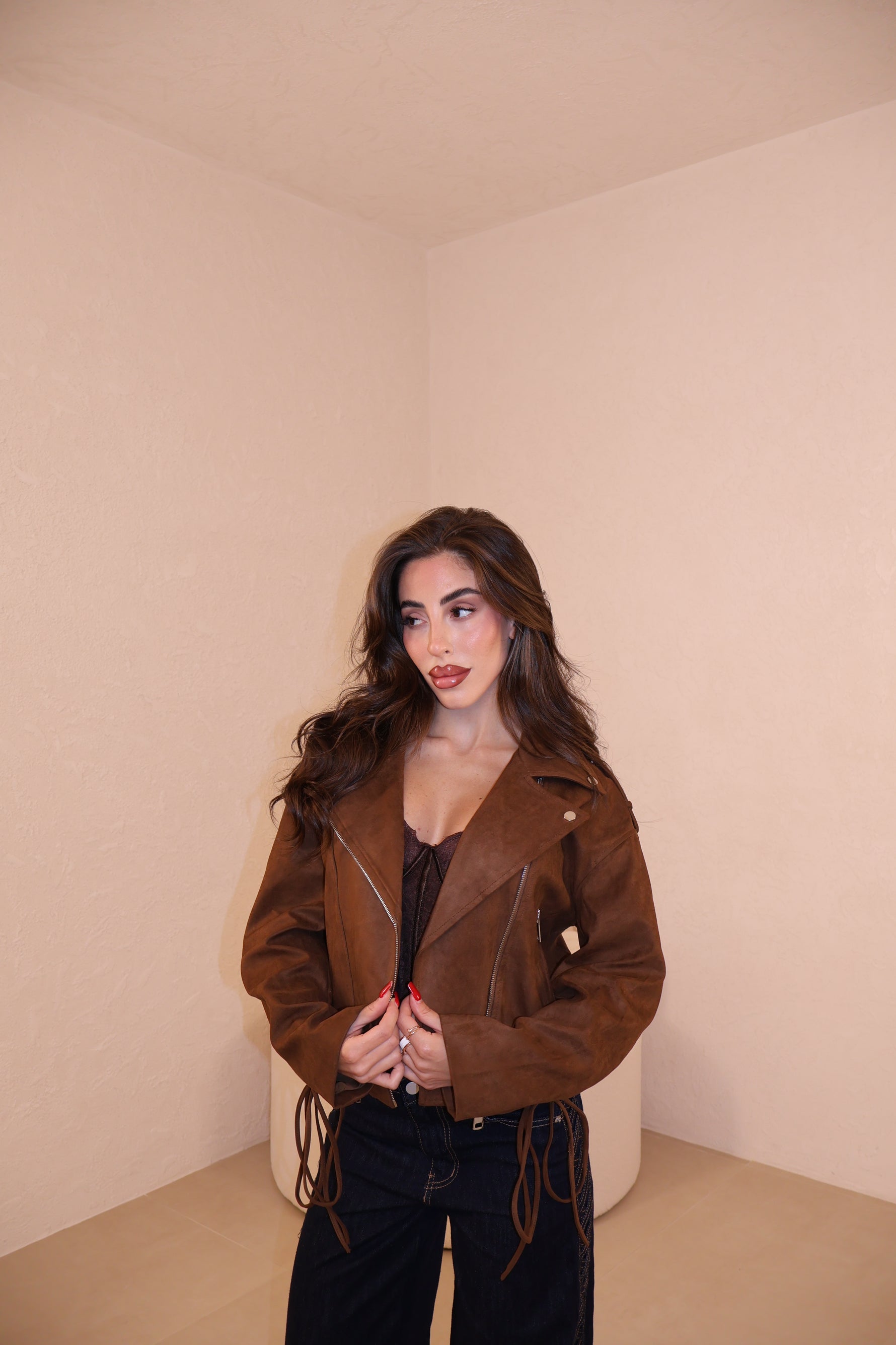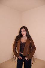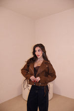 Giacca in camoscio con stringhe alle maniche e sul retro regolabili. Taglia unica.