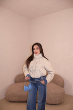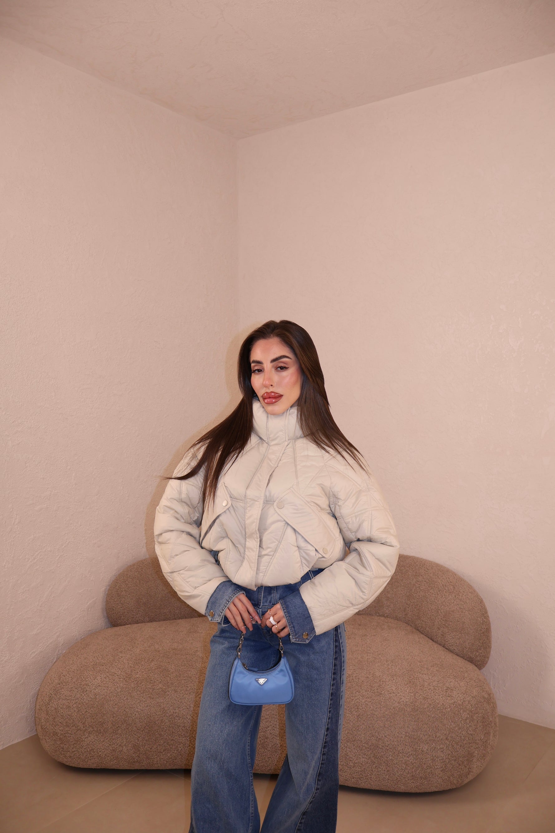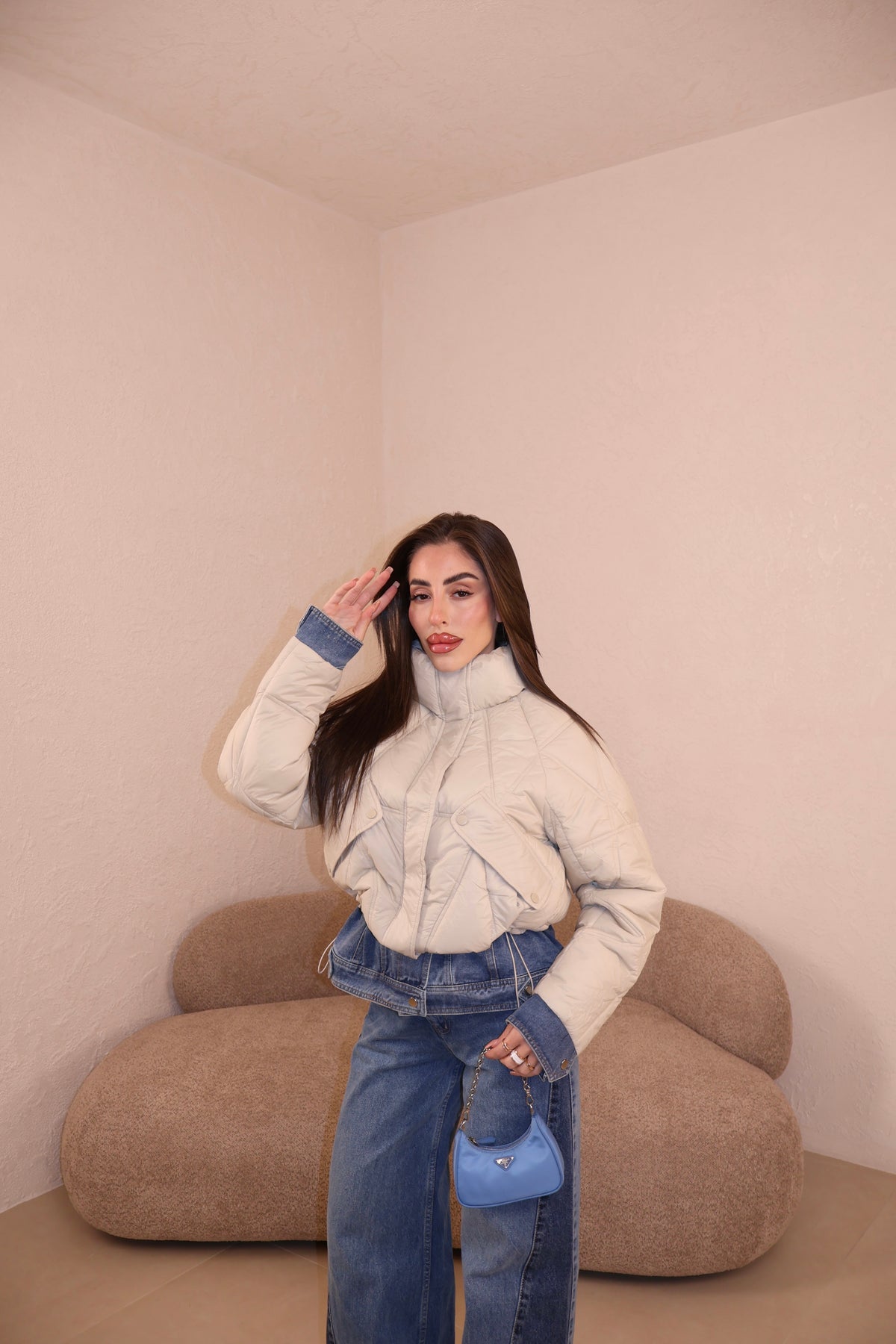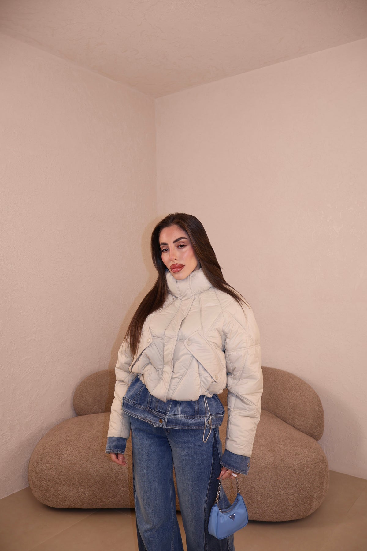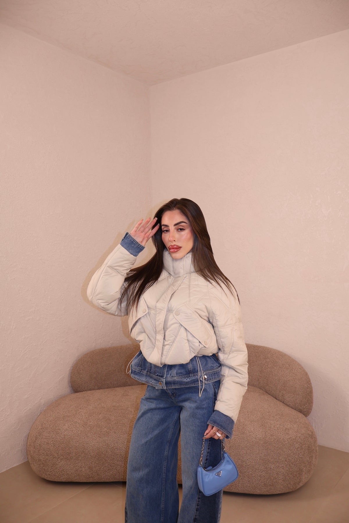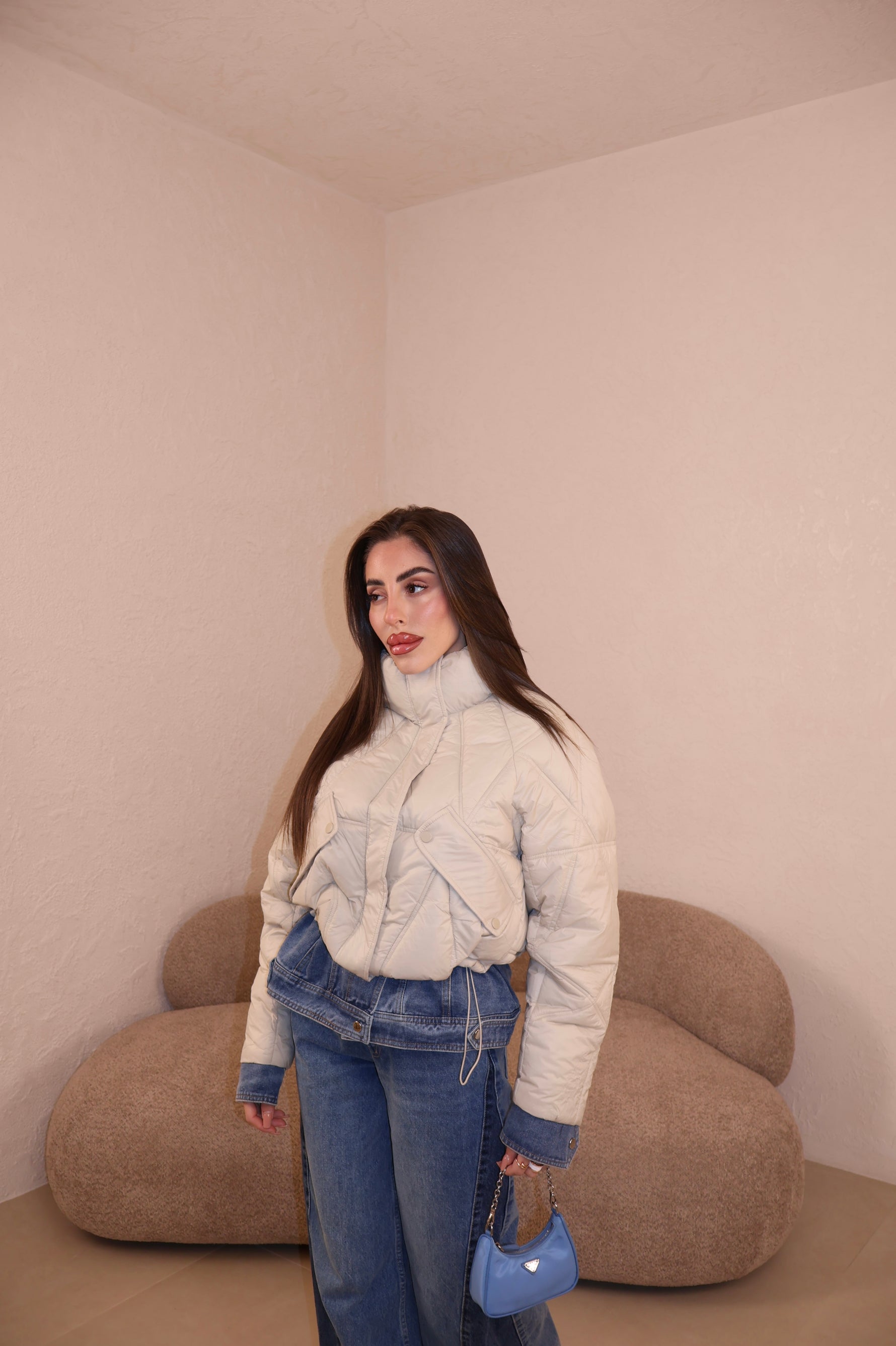 Piumino imbottito con collo alto e dettagli in denim sul fondo e sulle maniche. Chiusura con cerniera nascosta. La modella indossa taglia S.