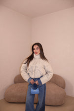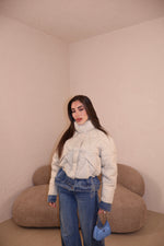 Prezzo unitario / perPiumino imbottito con collo alto e dettagli in denim sul fondo e sulle maniche. Chiusura con cerniera nascosta. La modella indossa taglia S.