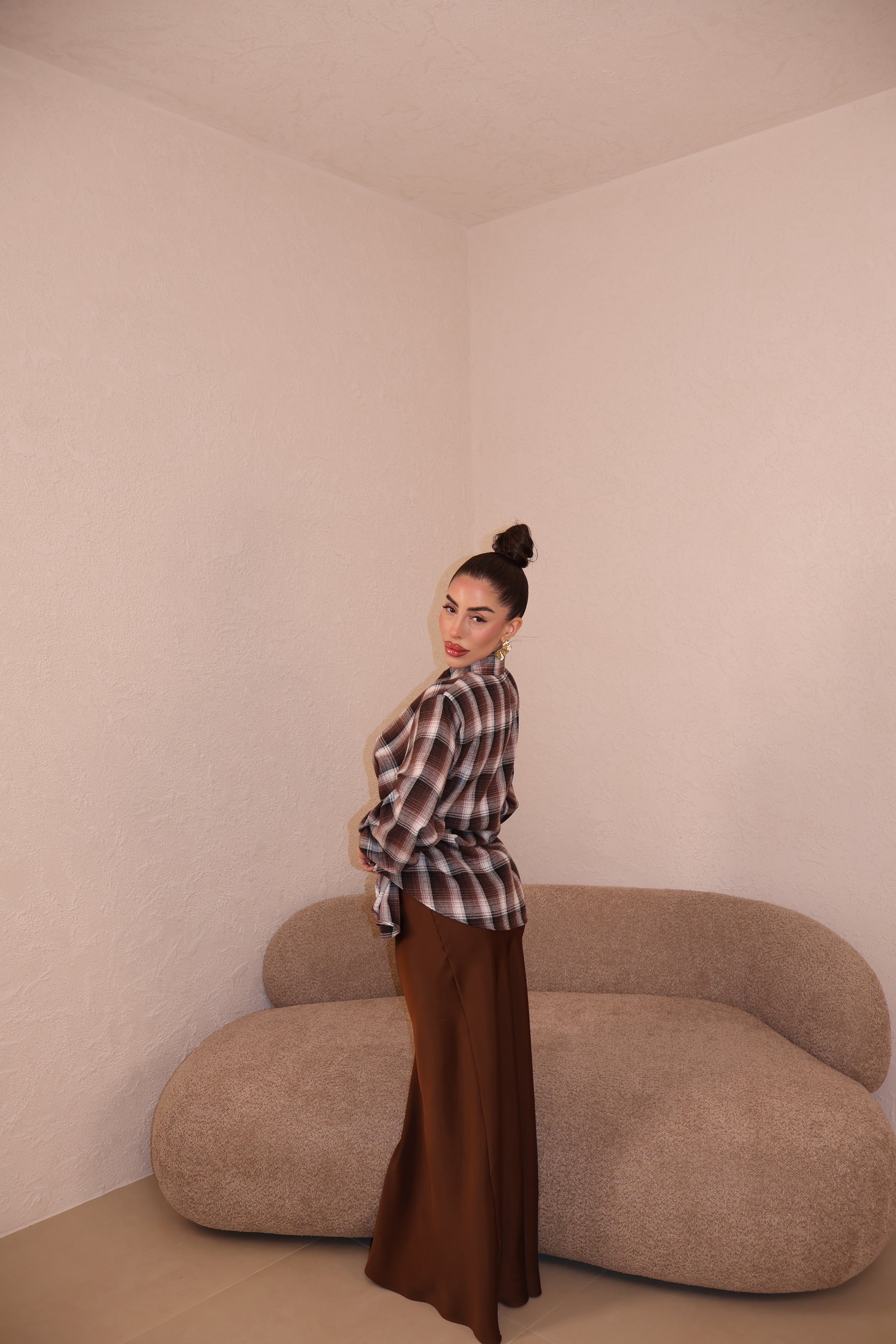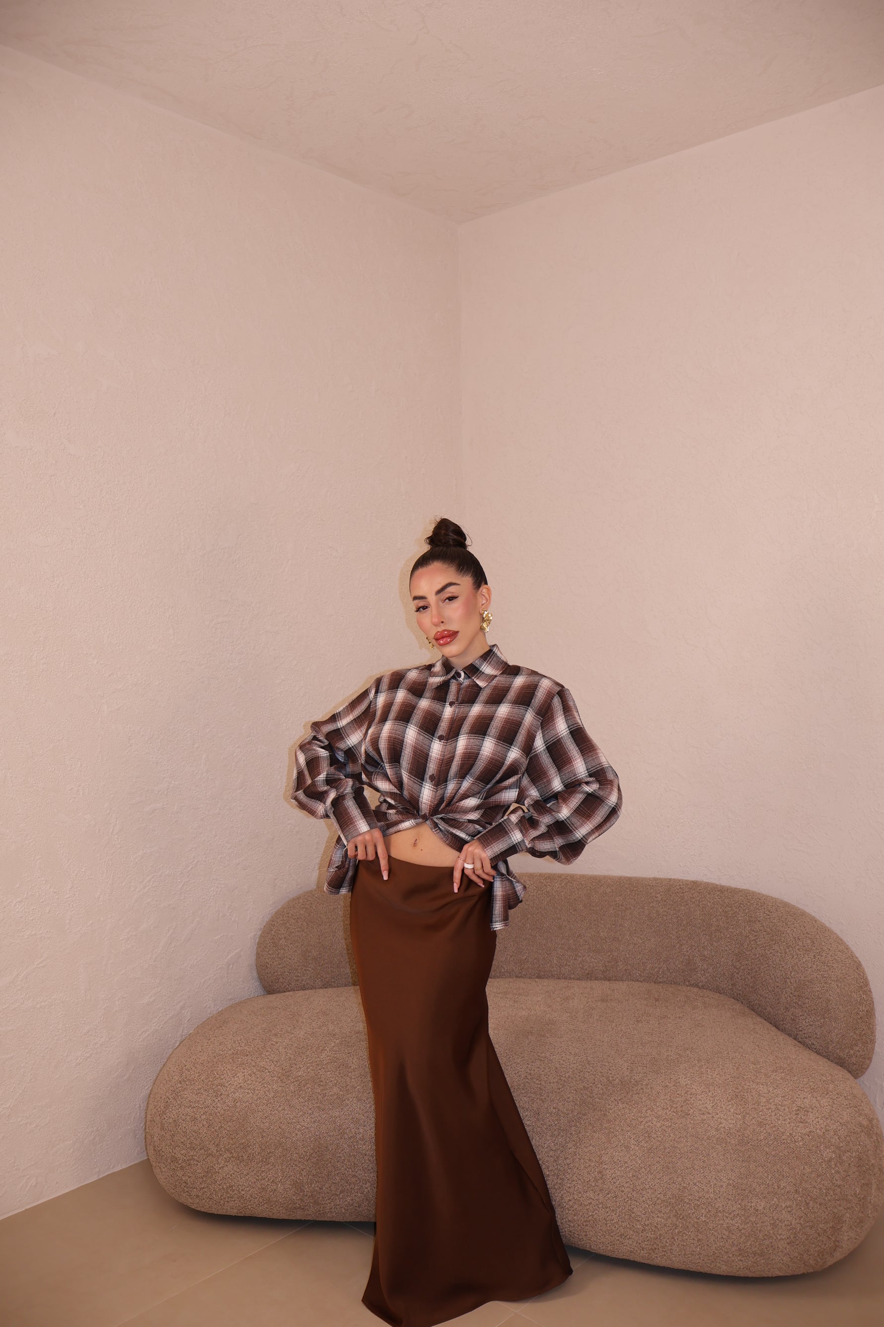 Gonna in raso con elastico in vita. Vestibilità morbida. La modella indossa taglia S.