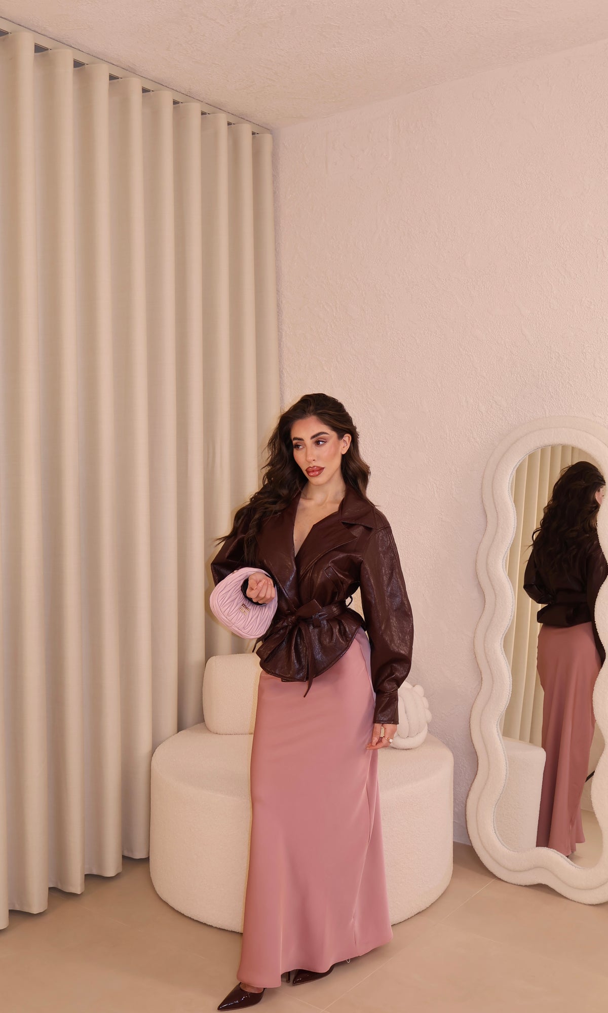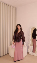 Gonna lunga in raso con elastico in vita. La modella indossa taglia S/M