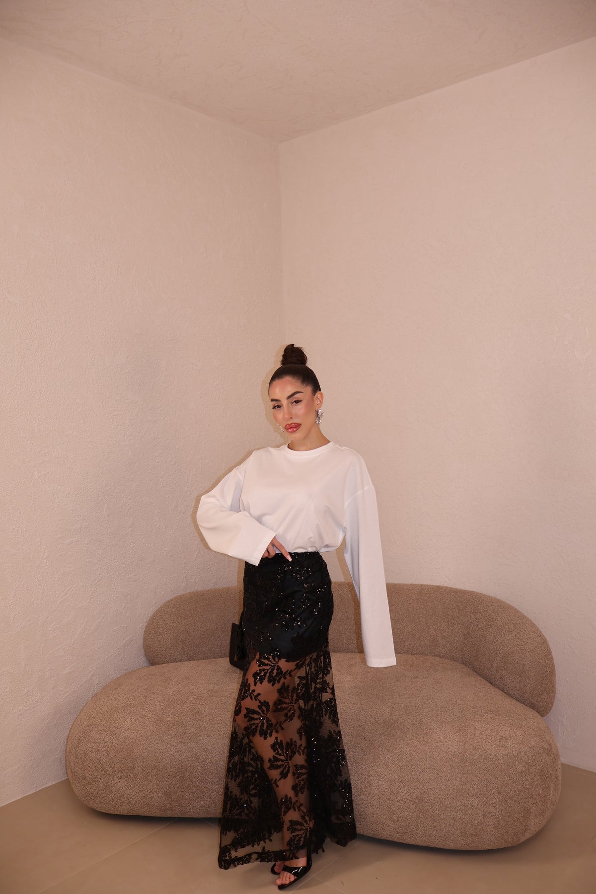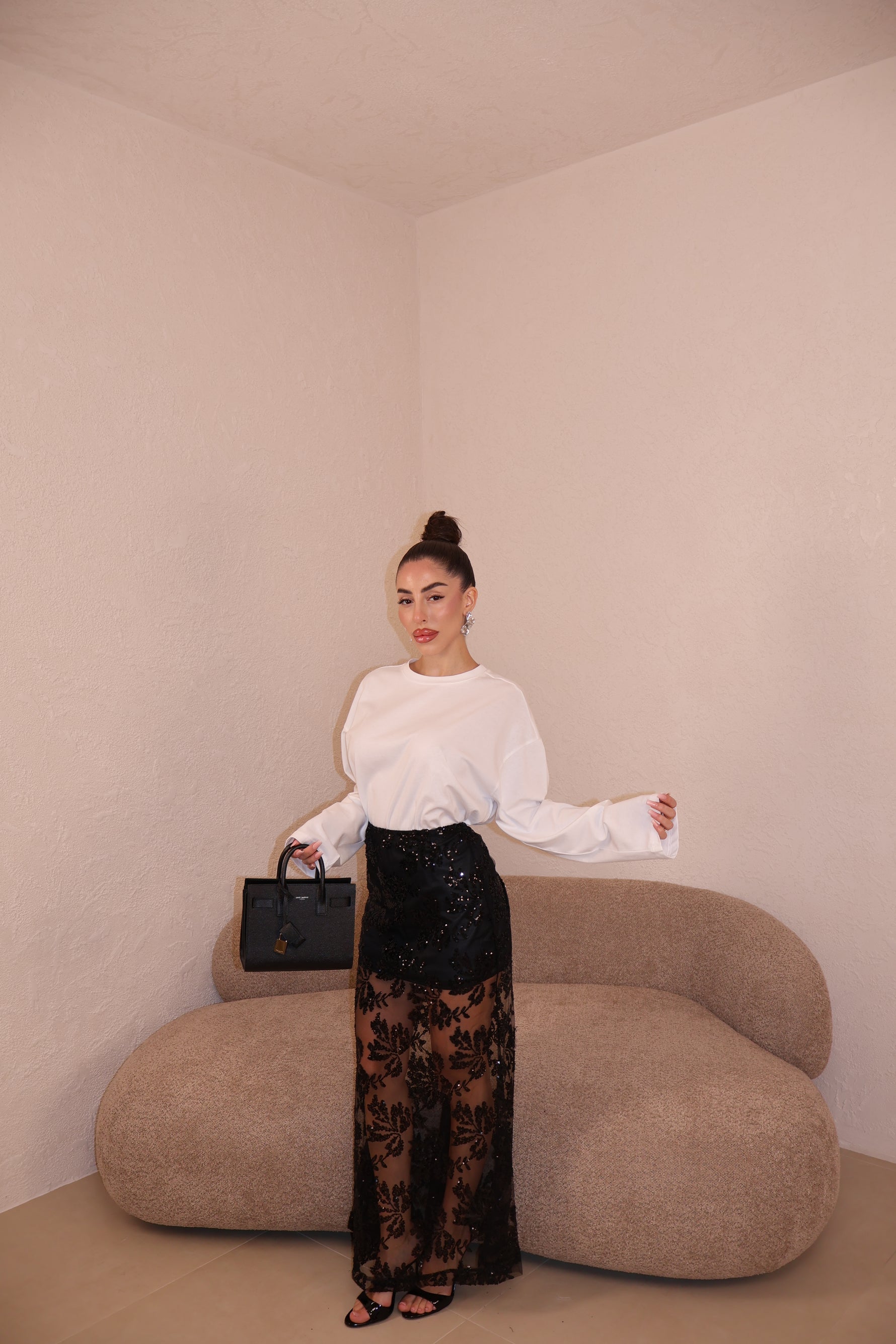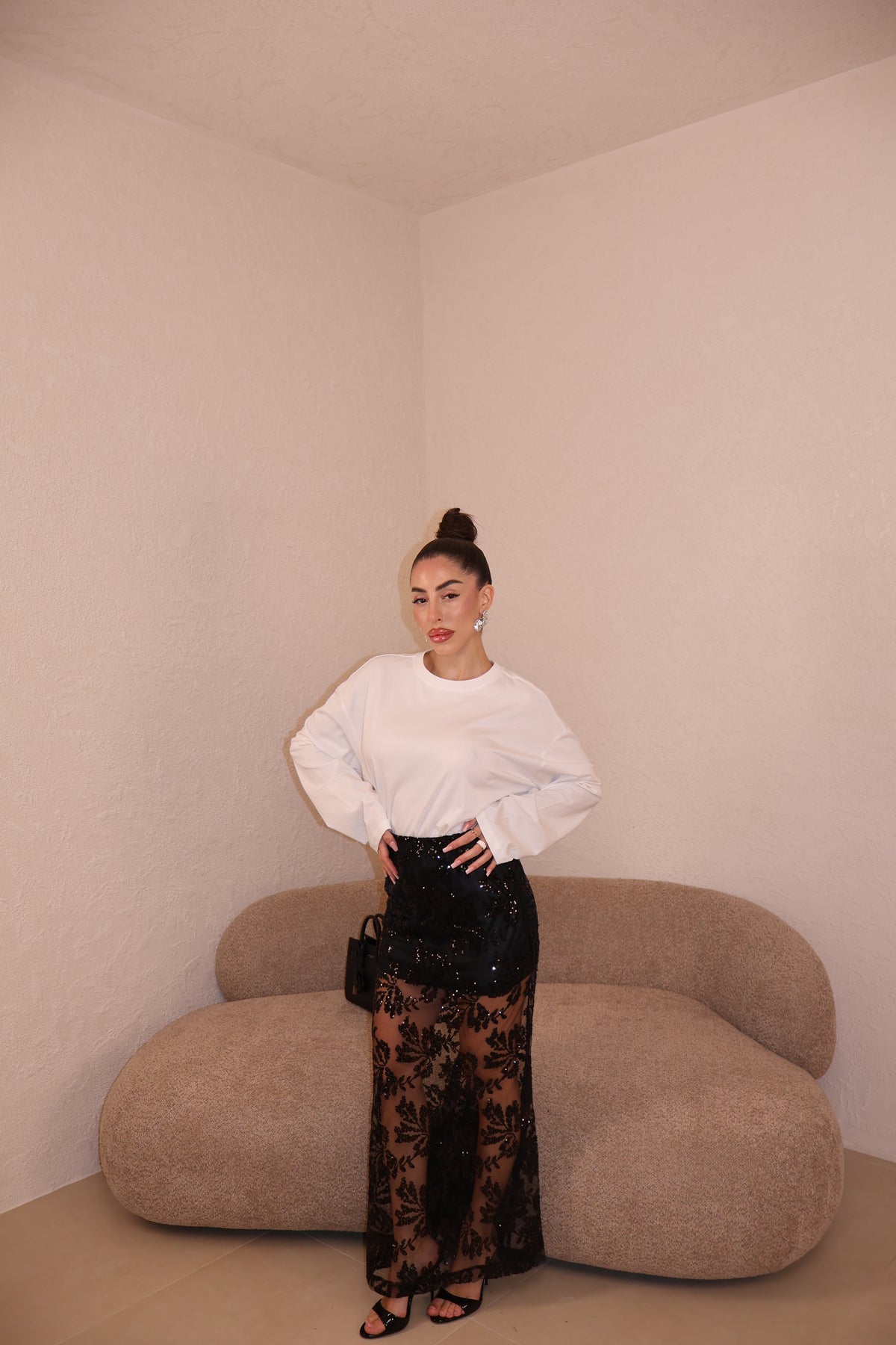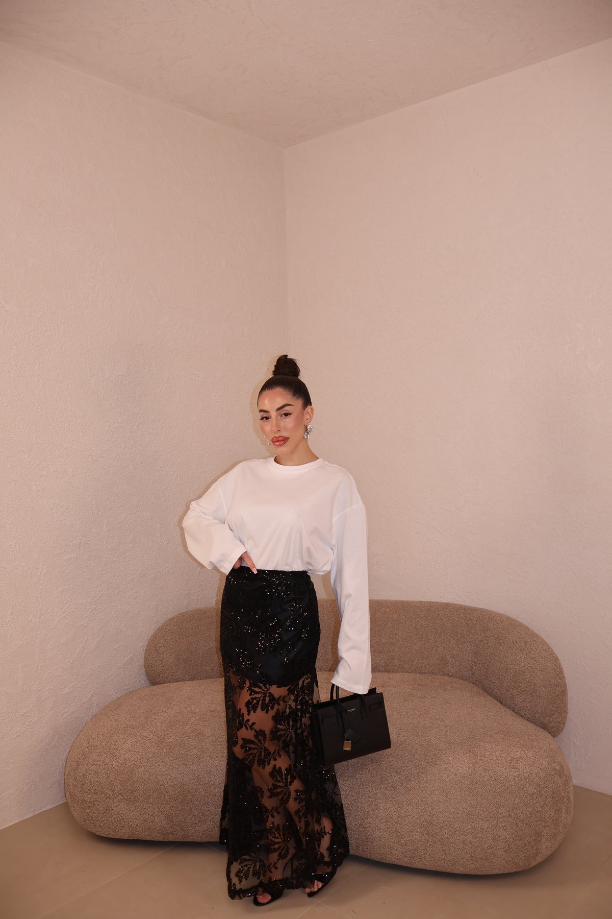 Gonna lunga con dettagli a contrasto in paillettes. Elastico in vita. Sottogonna in raso. La modella indossa taglia S.