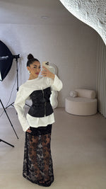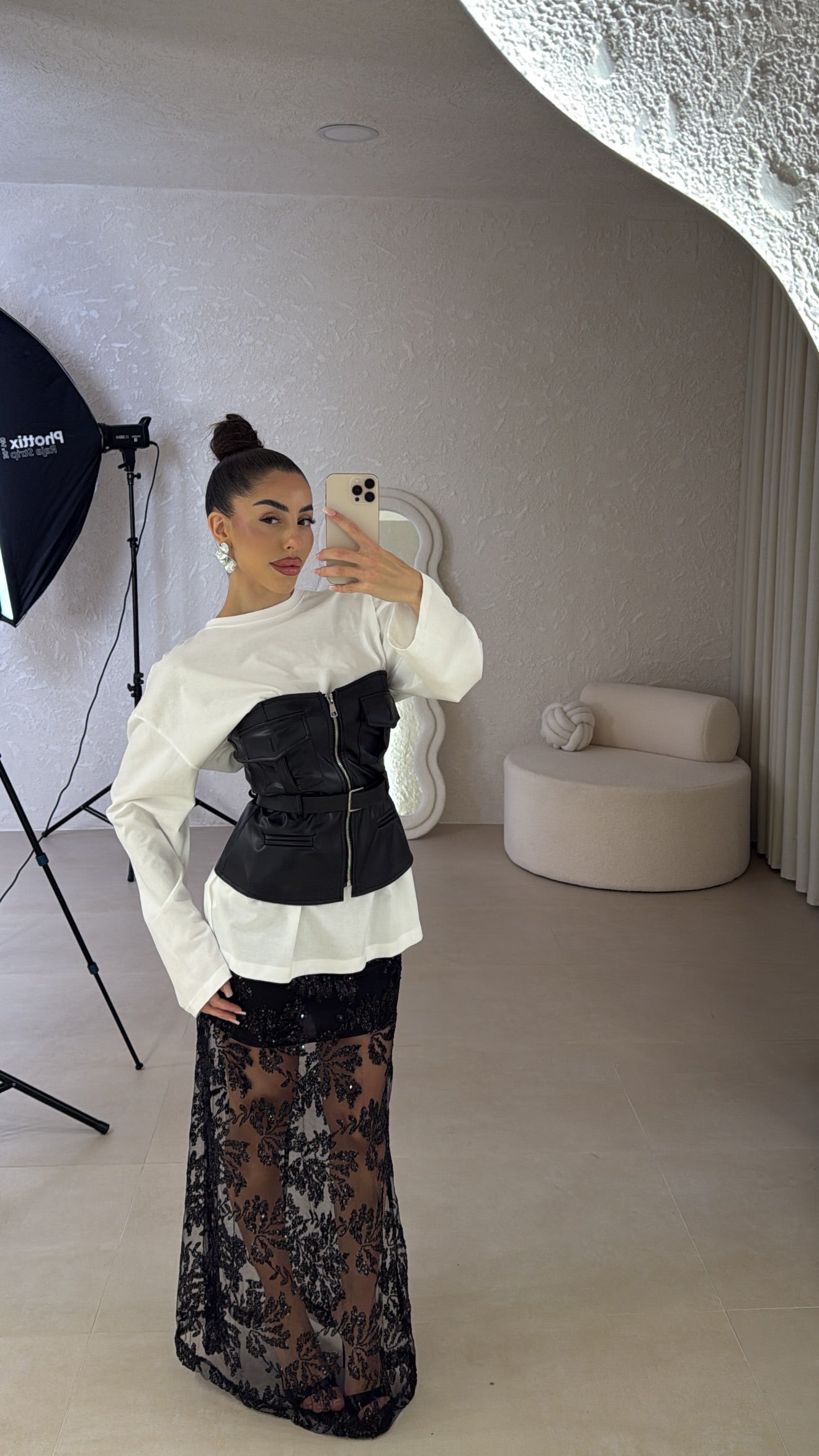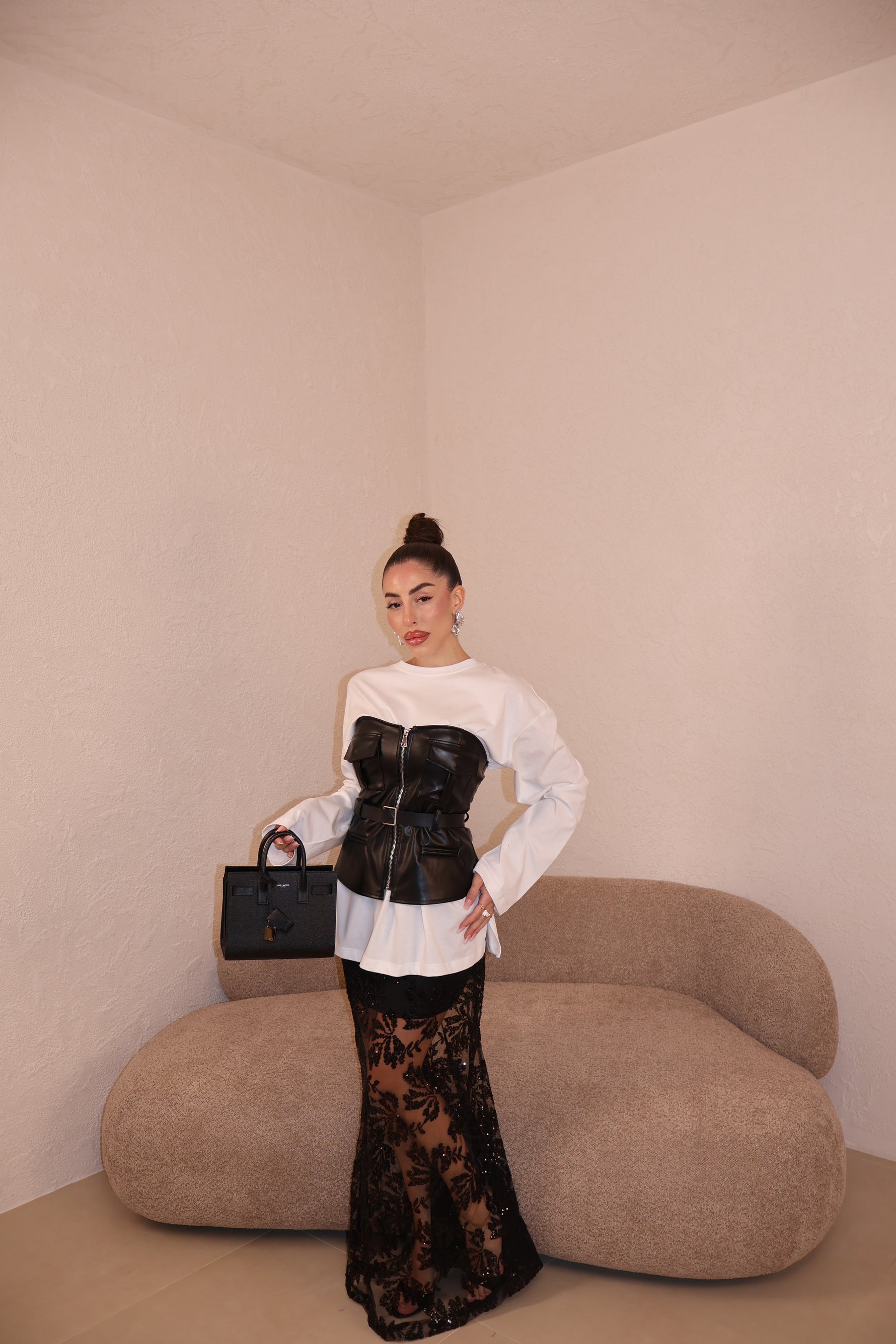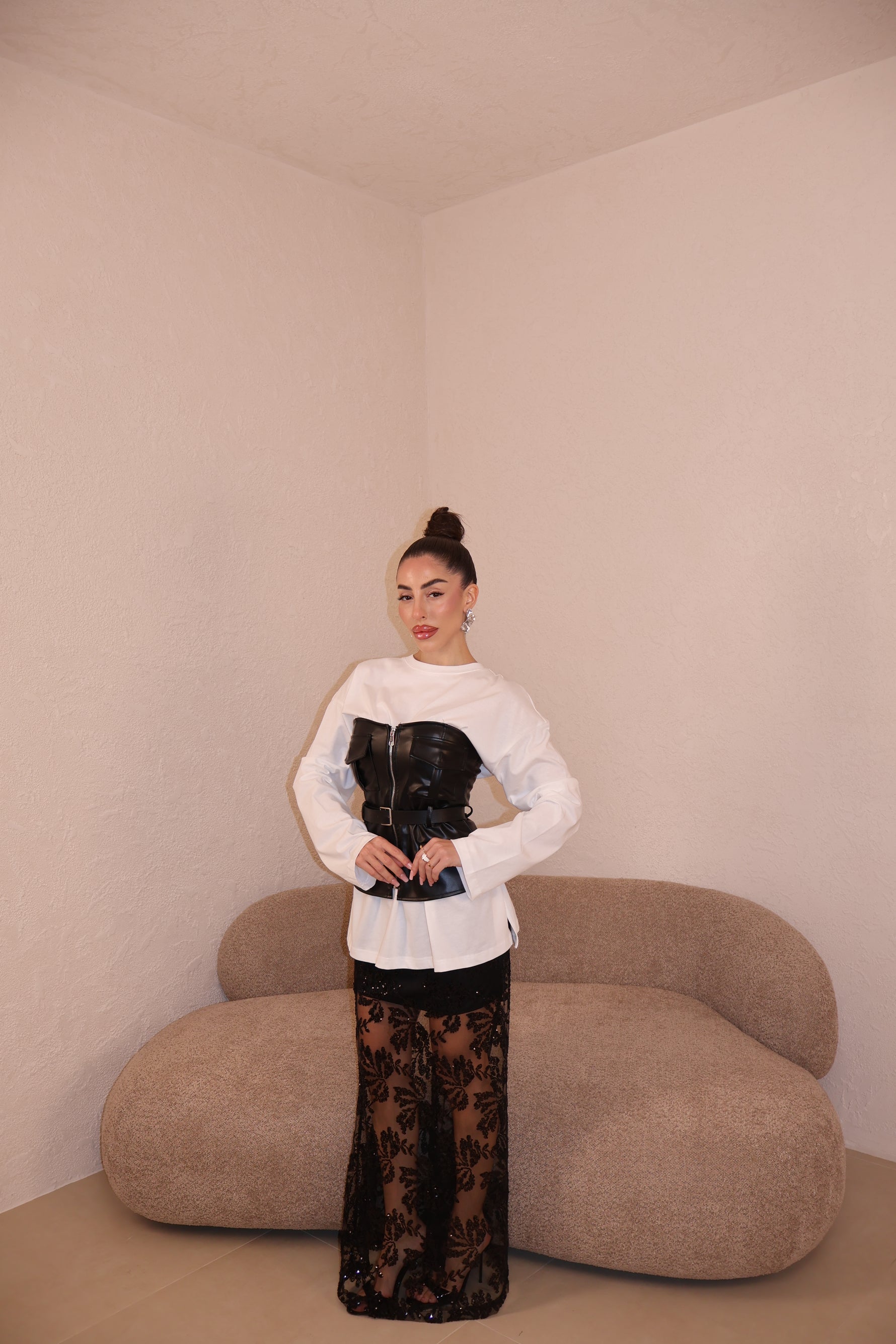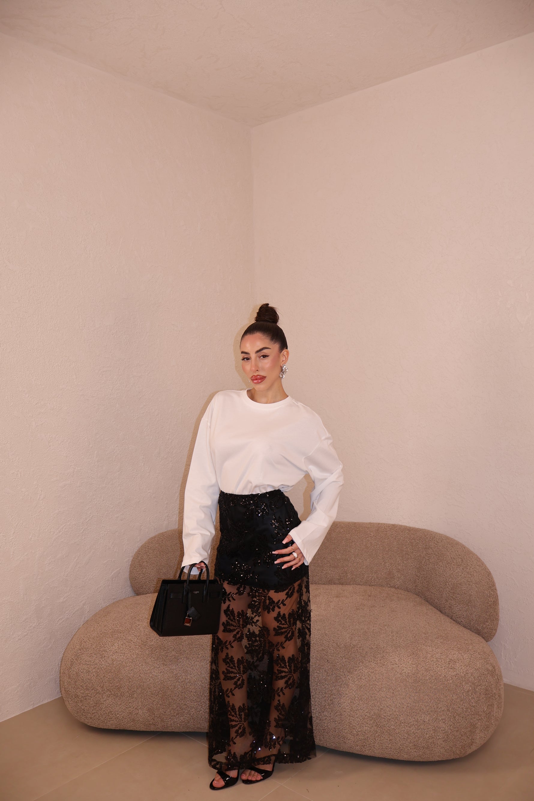 Gonna lunga con dettagli a contrasto in paillettes. Elastico in vita. Sottogonna in raso. La modella indossa taglia S.