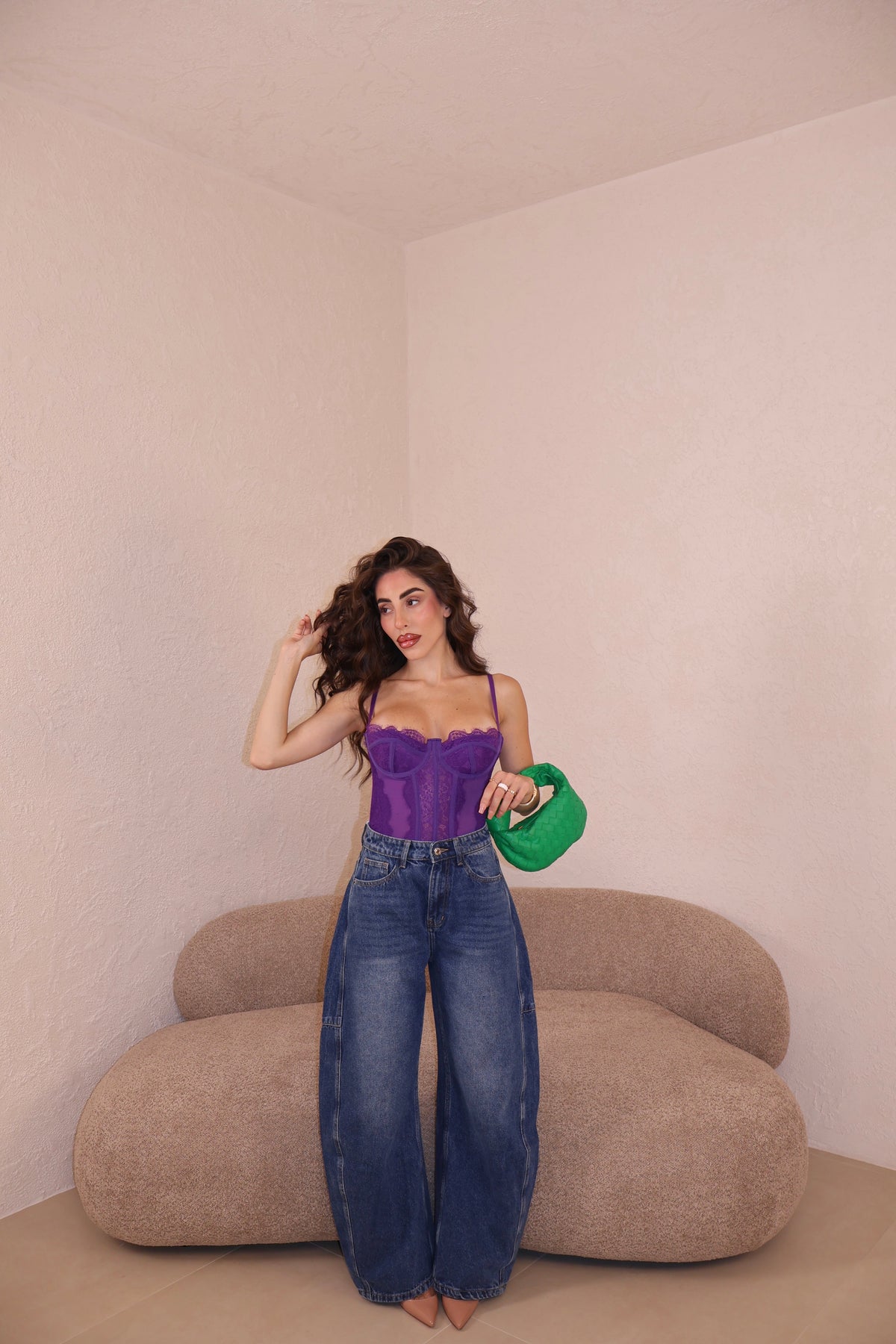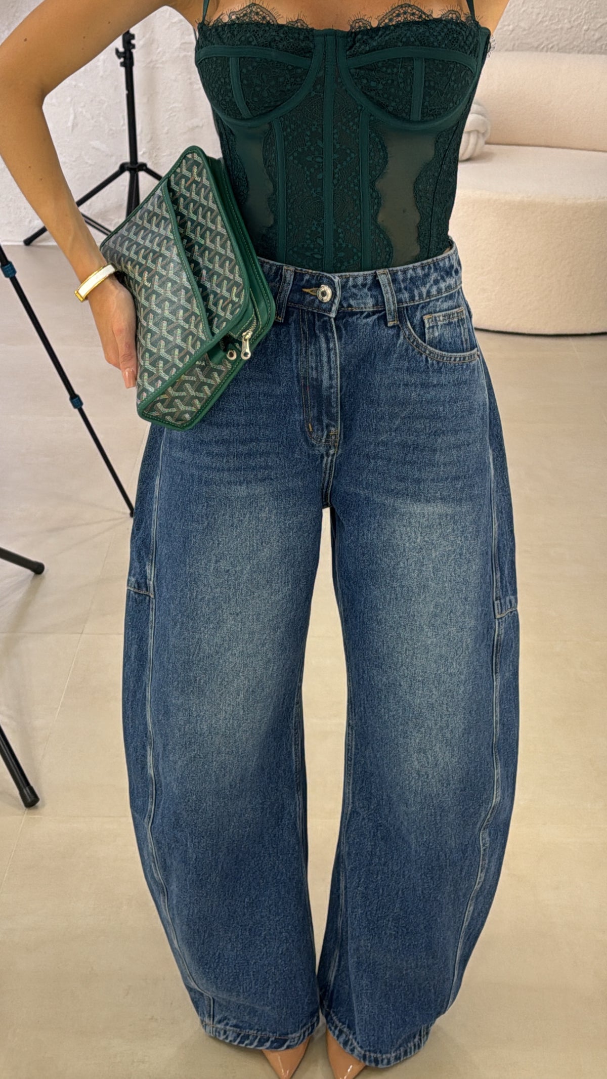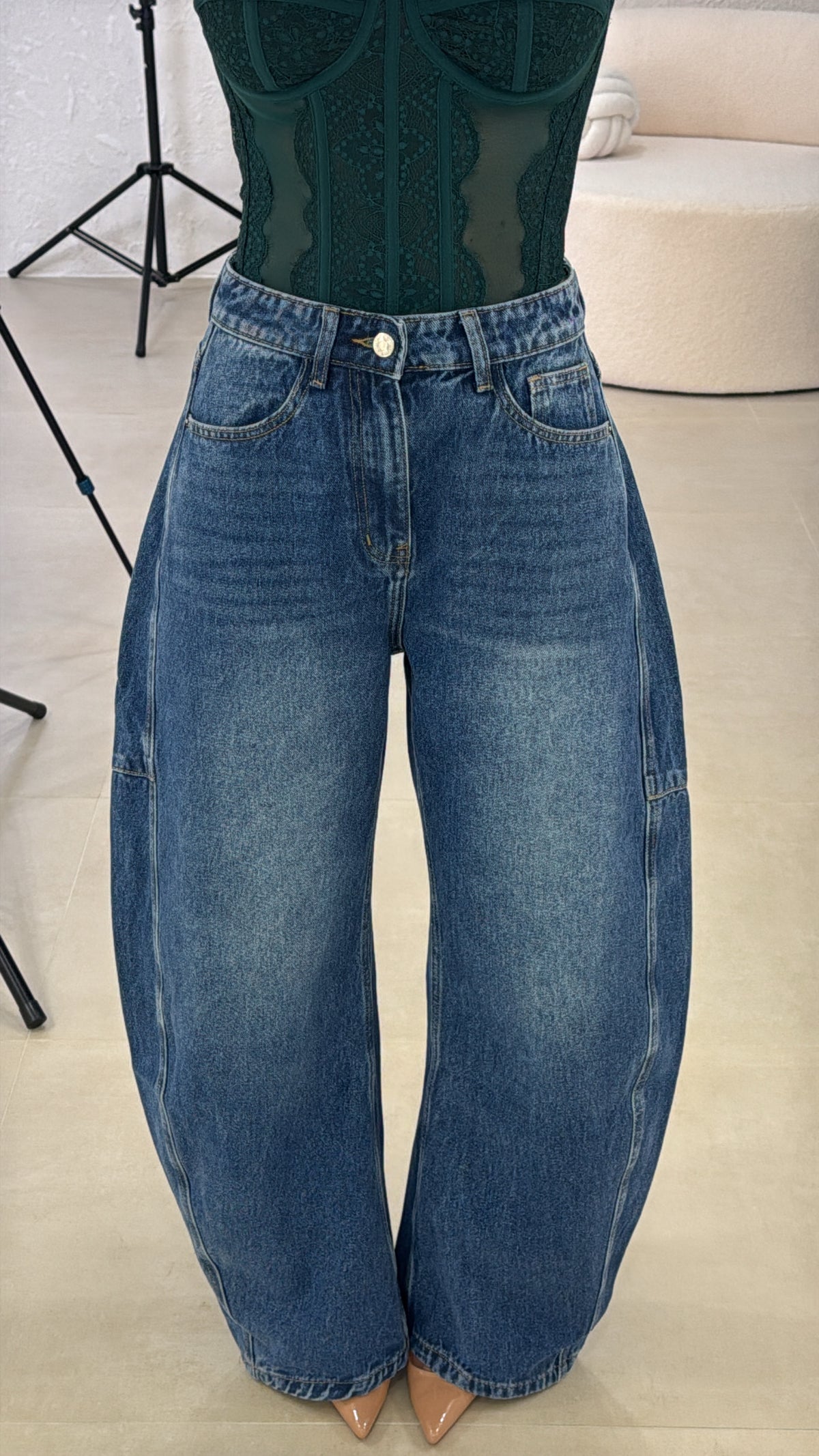 Jeans modello balloon in denim blu con cuciture laterali. Vestibilità regolare. La modella indossa XS.