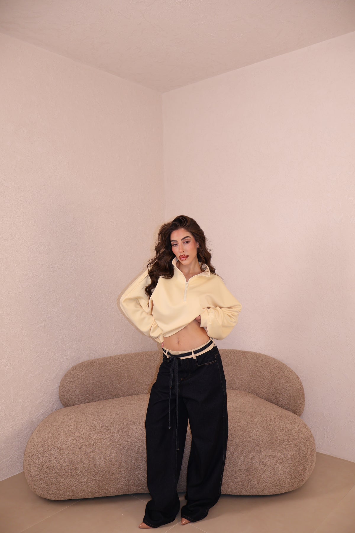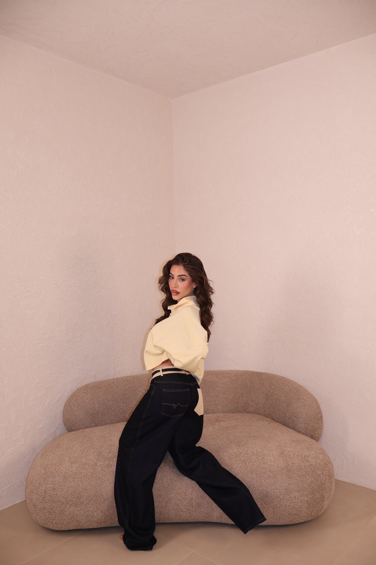Jeans scuro con cuciture a contrasto e cintura in vita in jeans. La modella indossa S.