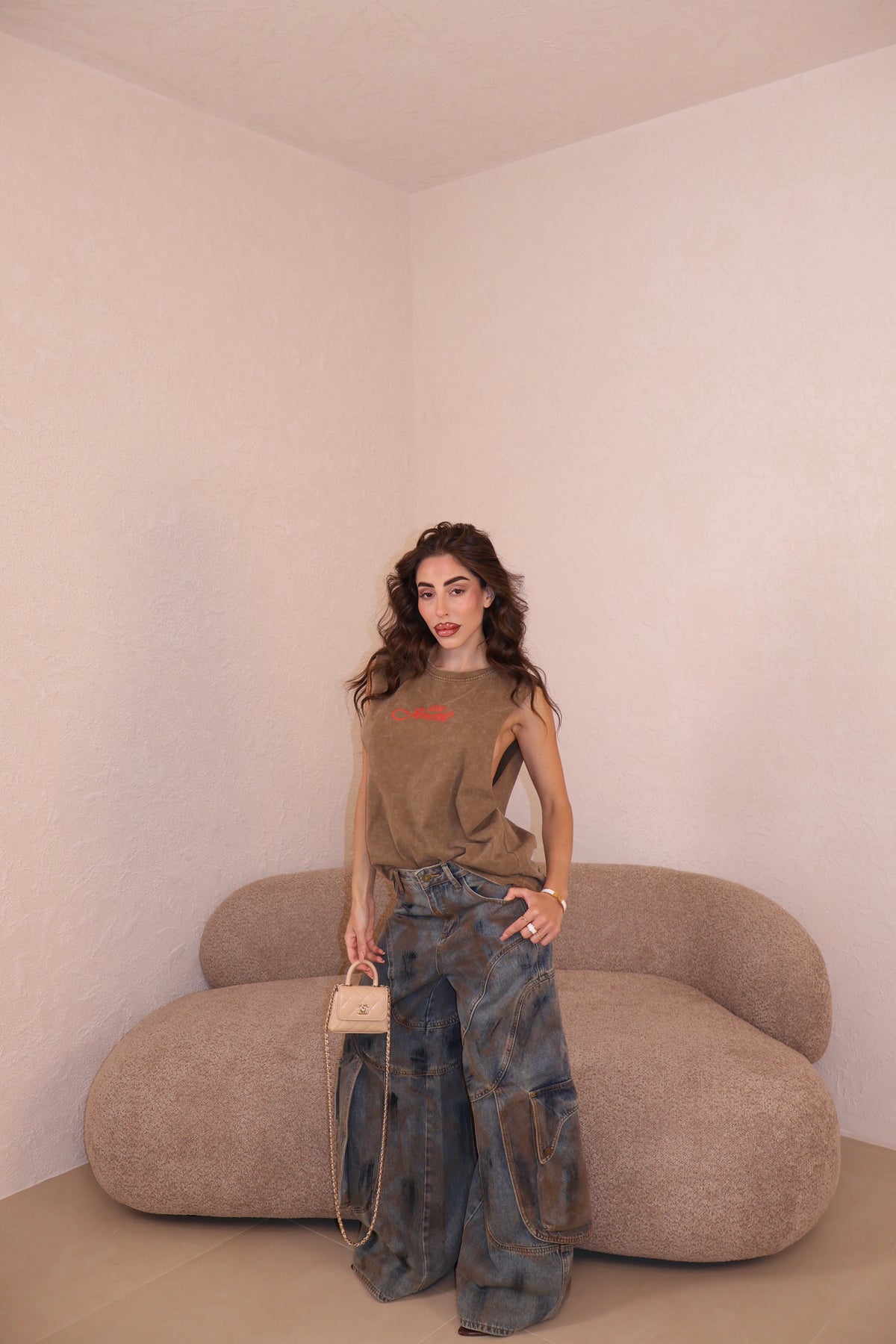 Jeans modello cargo con tasconi laterali e sfumature a contrasto. Vestibilità regolare. La modella indossa taglia S.