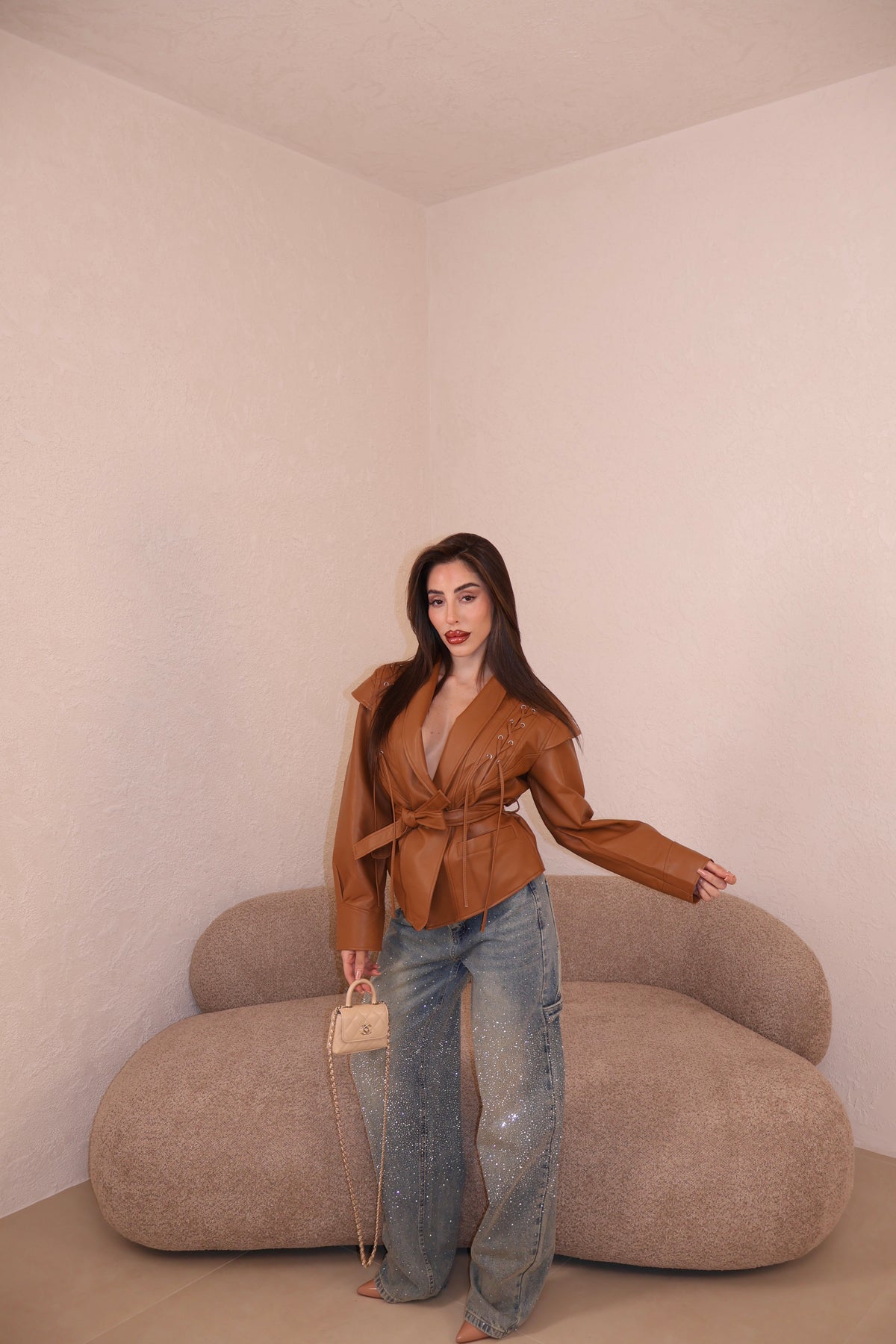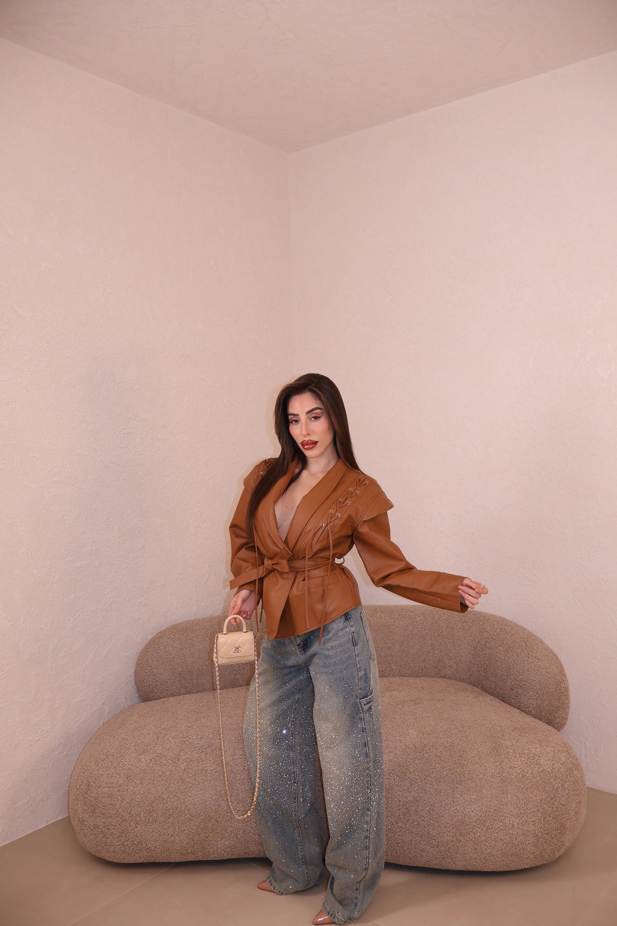 La giacca veste leggermente over ma con la cinta stretta in vita, è perfetta.