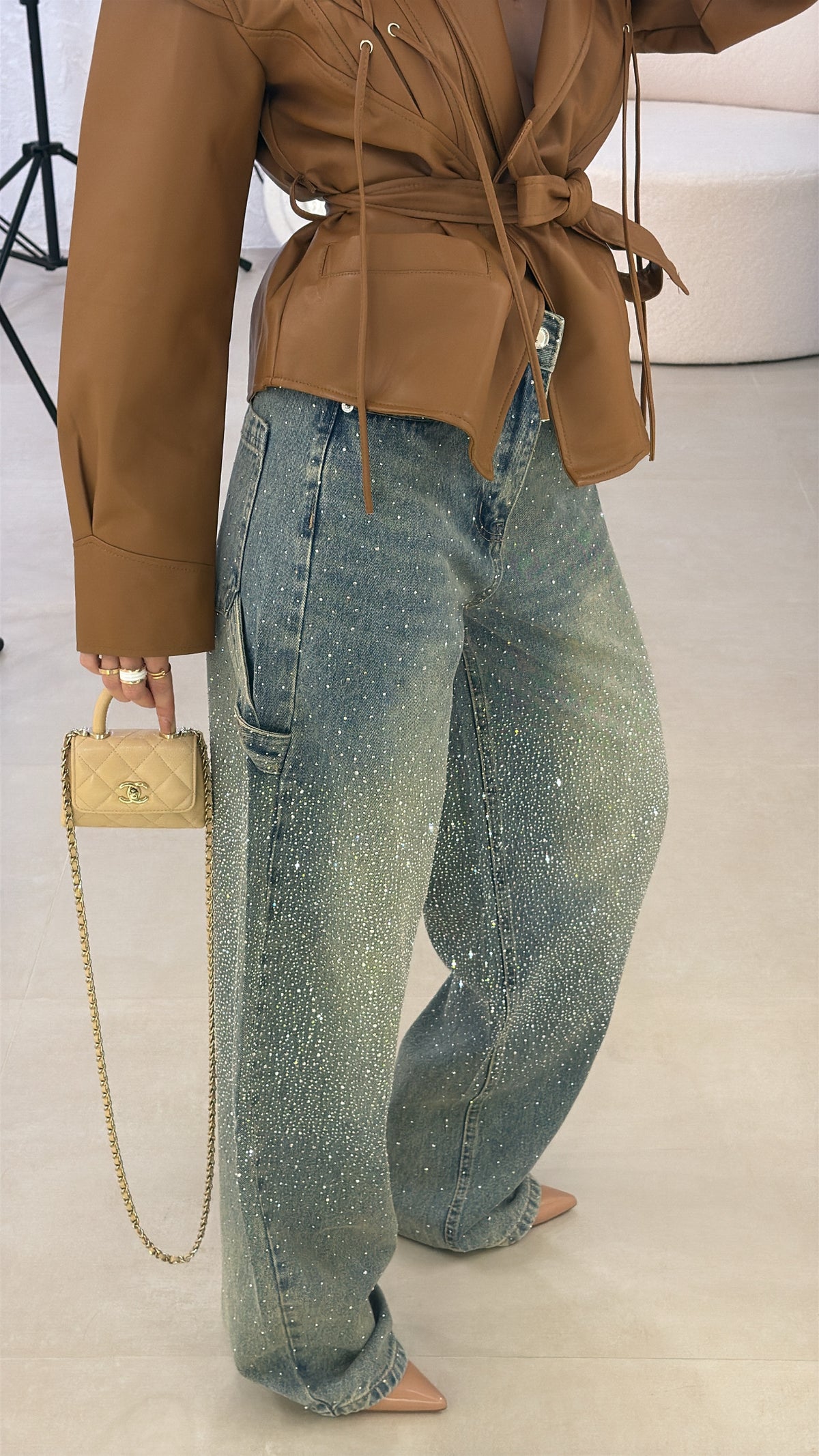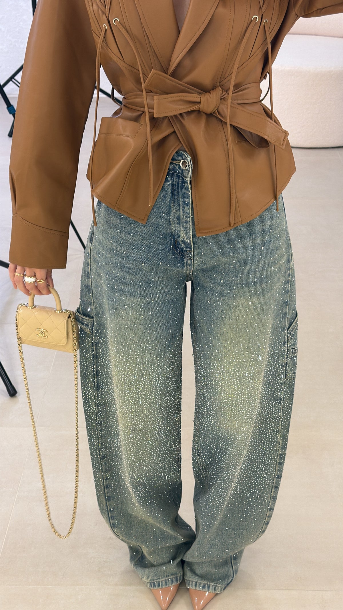 Jeans modello baggy con dettagli strass. La modella indossa taglia 36.
