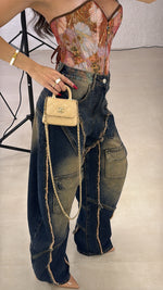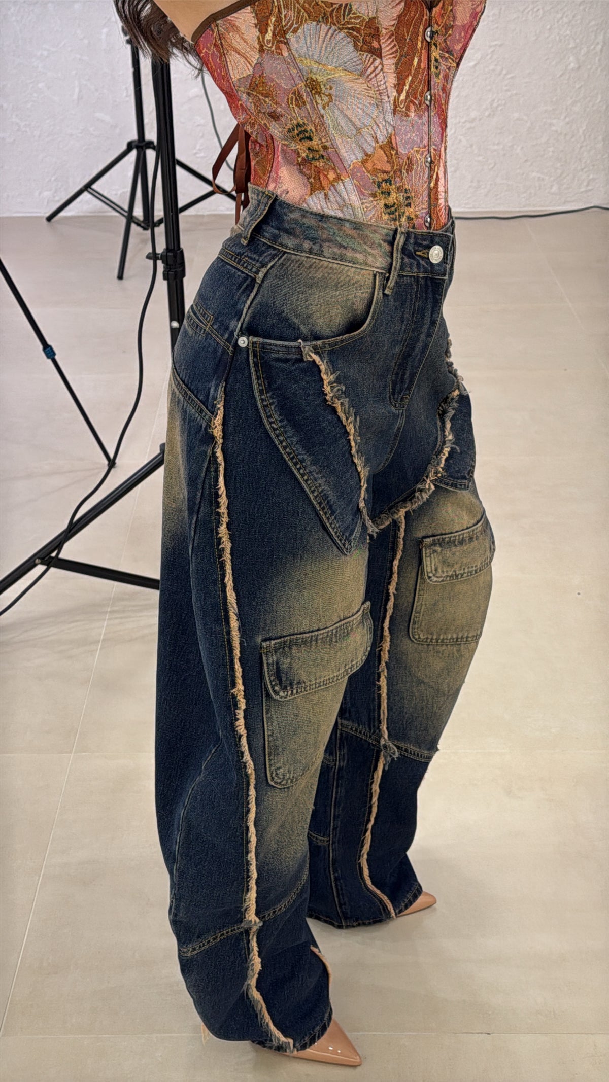Jeans modello balloon con sfumature a contrasto e dettagli sfrangiati. La modella indossa taglia S.
