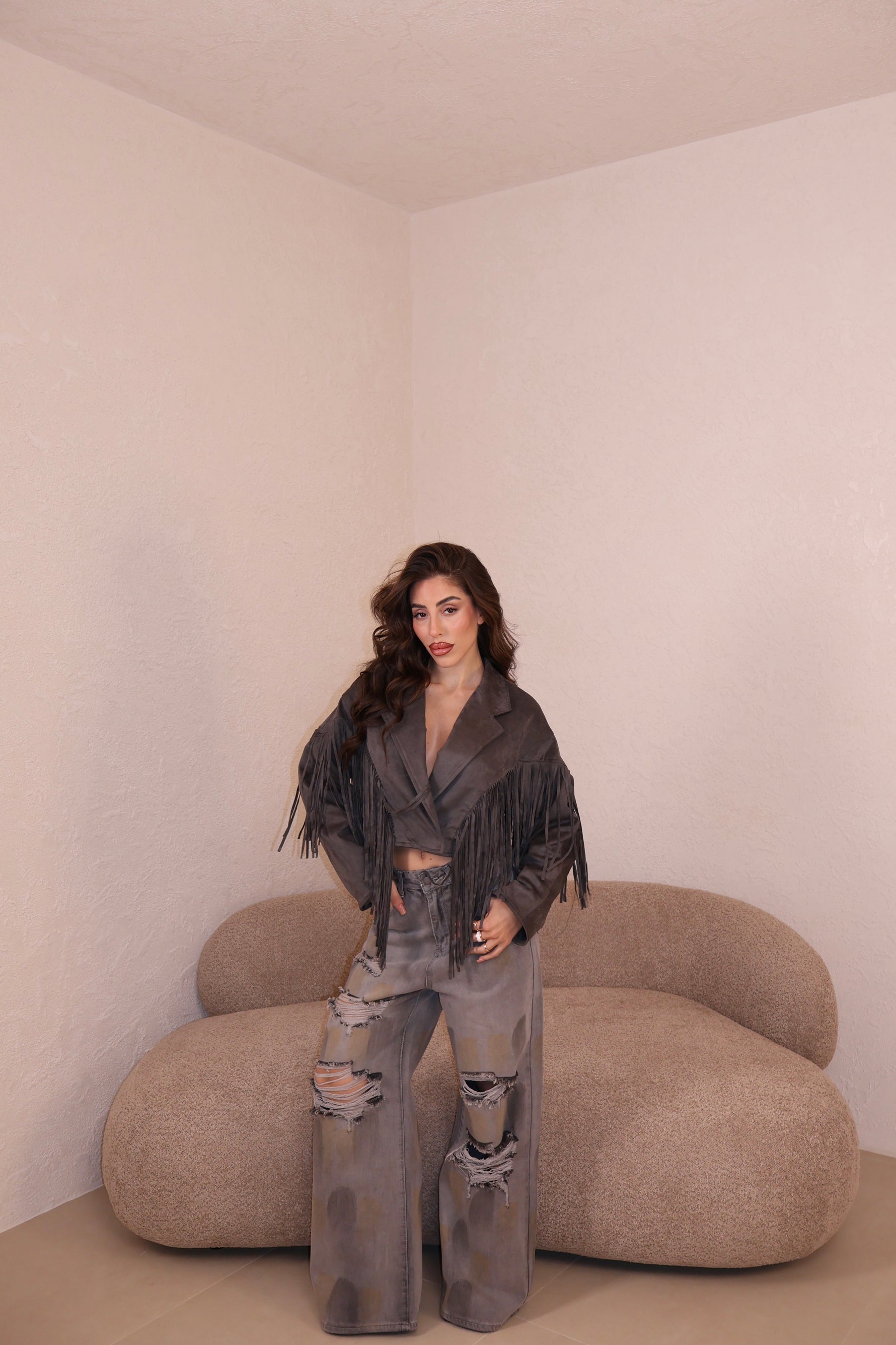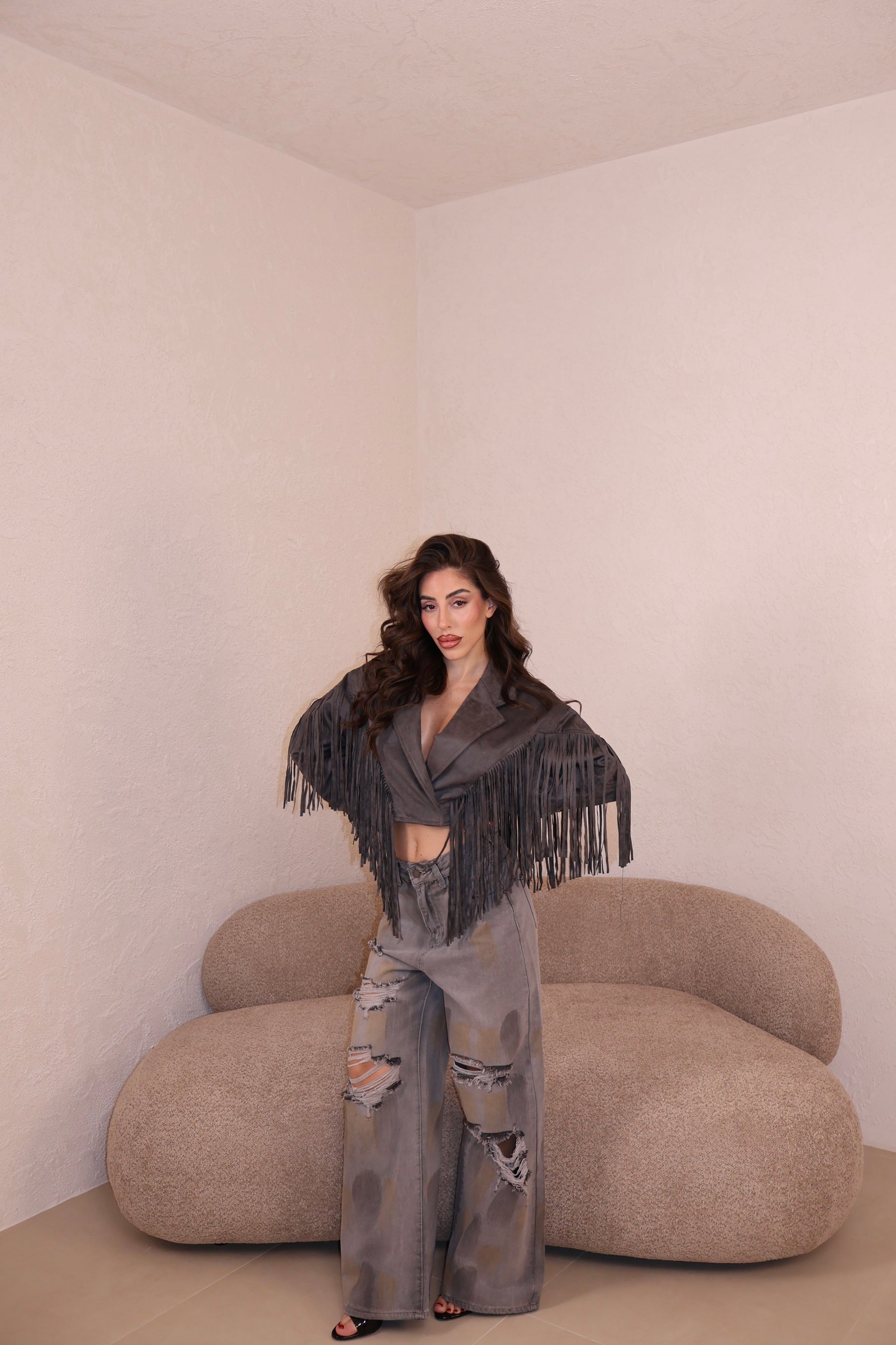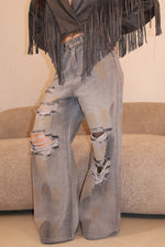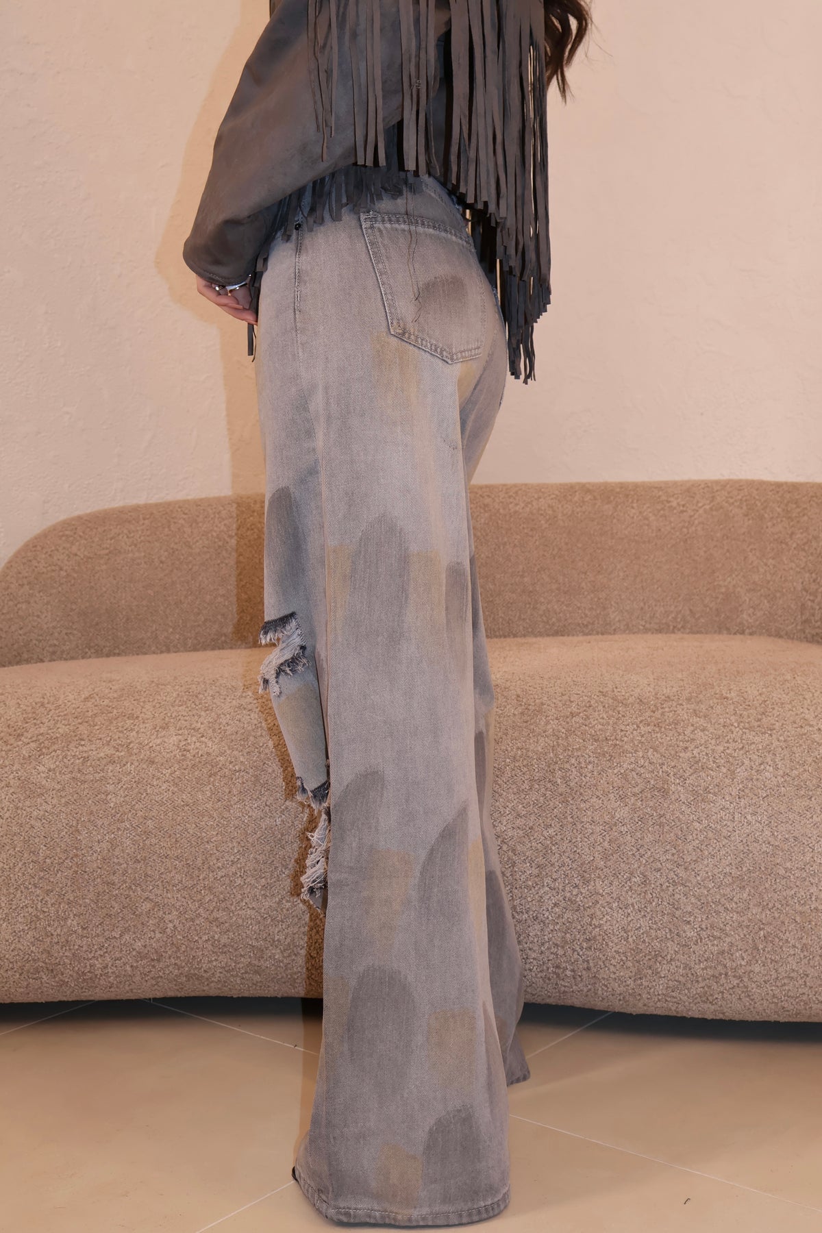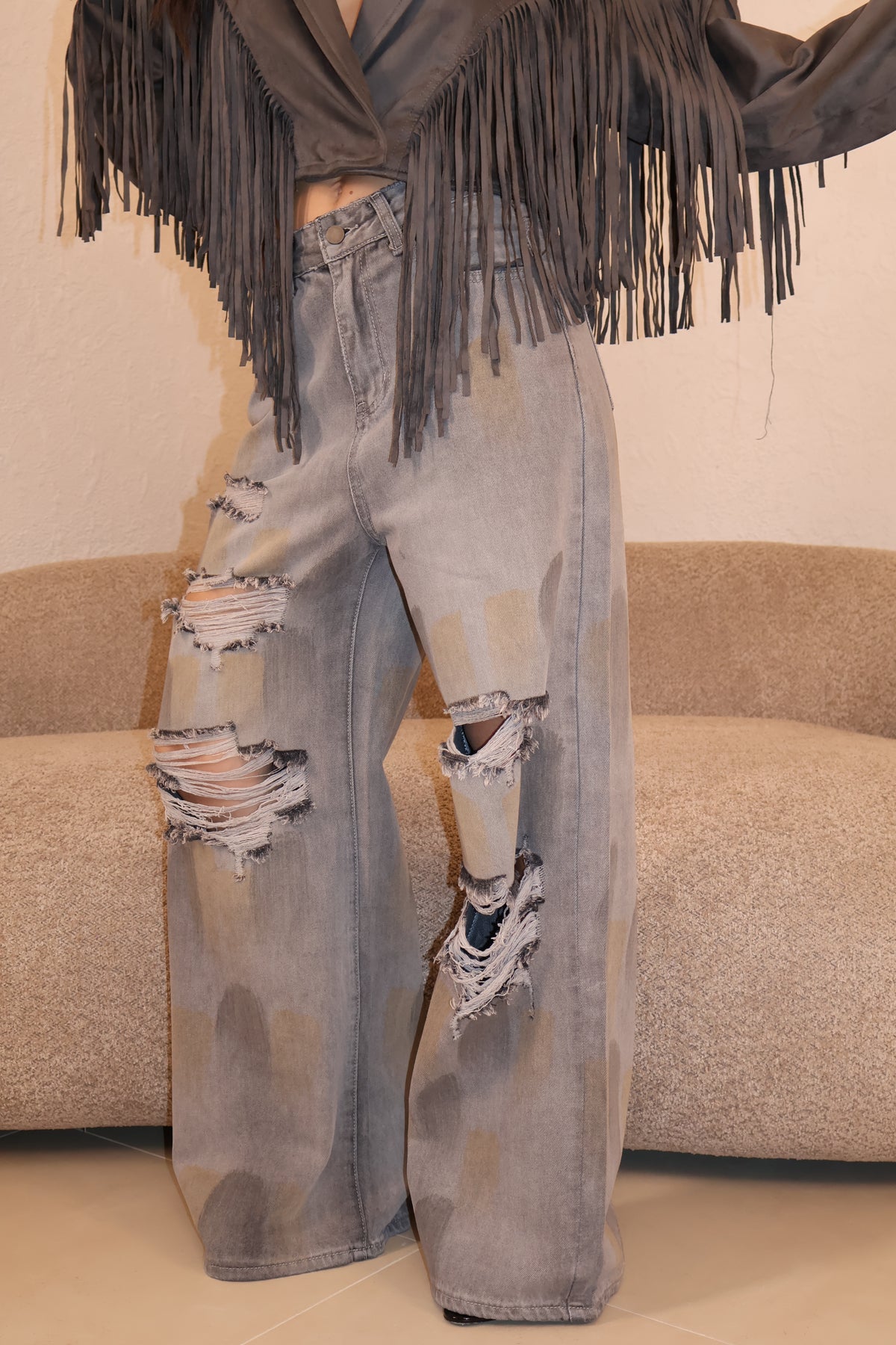 Jeans con dettagli strappi e sfumature a contrasto. Vestibilità regolare. La modella indossa taglia S.