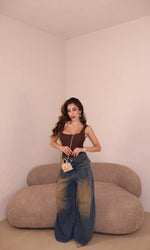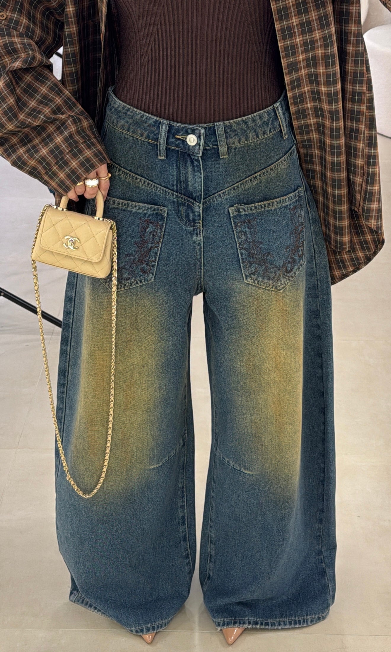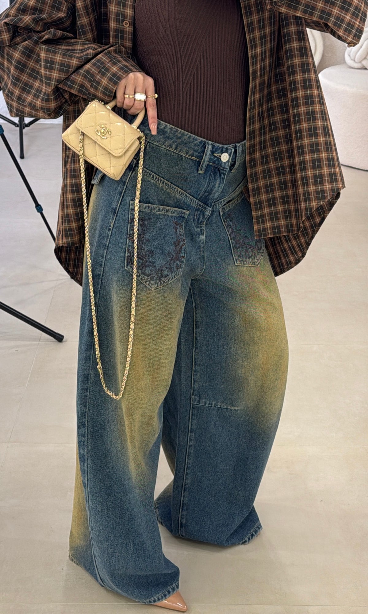 Jeans vita alta con dettagli tasche frontali e sfumature a contrasto. Vestibilità regolare. La modella indossa taglia S.