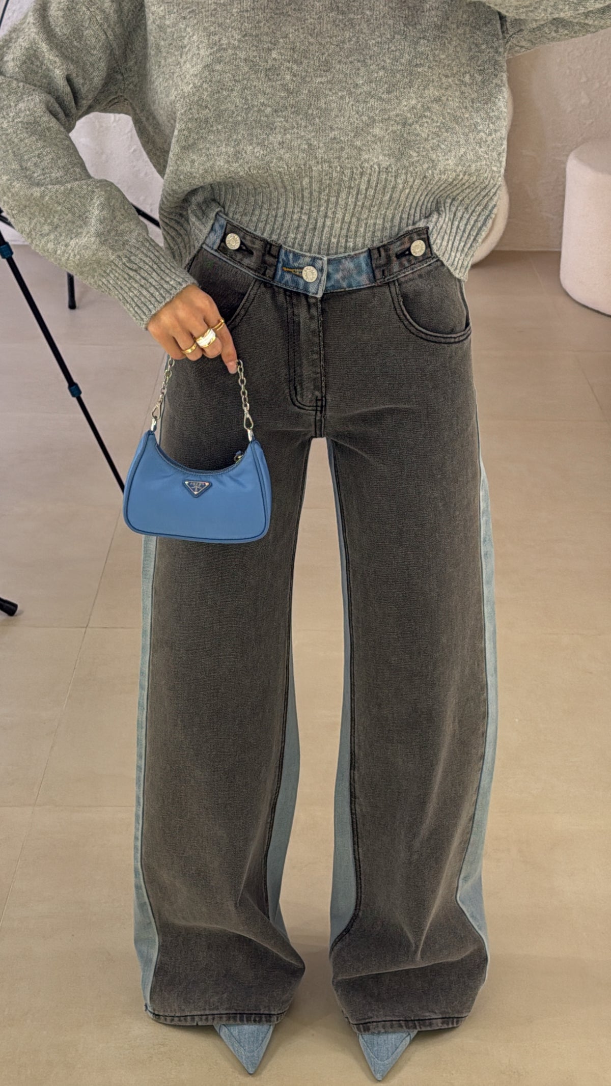 Jeans vita alta gamba dritta con effetto denim chiaro sul retro. Doppi bottoni frontali. Vestibilità regolare.