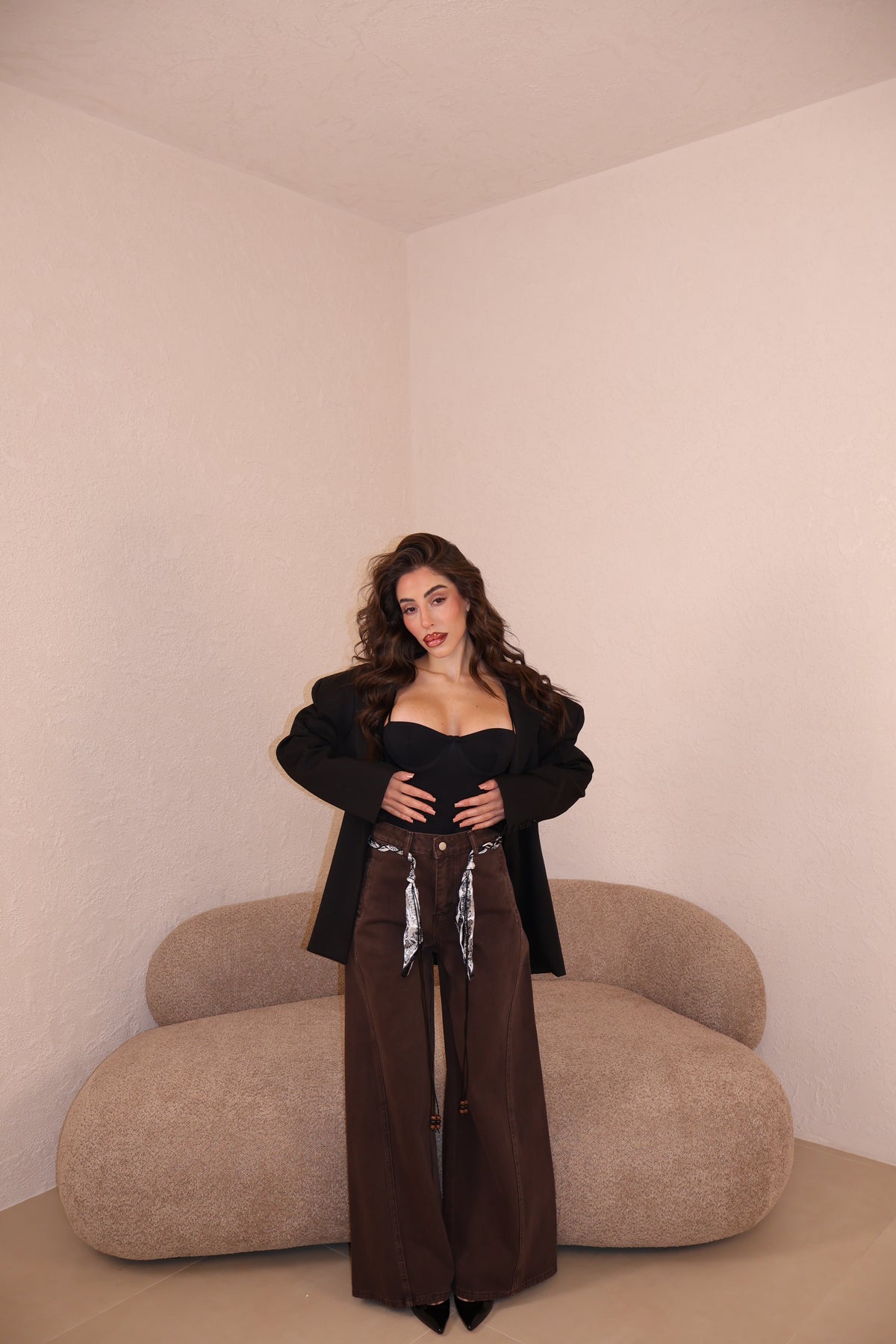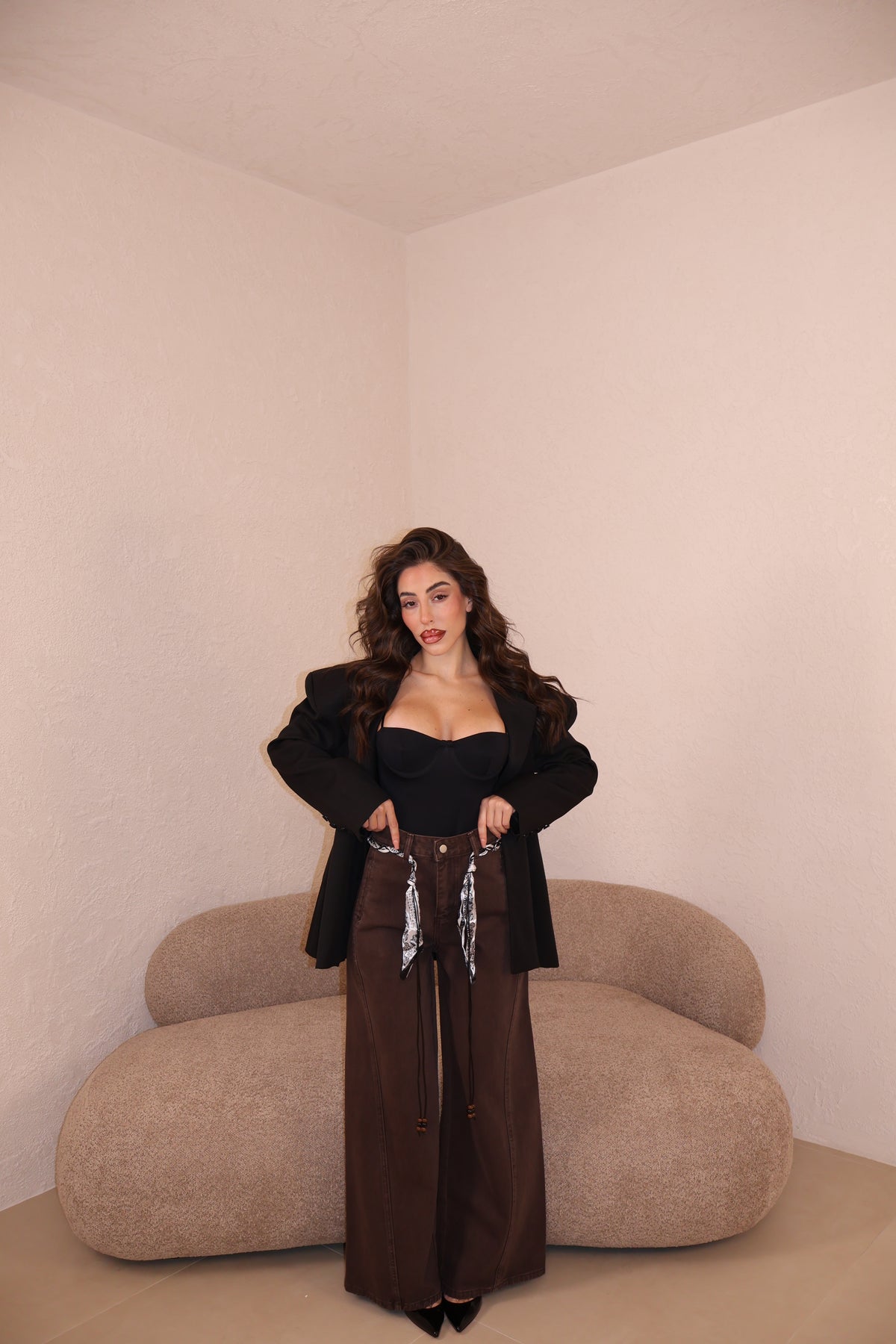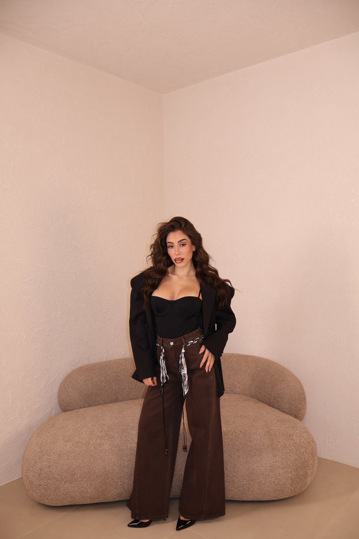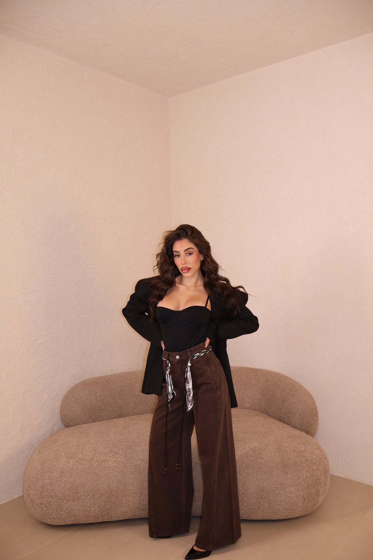 Il pantalone a palazzo ha passanti, l’elastico e piccoli spacchi lateralmente. Veste morbido/ leggermente largo. Con i tacchi è pazzesco. Grazie di tutto.❤️