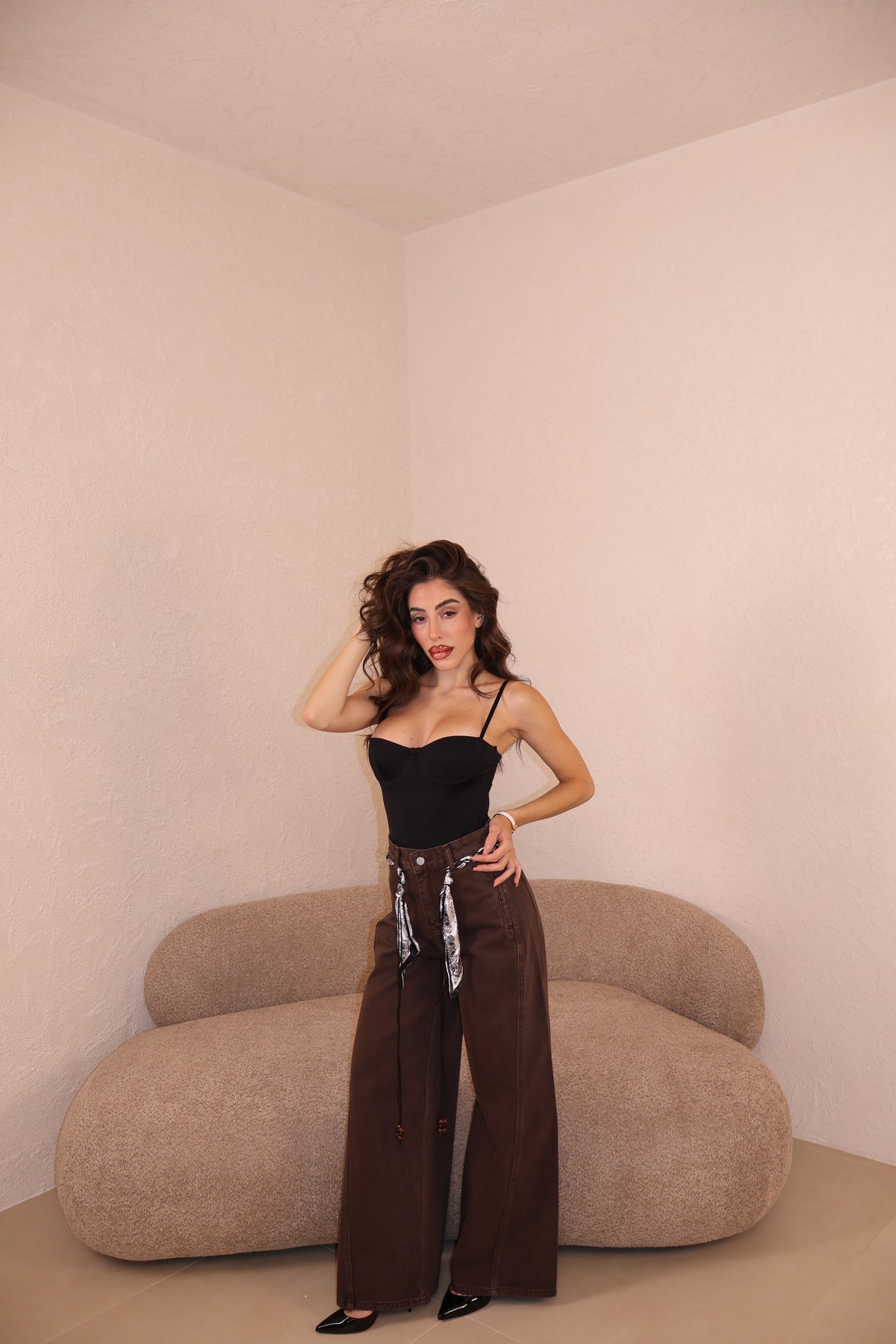 Jeans modello wide leg con dettaglio cintura effetto bandana. La modella indossa taglia S.