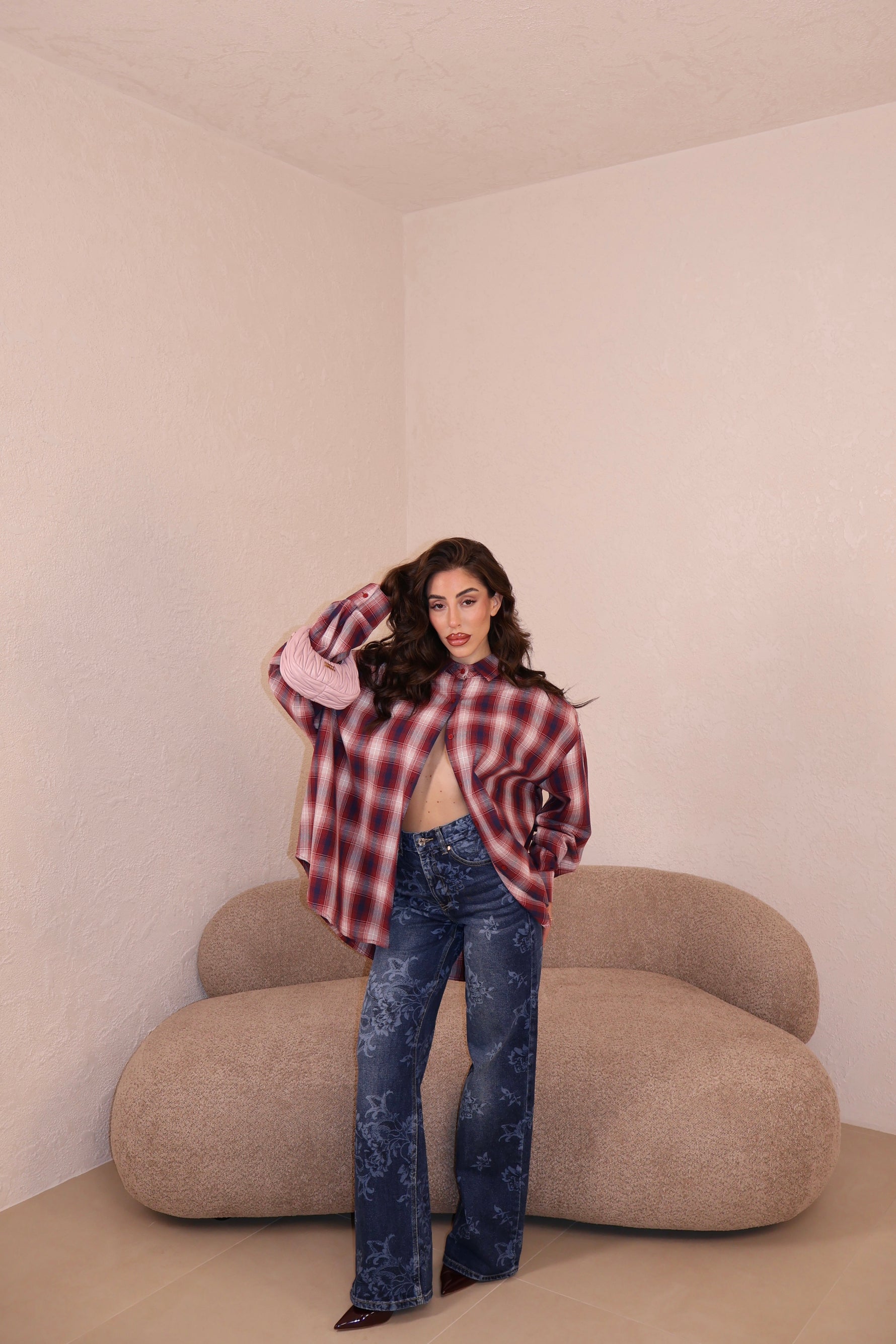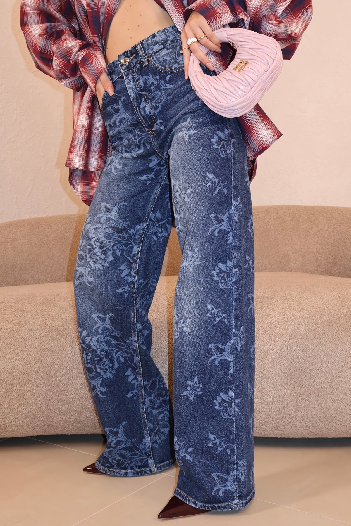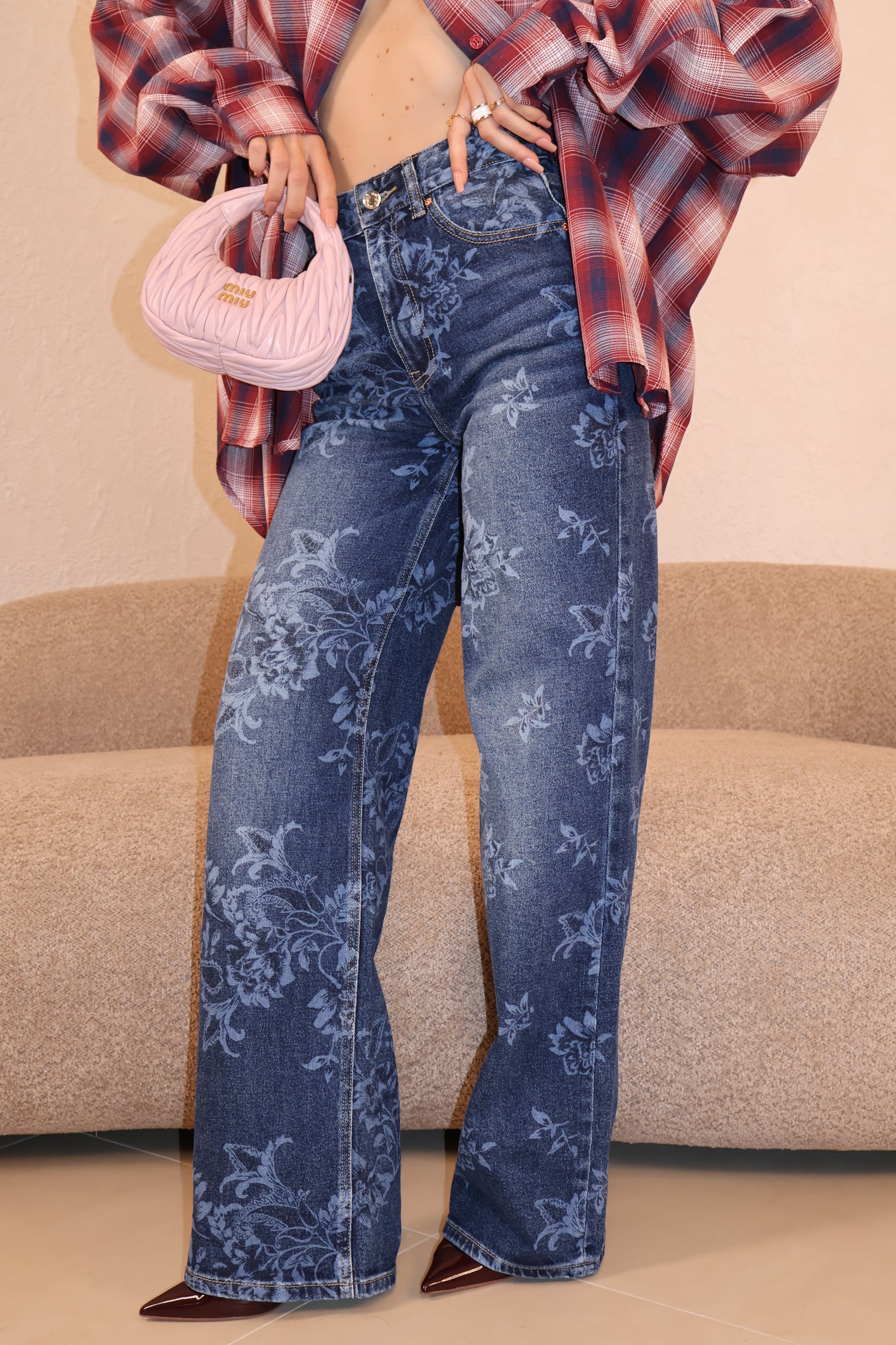 Jeans vita alta in tela elasticizzata con dettagli fiori. Vestibilità regolare. La modella indossa taglia XS.