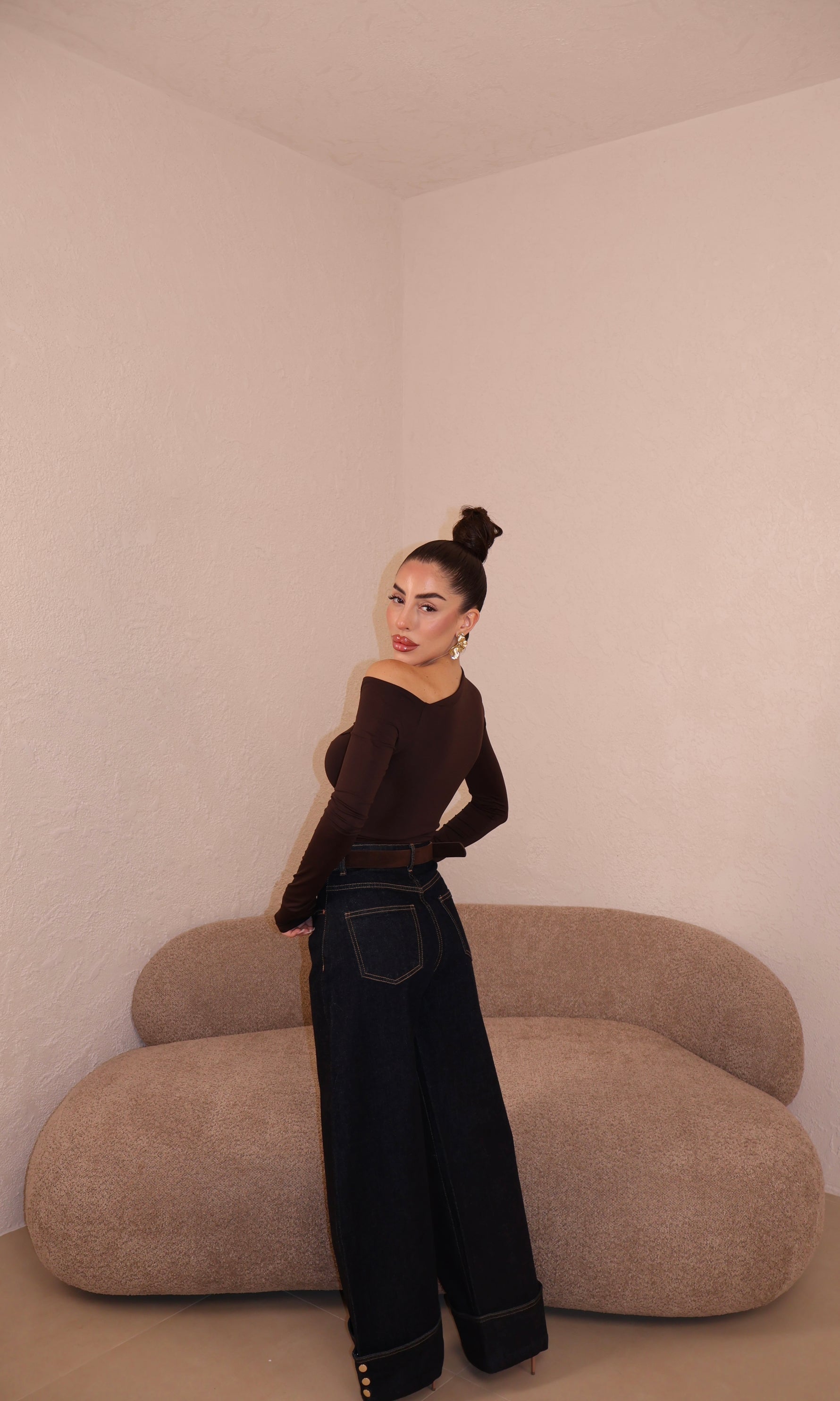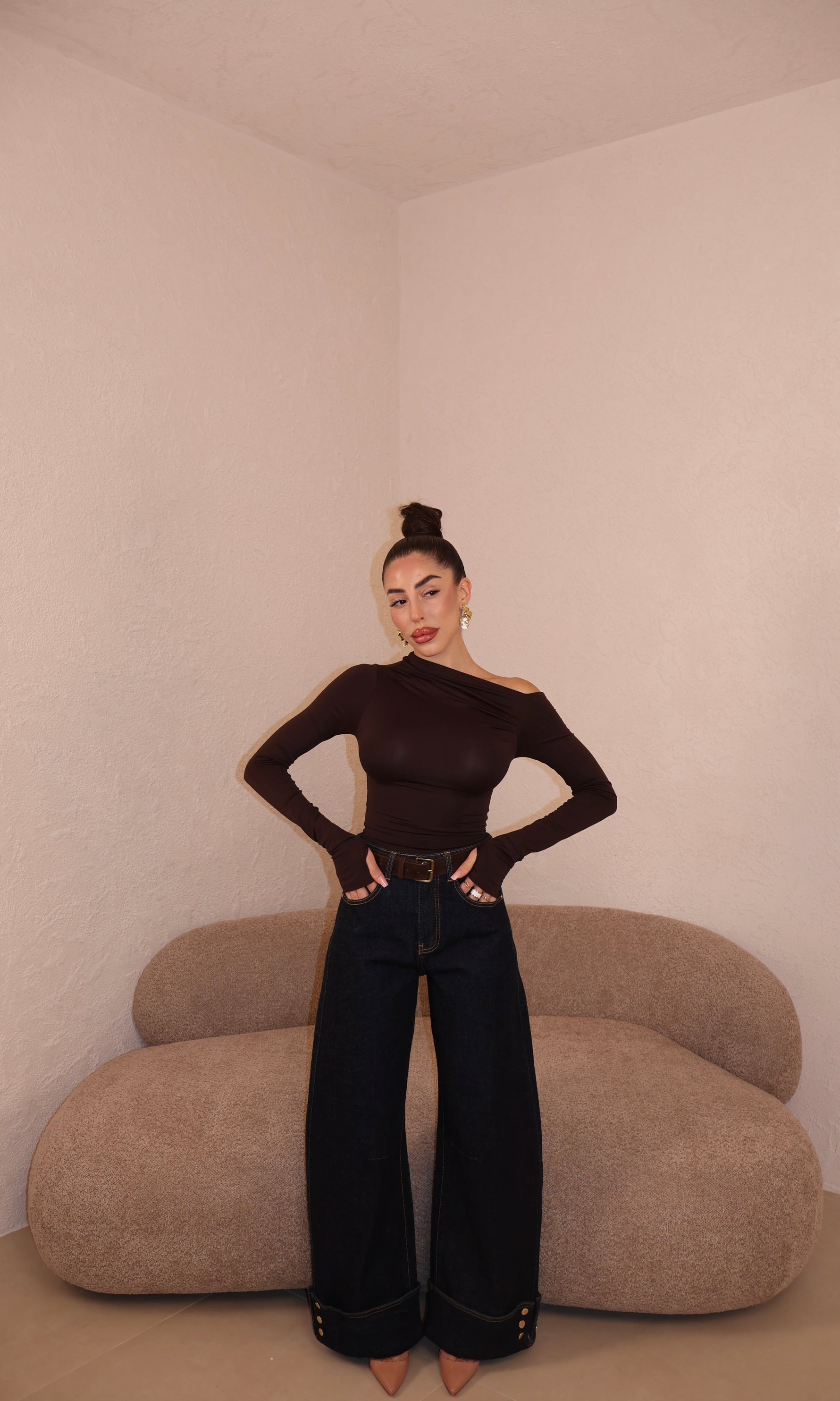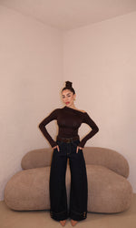 Jeans modello balloon con piegone sul fondo e passanti con cintura in ecocamoscio compresa. Vestibilità regolare.
