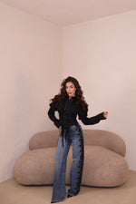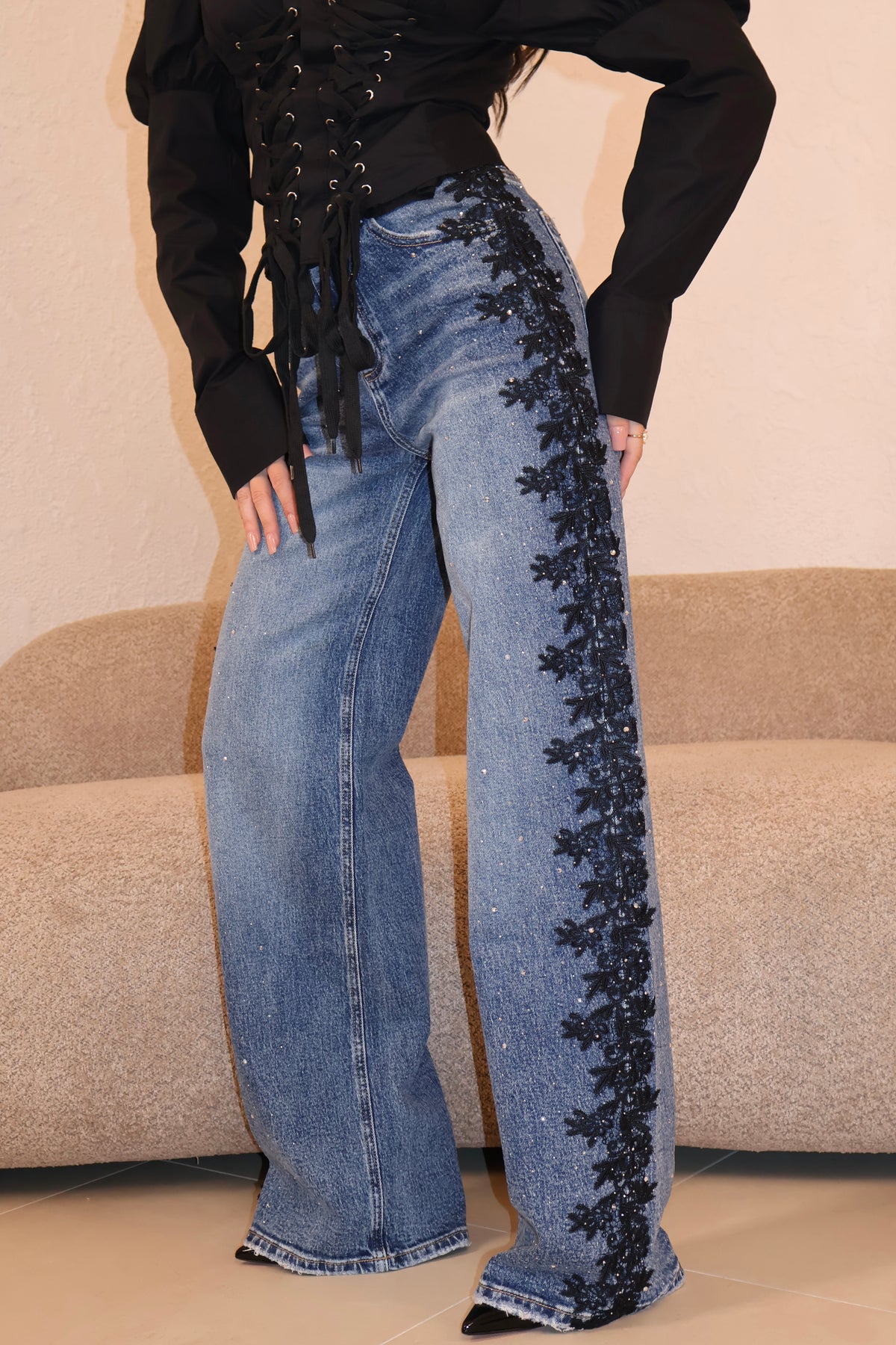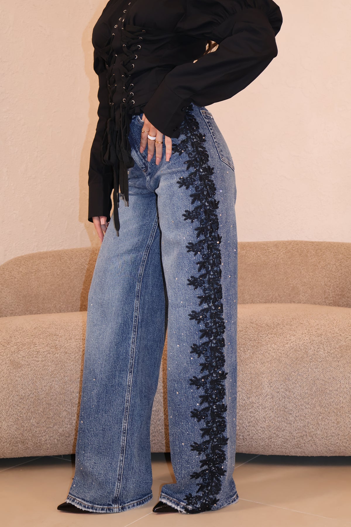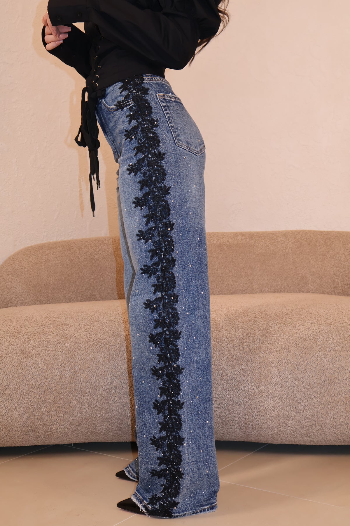 Jeans lavaggio chiaro vita alta con strass e dettaglio pizzo laterale. Vestibilità regolare. La modella indossa taglia xs.