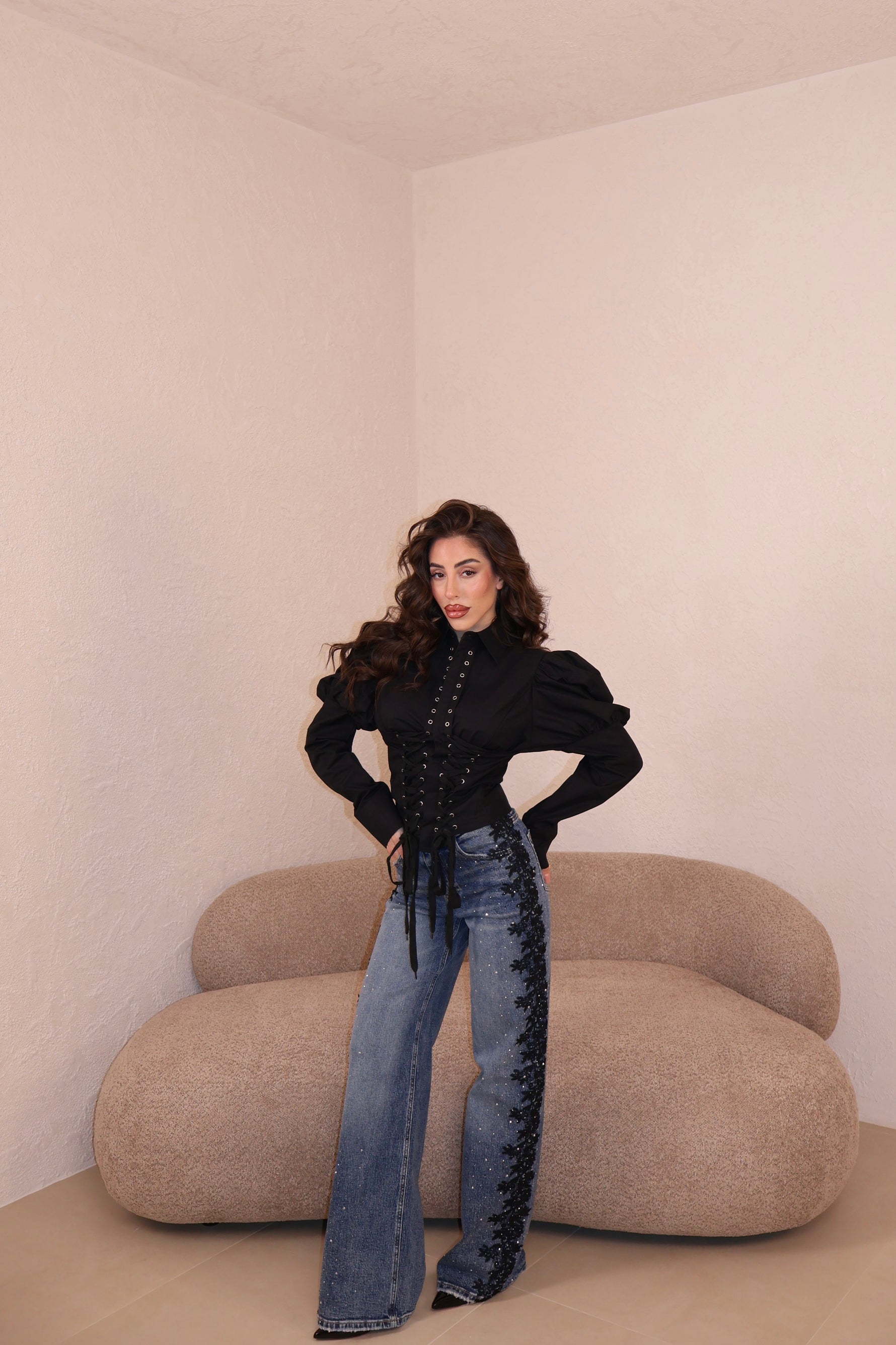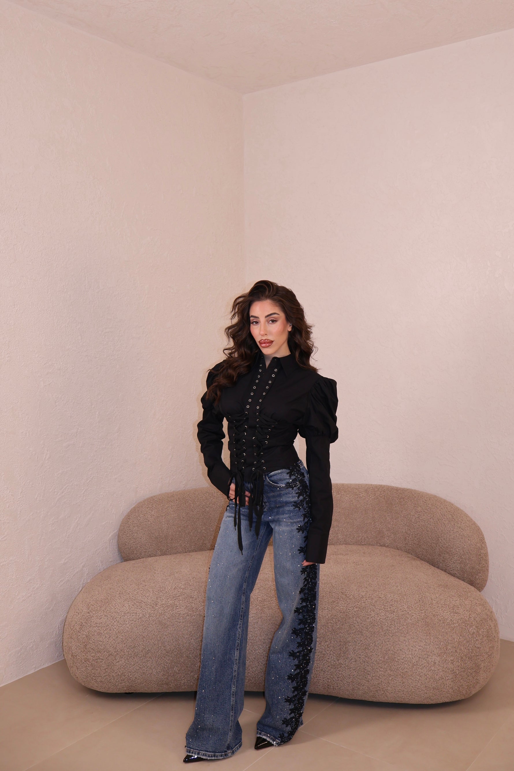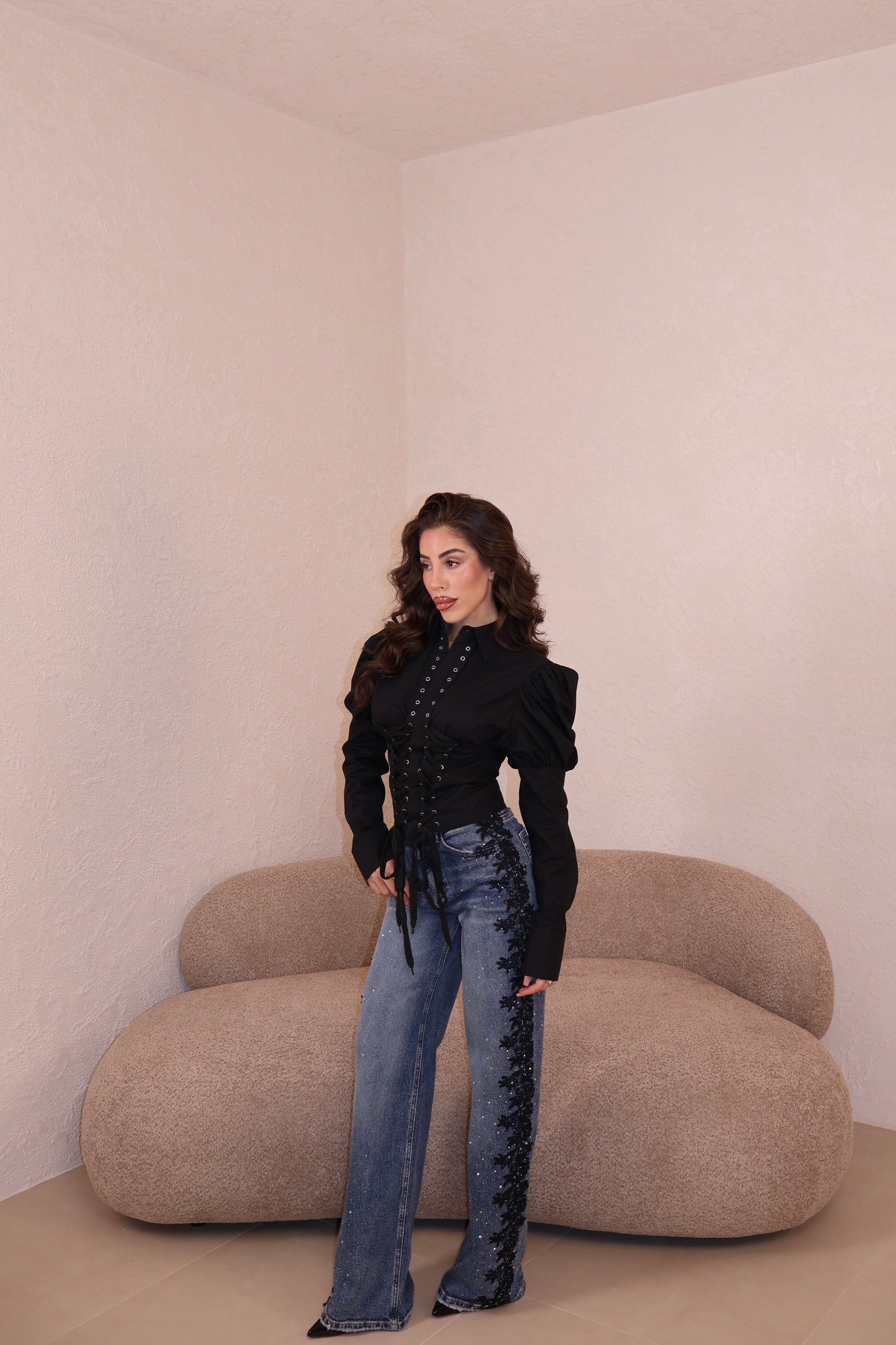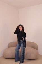 Jeans lavaggio chiaro vita alta con strass e dettaglio pizzo laterale. Vestibilità regolare. La modella indossa taglia xs.