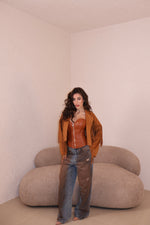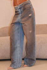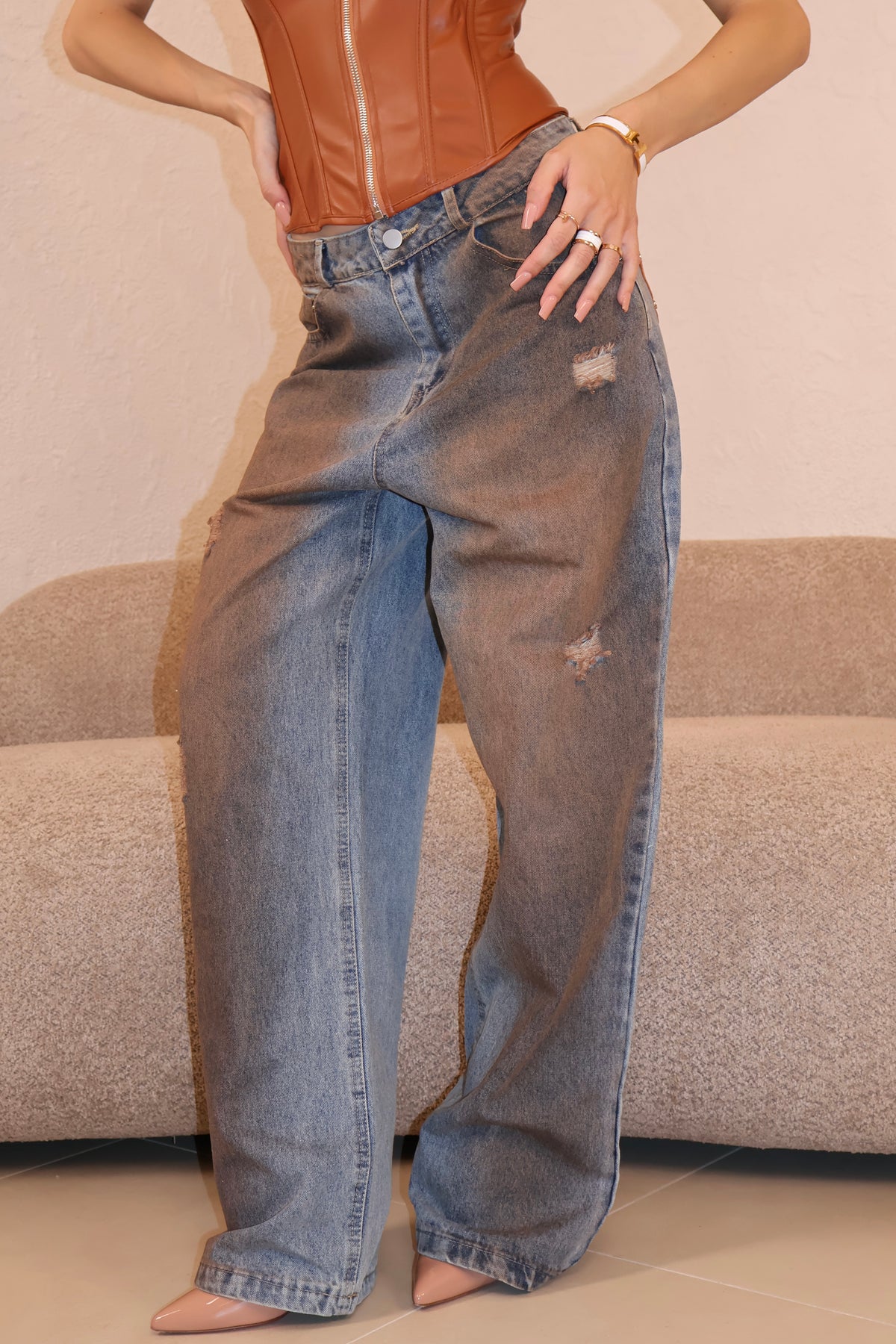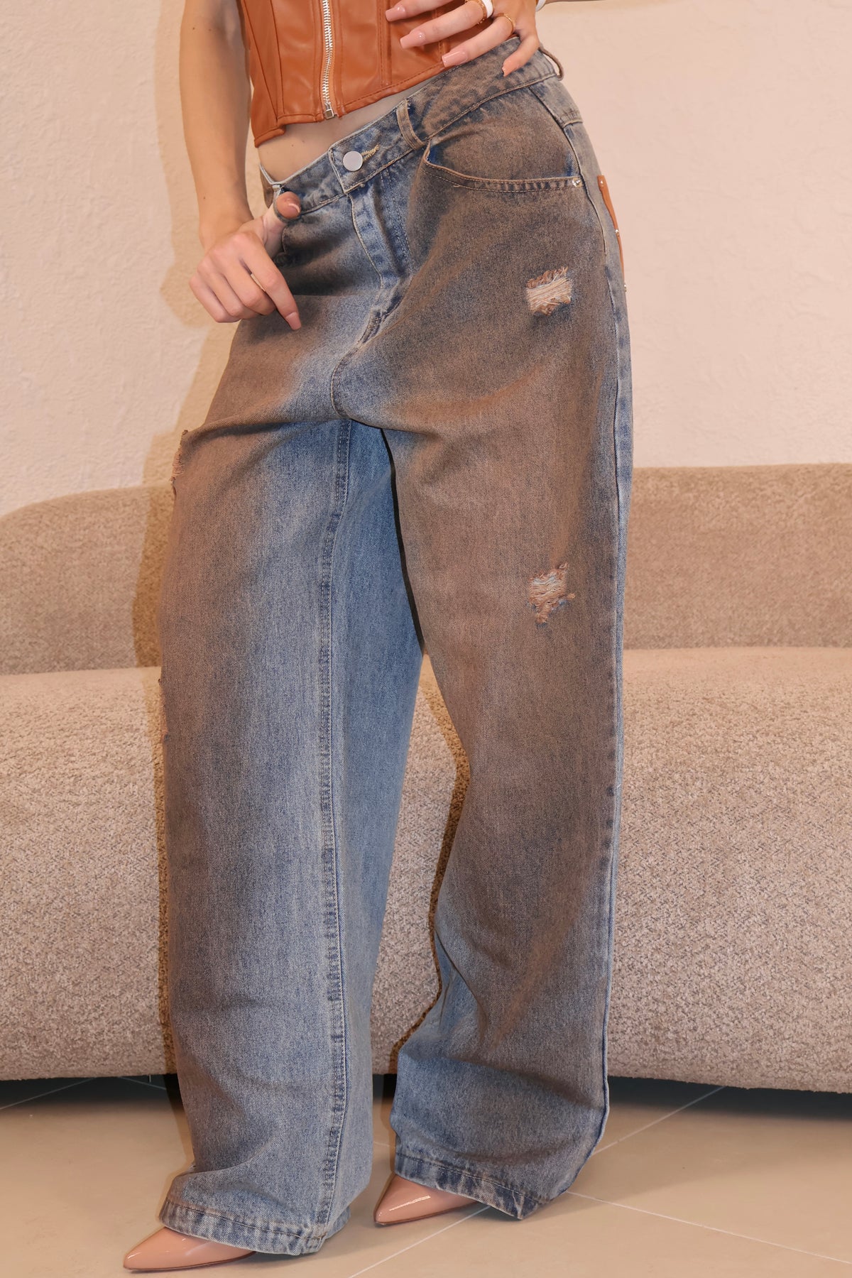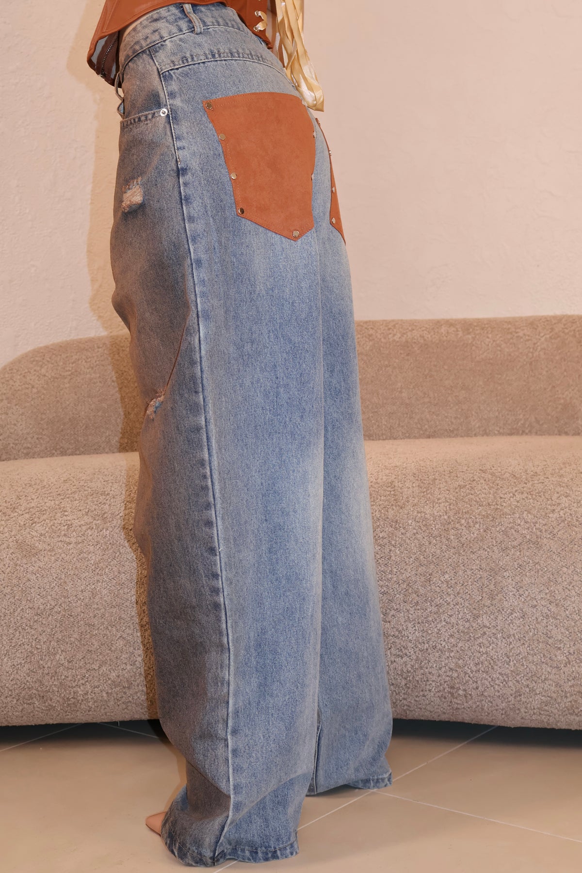 Jeans vita bassa con sfumature e tasche in camoscio. Vestibilità regolare. La modella indossa taglia S.