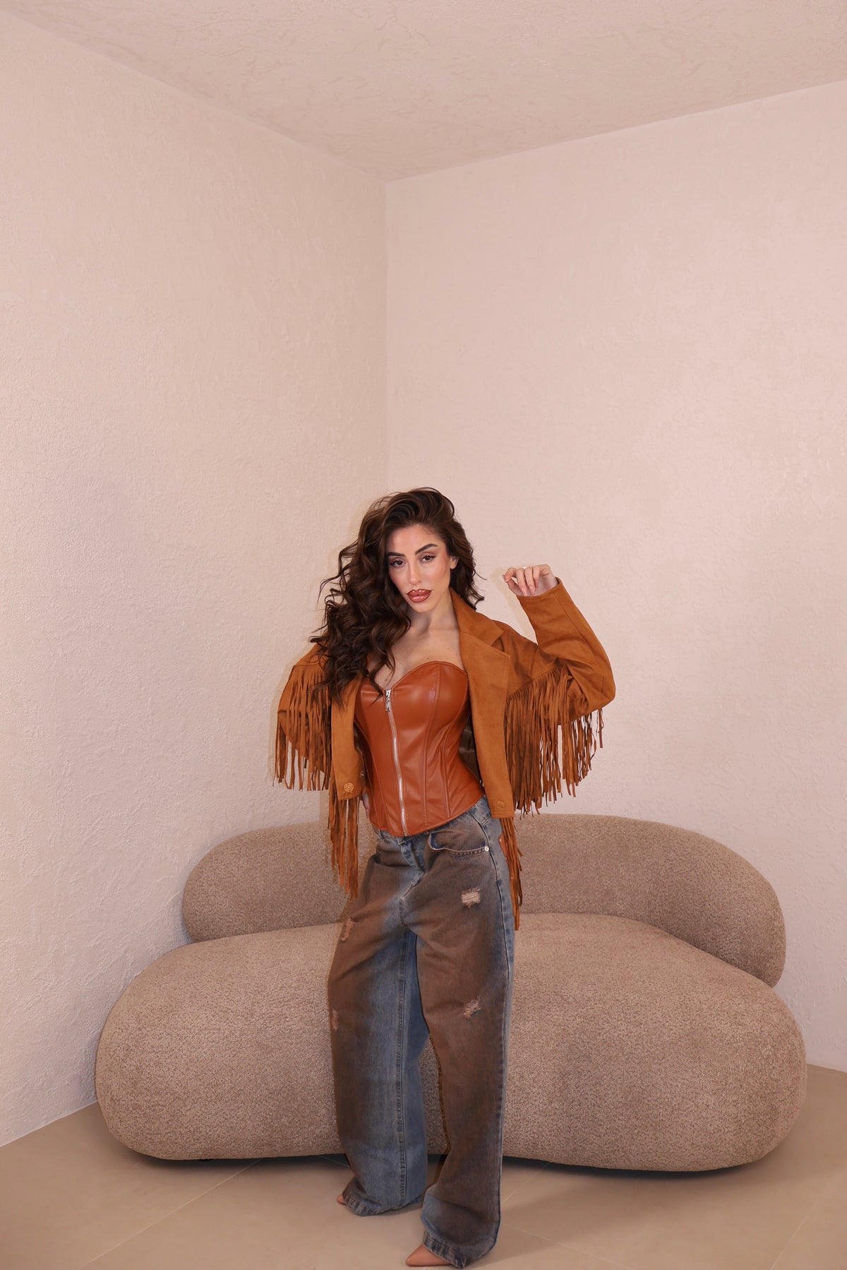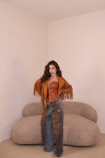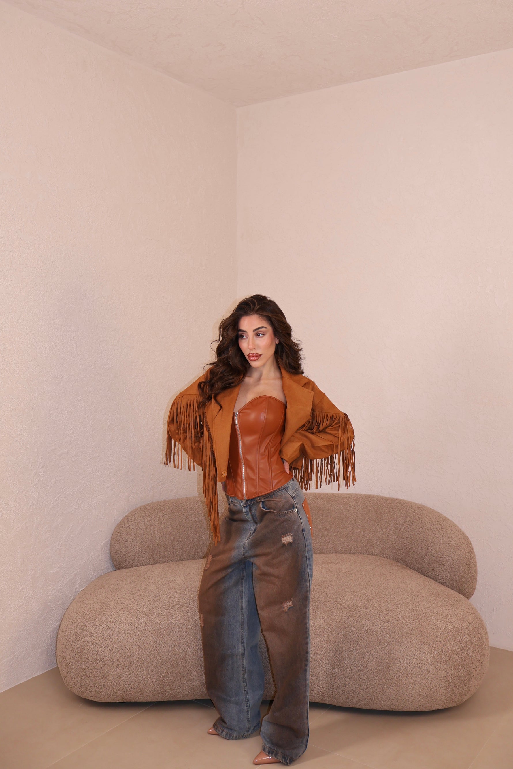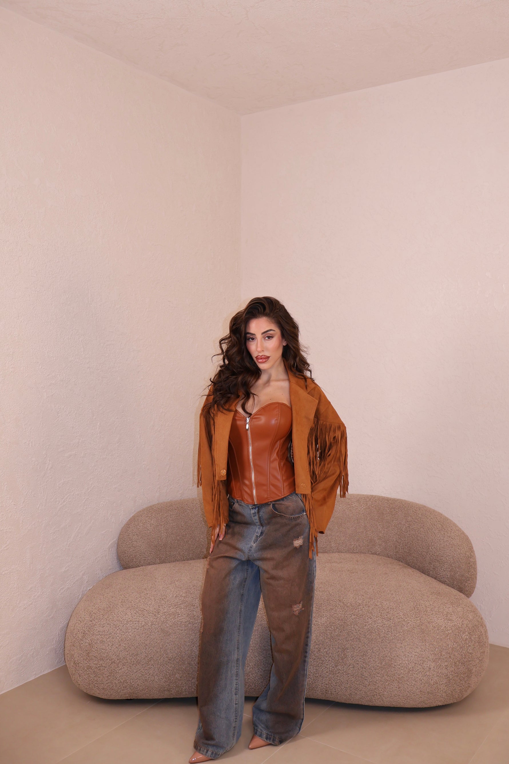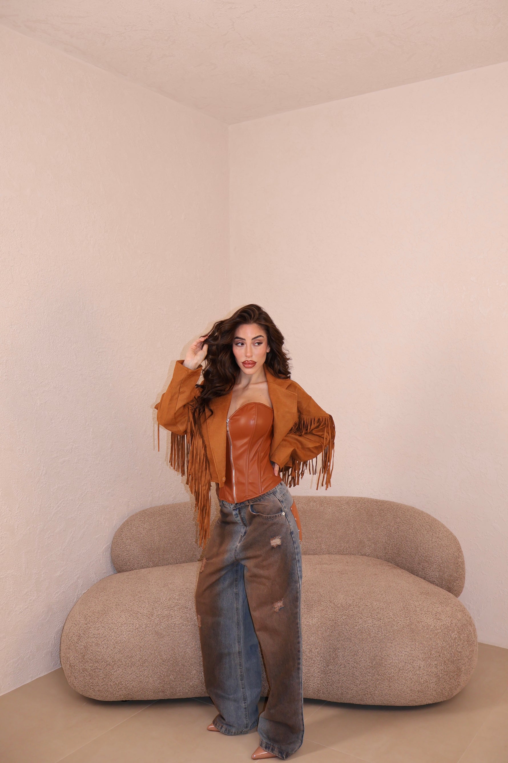 Jeans vita bassa con sfumature e tasche in camoscio. Vestibilità regolare. La modella indossa taglia S.