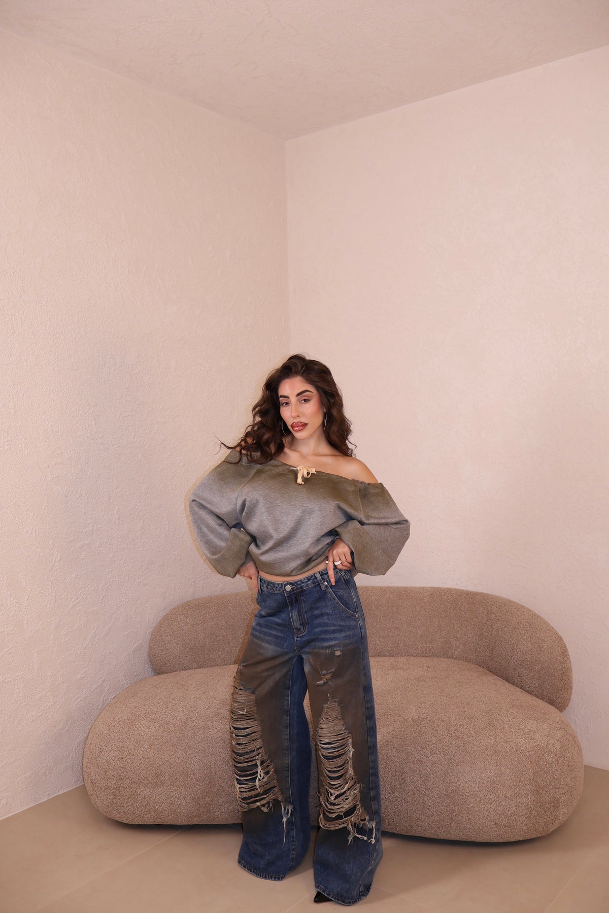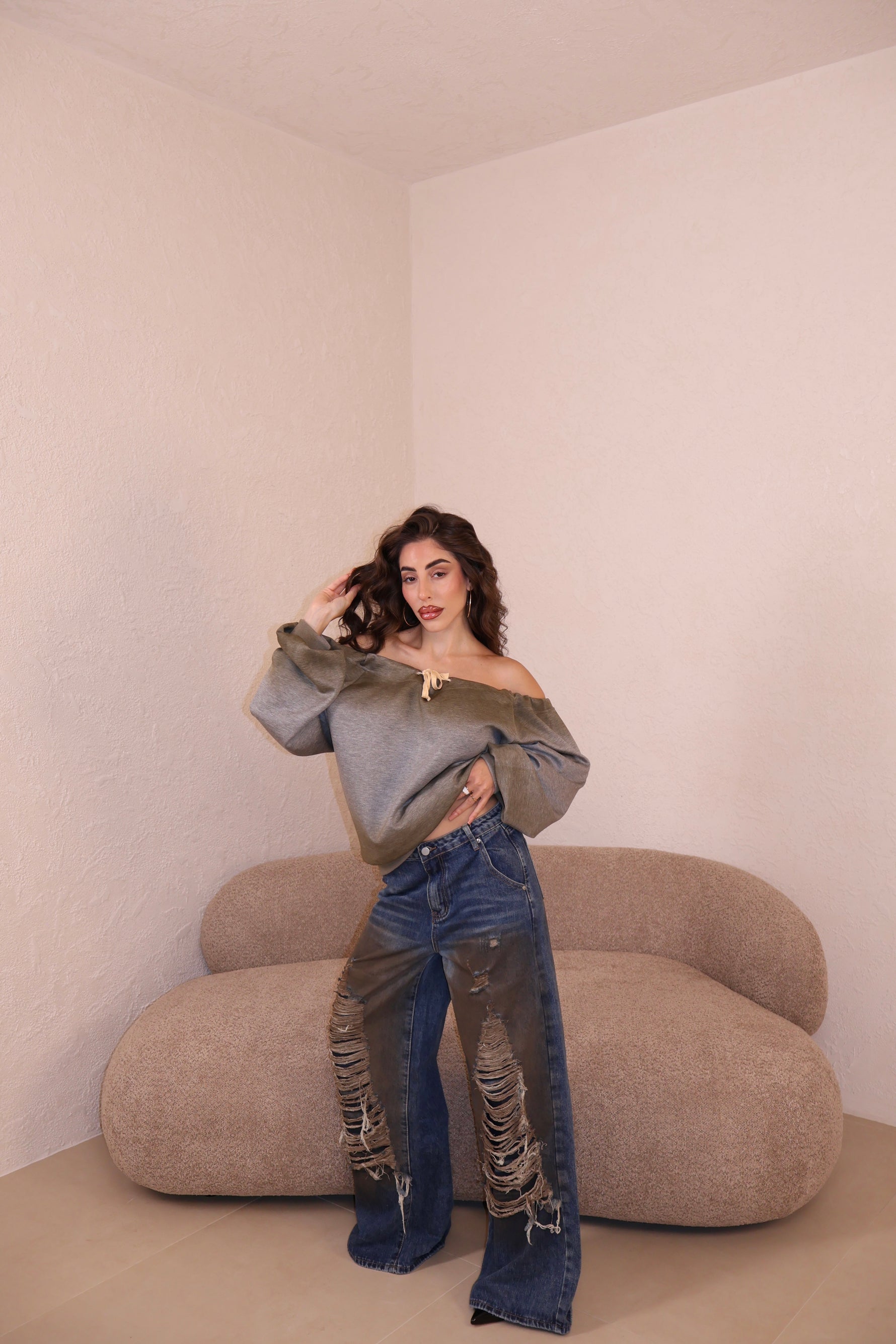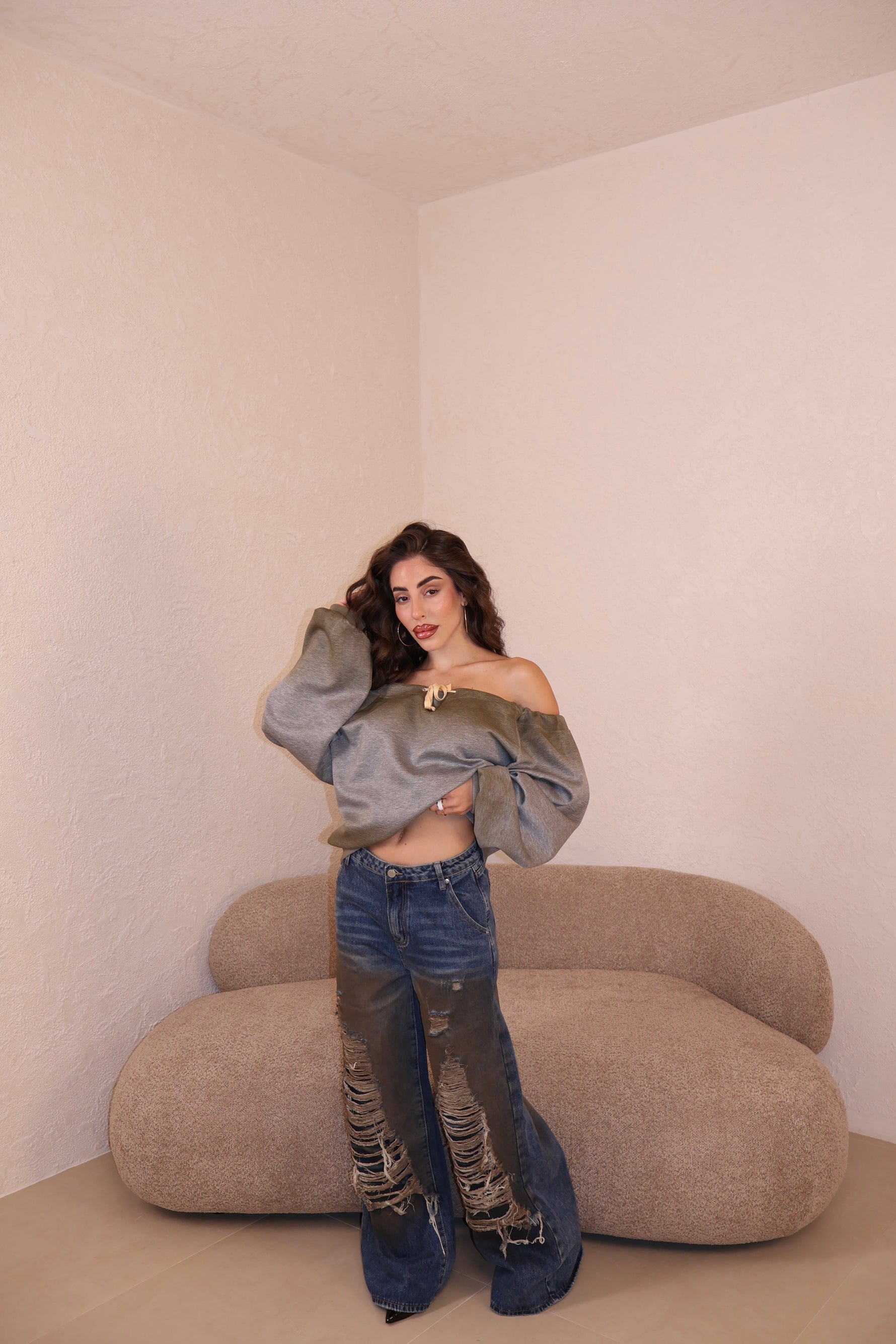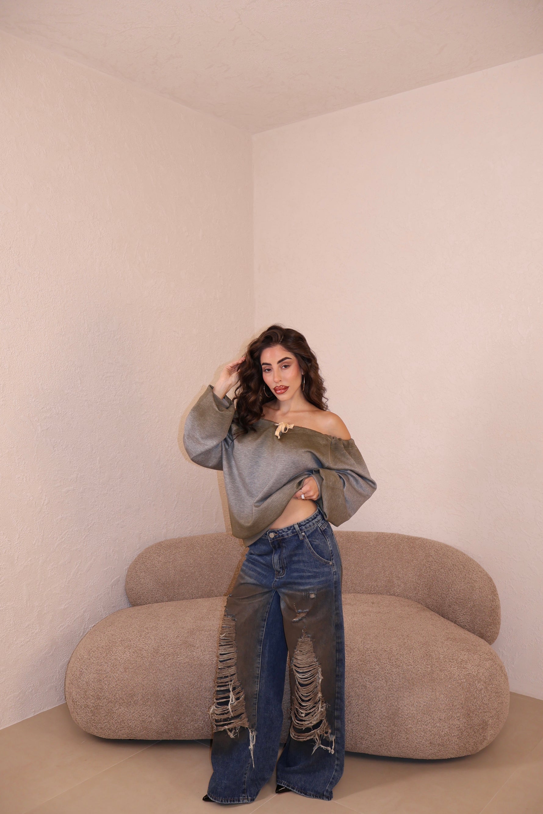 Prezzo unitario / perJeans modello wide leg sfrangiati. Vestibilità regolare. La modella indossa taglia S.