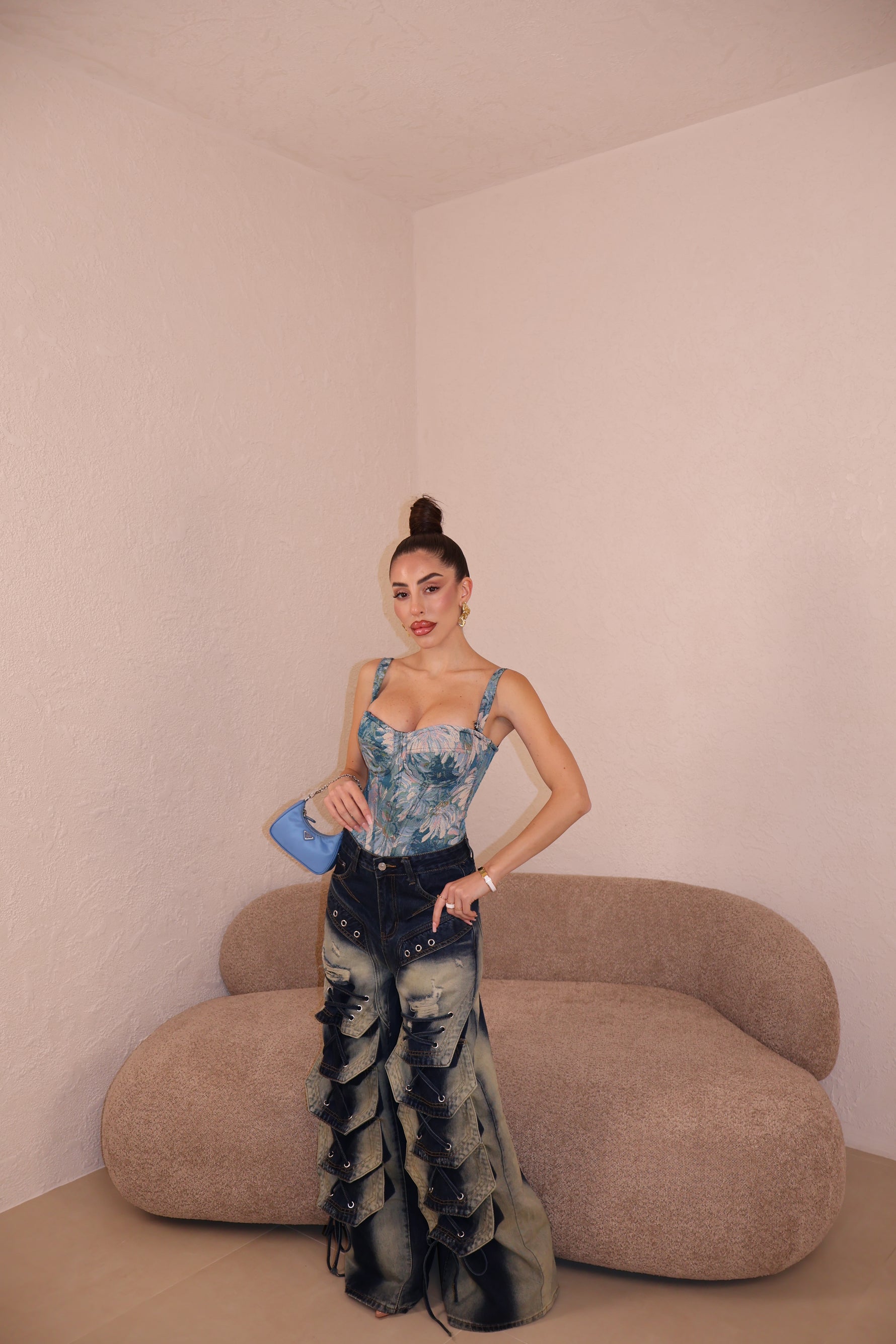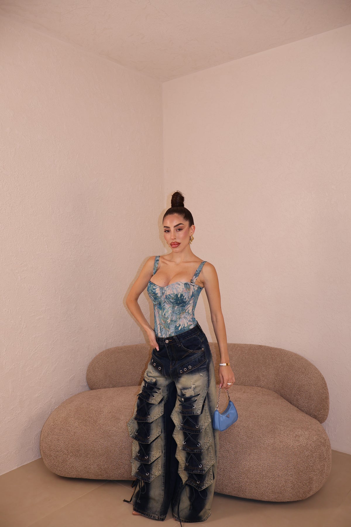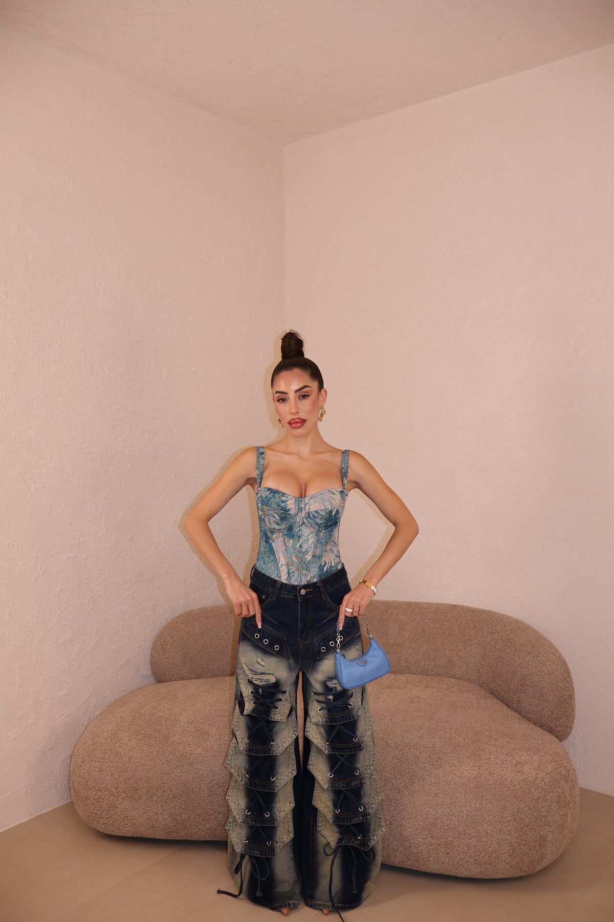 Jeans dritti con dettagli stringhe frontali e sfumature a constrasto. Vestibilità regolare. La modella indossa taglia S.