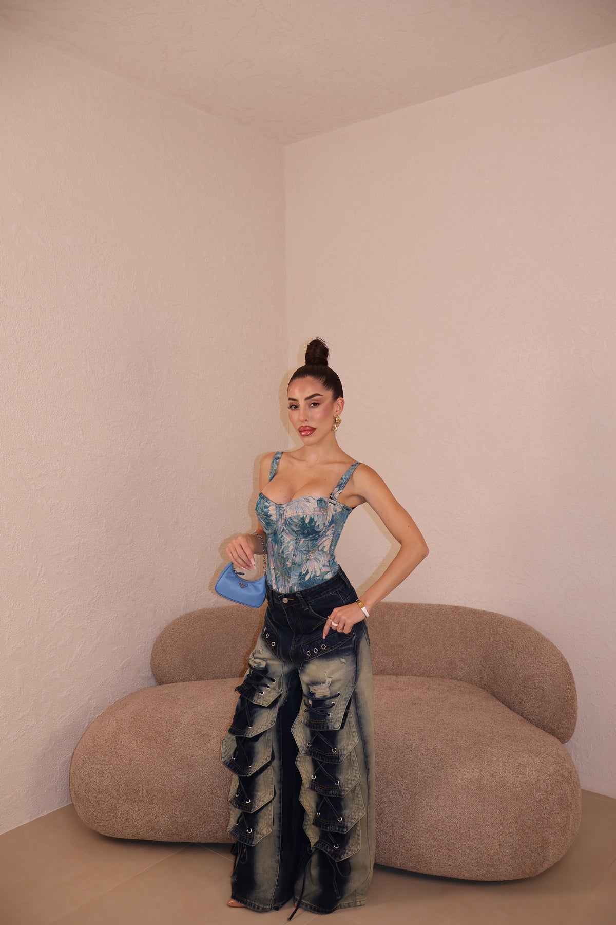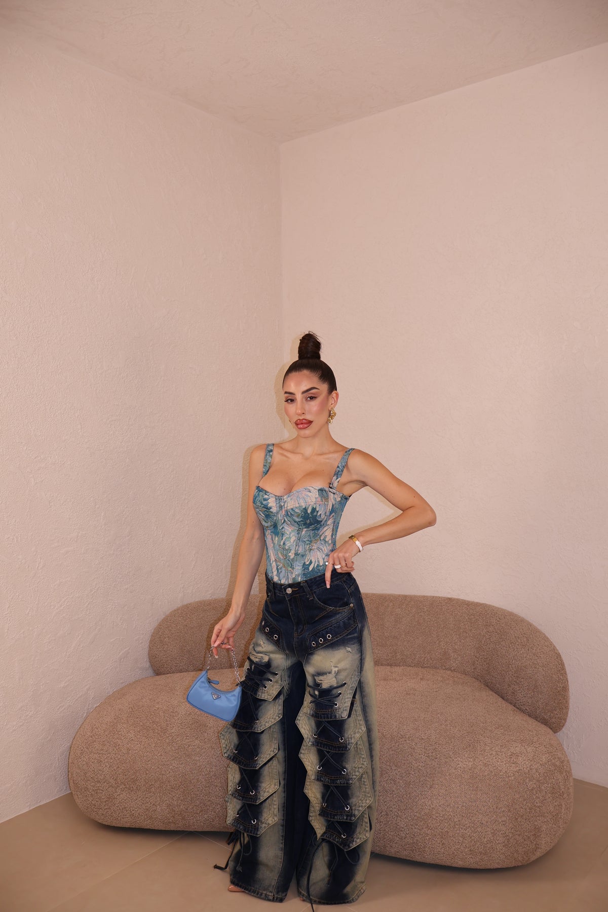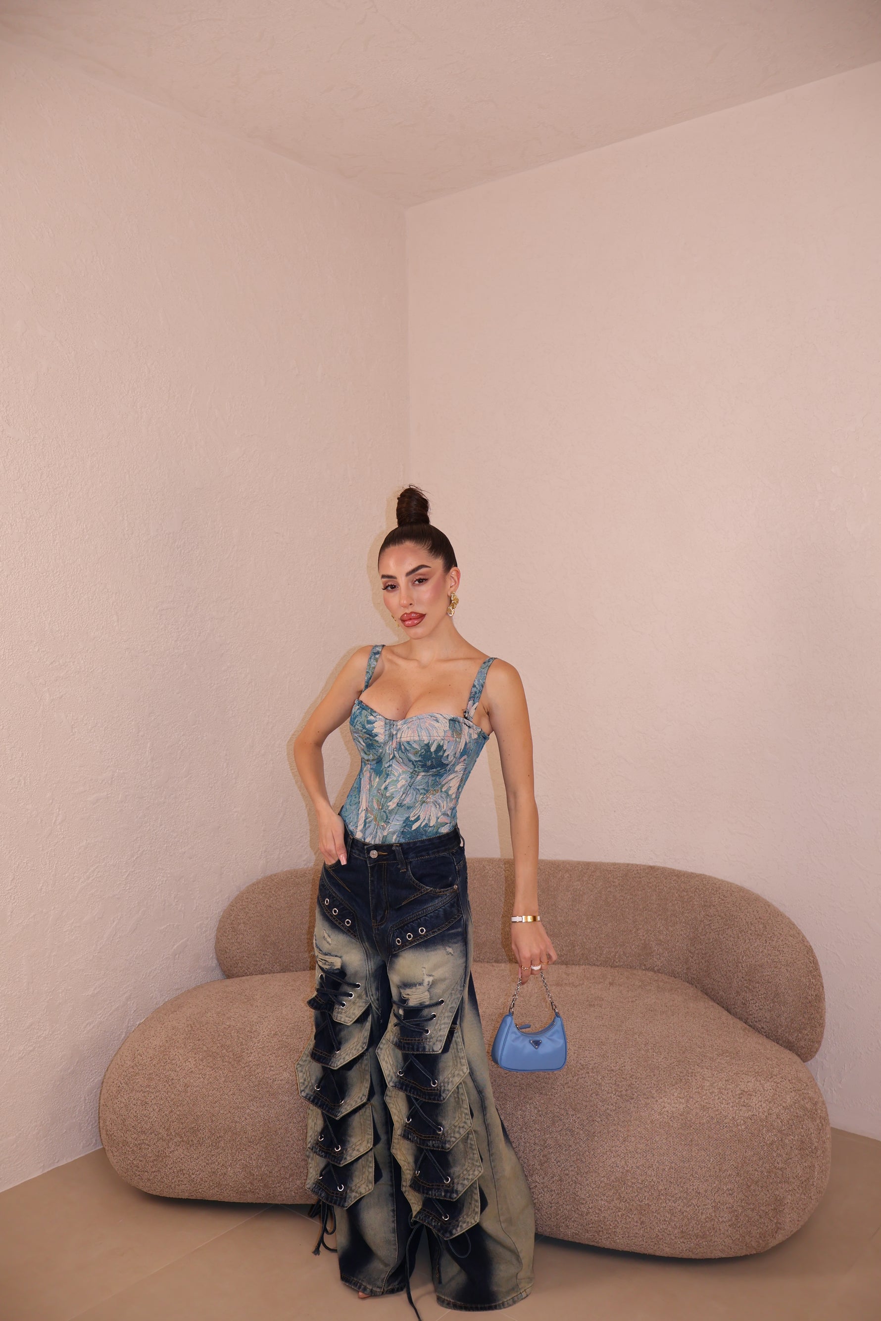 Jeans dritti con dettagli stringhe frontali e sfumature a constrasto. Vestibilità regolare. La modella indossa taglia S.