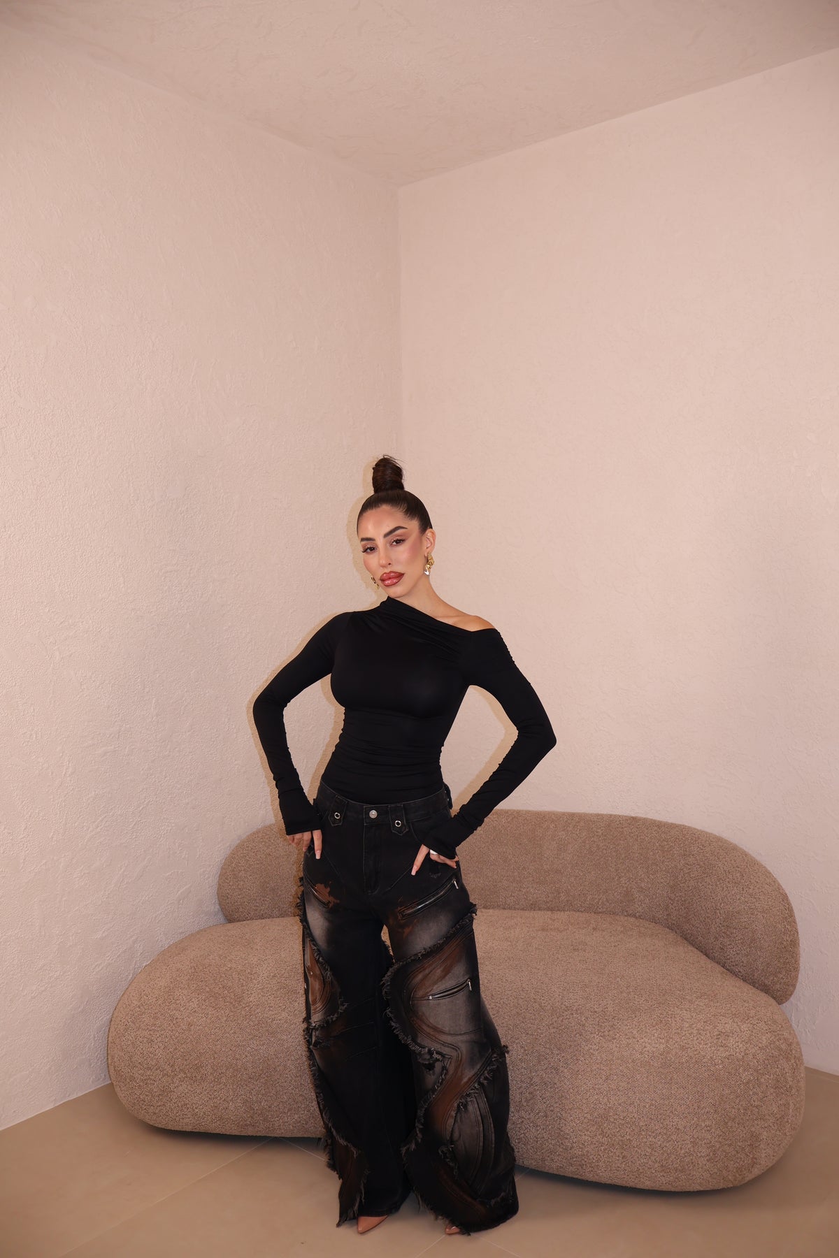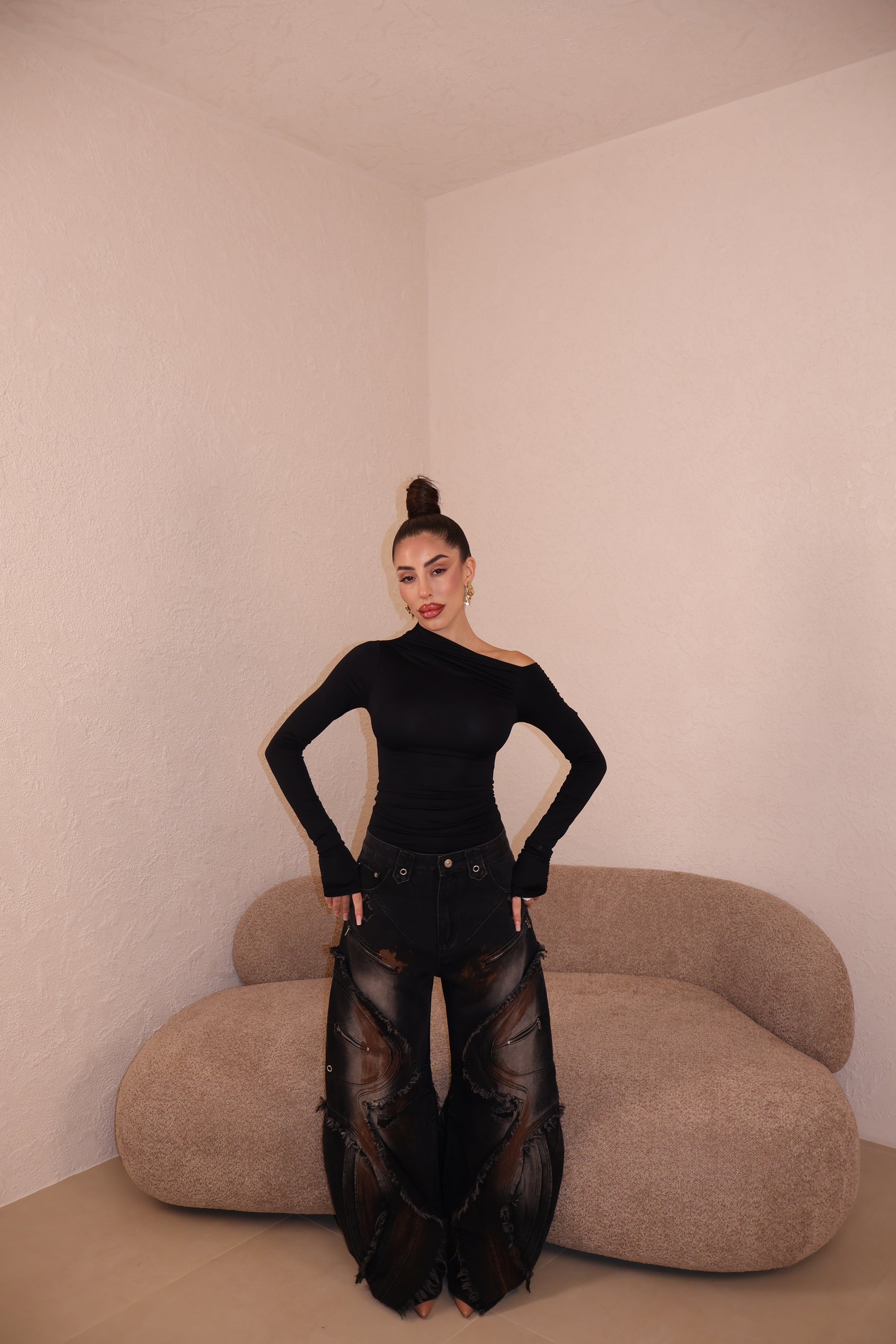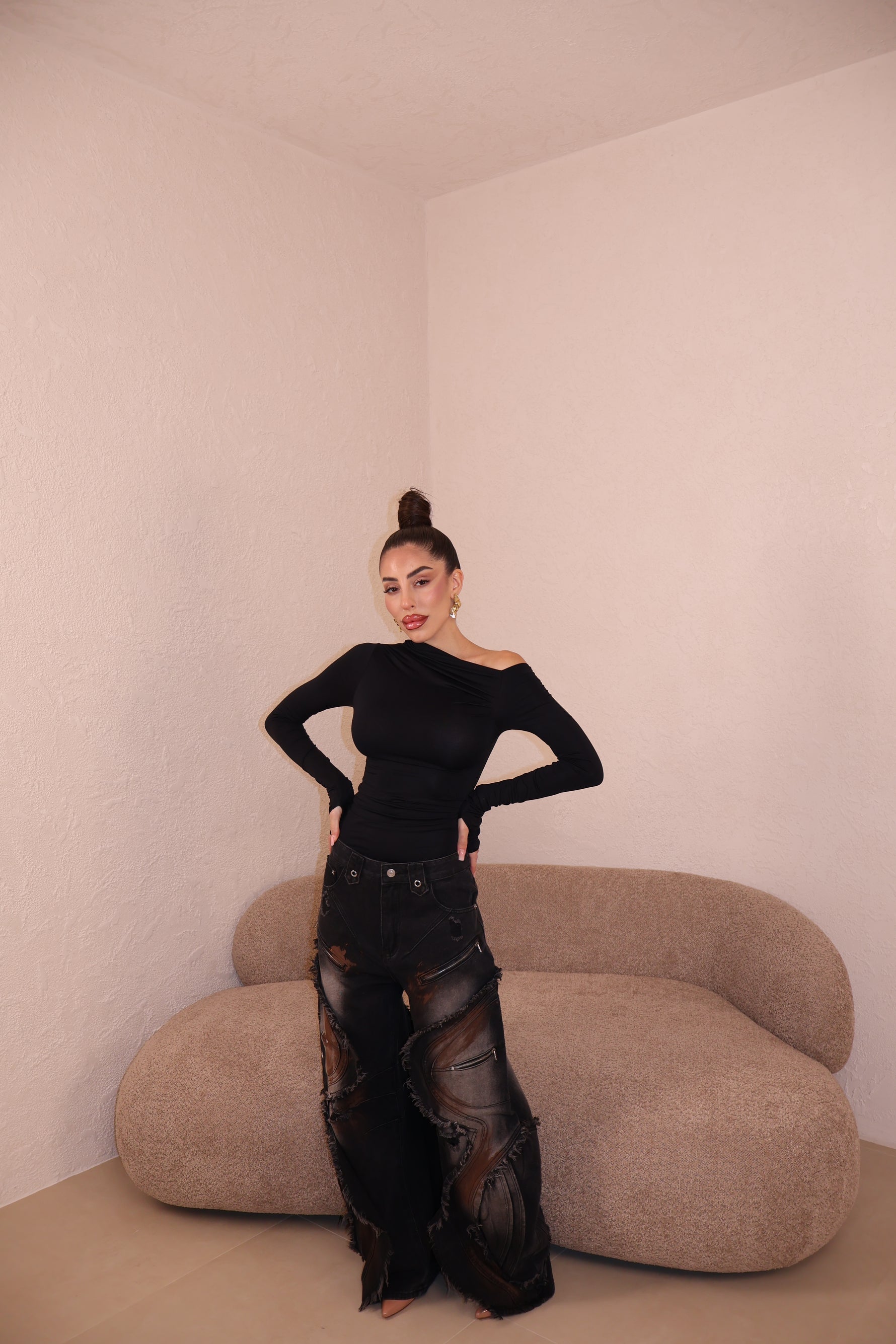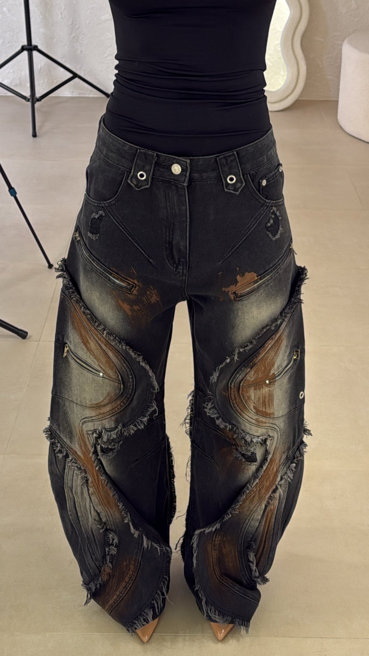 Jeans modello balloon con sfumature a contrasto e dettagli sfrangiati. Vestibilità regolare. La modella indossa taglia S.