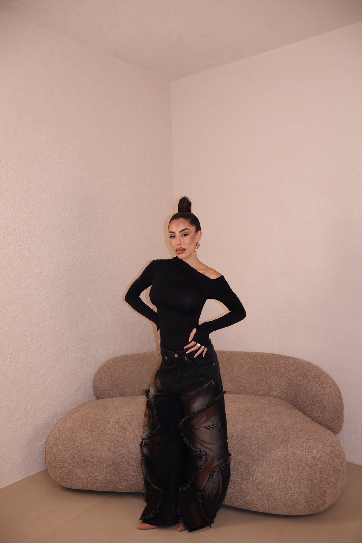 Prezzo unitario / perJeans modello balloon con sfumature a contrasto e dettagli sfrangiati. Vestibilità regolare. La modella indossa taglia S.